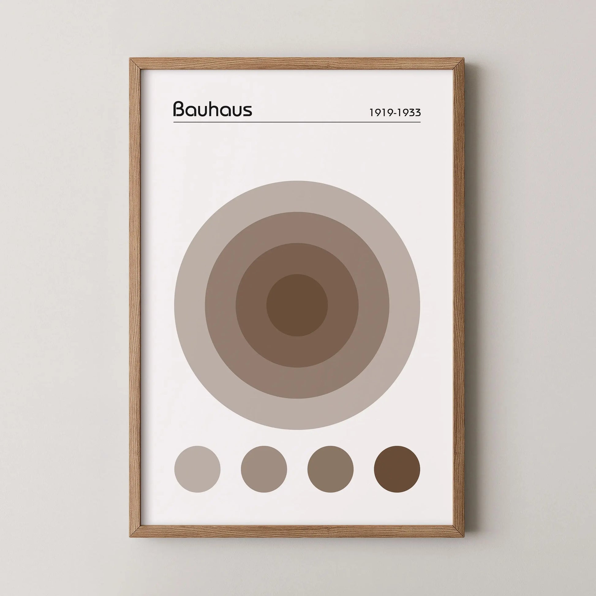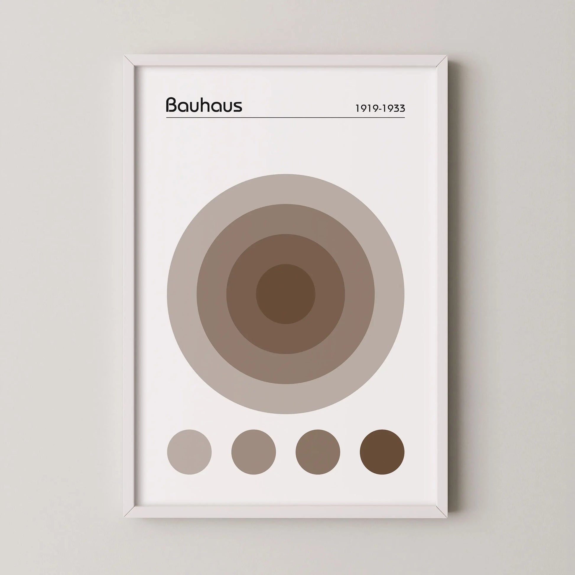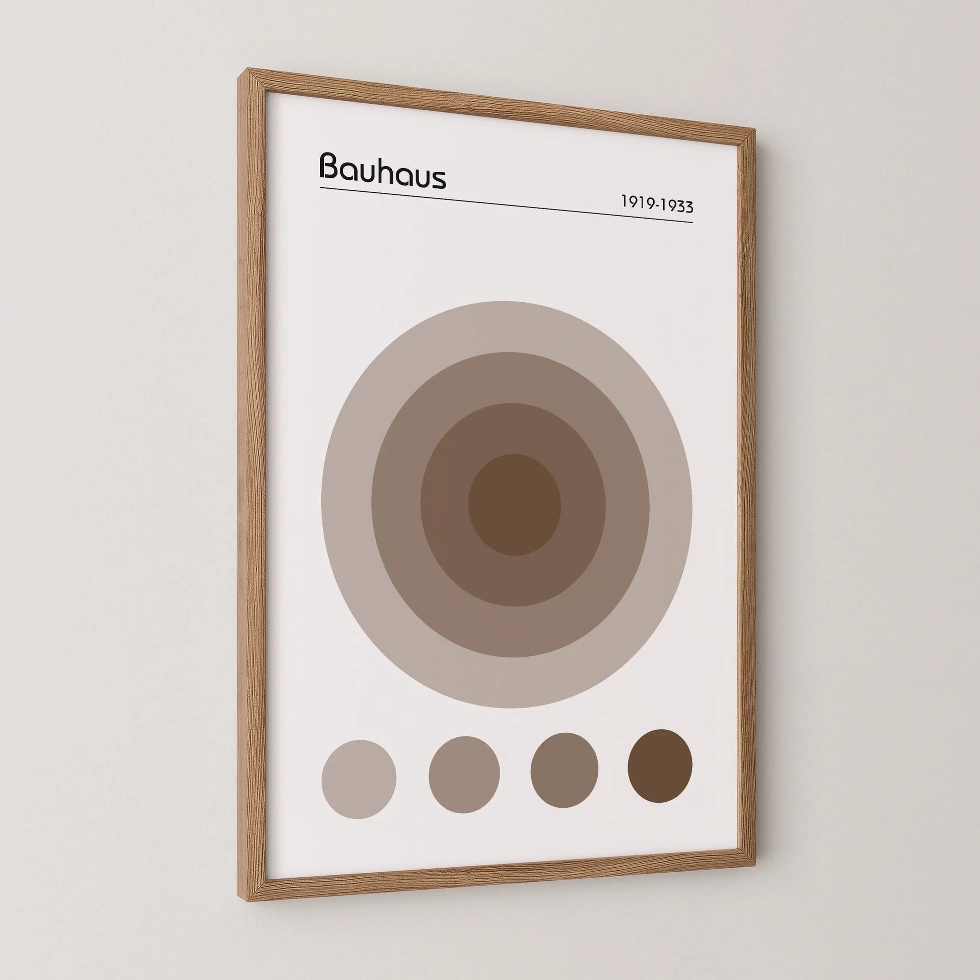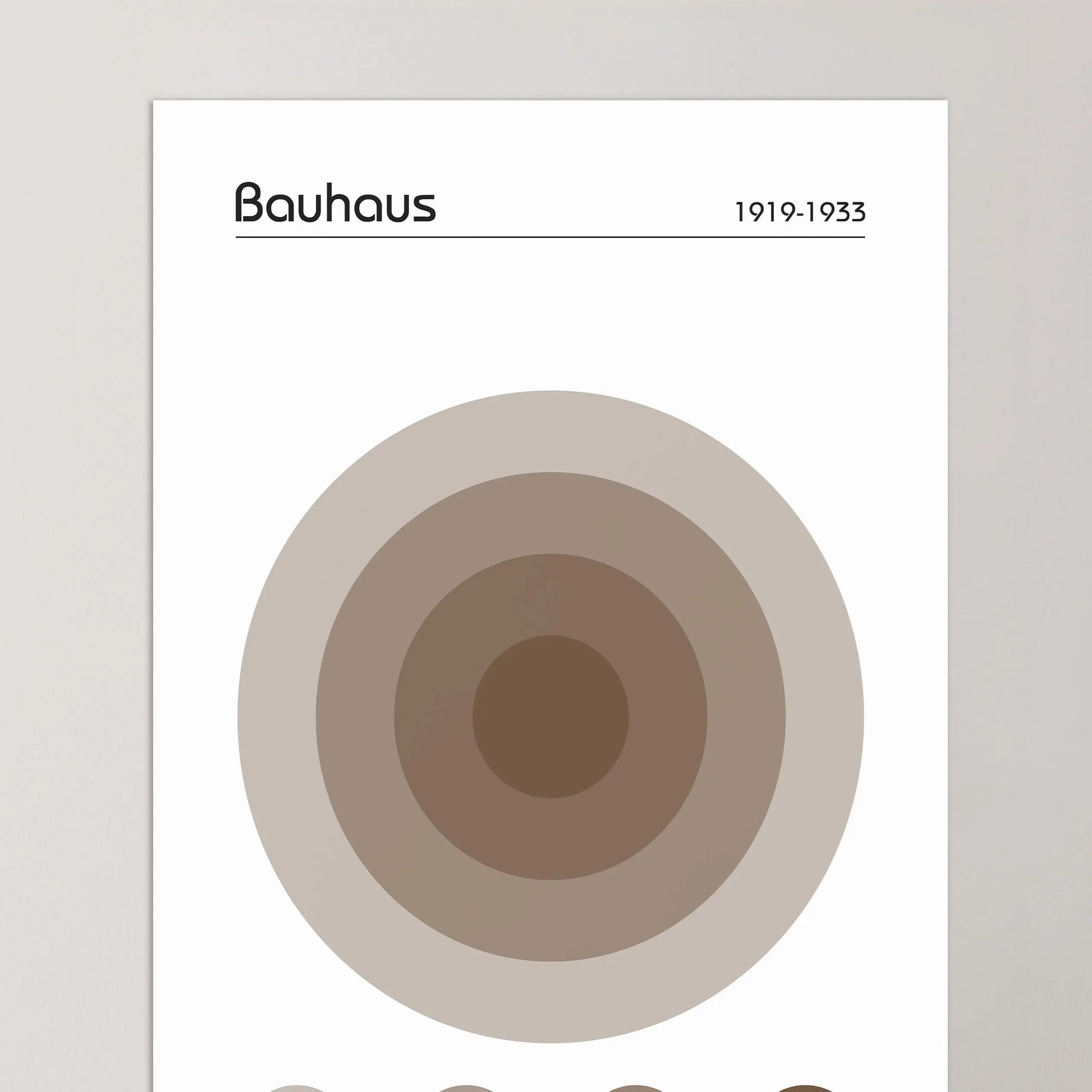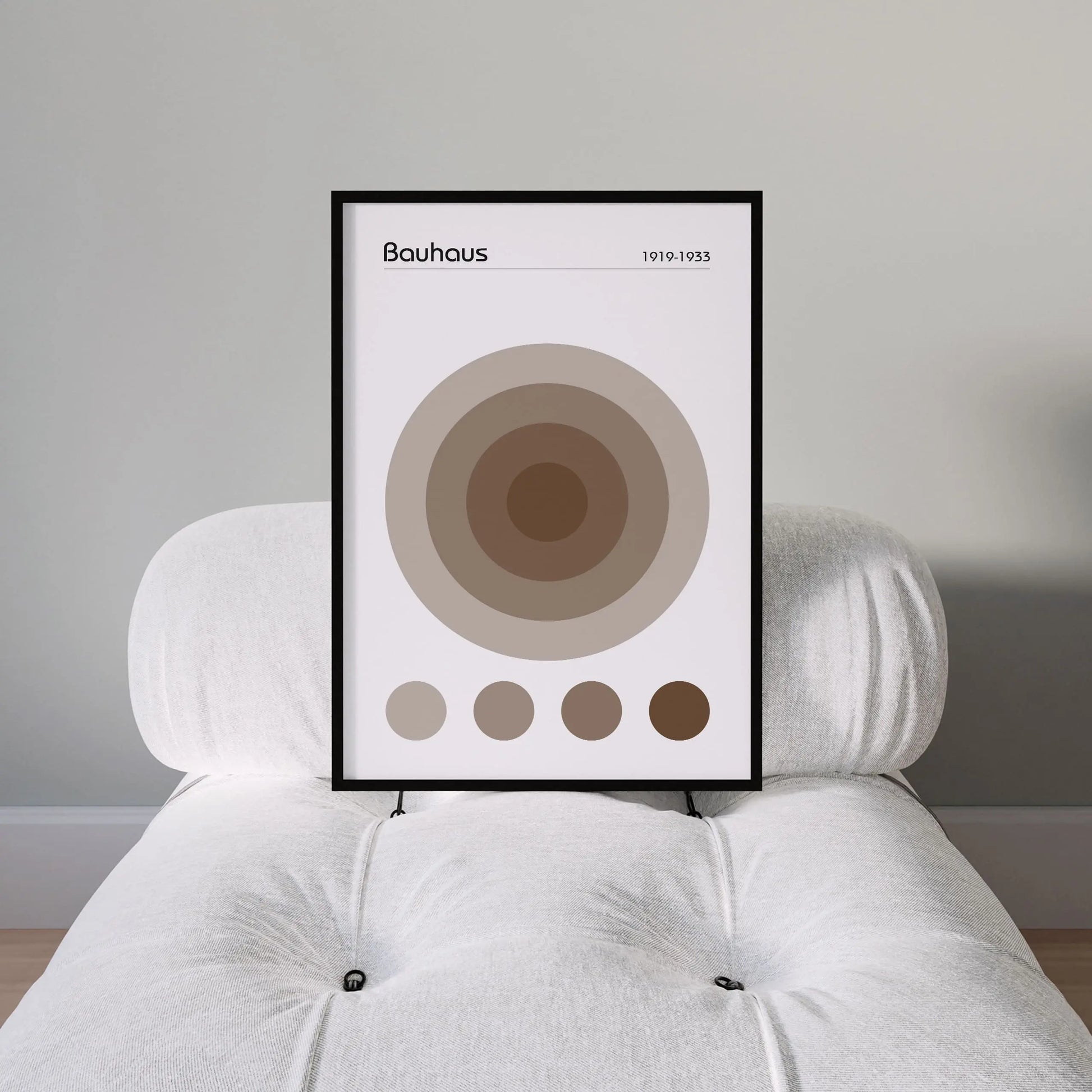Deze geometrische Bauhaus‑poster in bruine kleur toont een genuanceerde geometrische compositie, bestaande uit een reeks concentrische cirkels in het midden. Onder dit hoofdmotief bevinden zich vier kleine, uitgelijnde cirkels die dezelfde tinten herhalen.