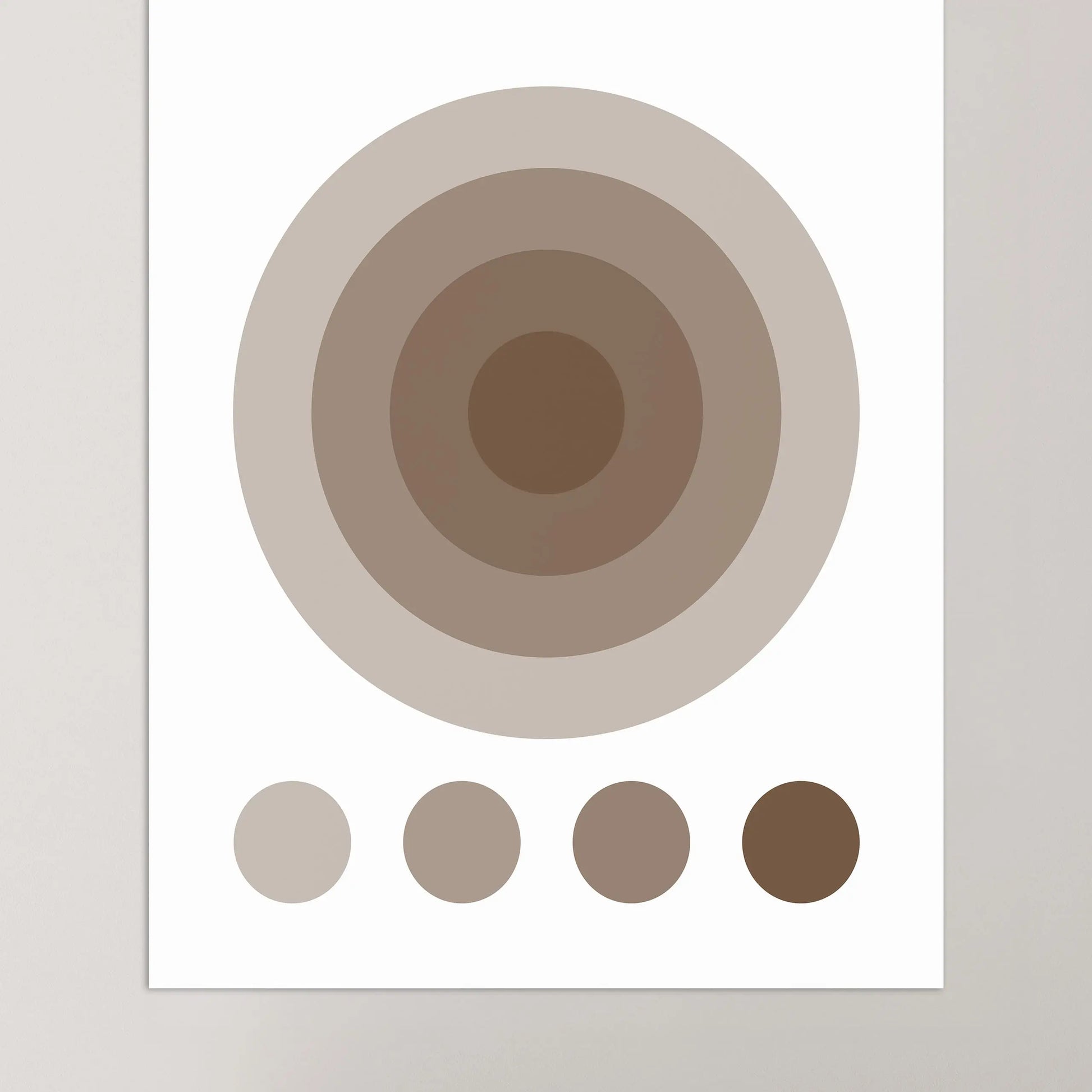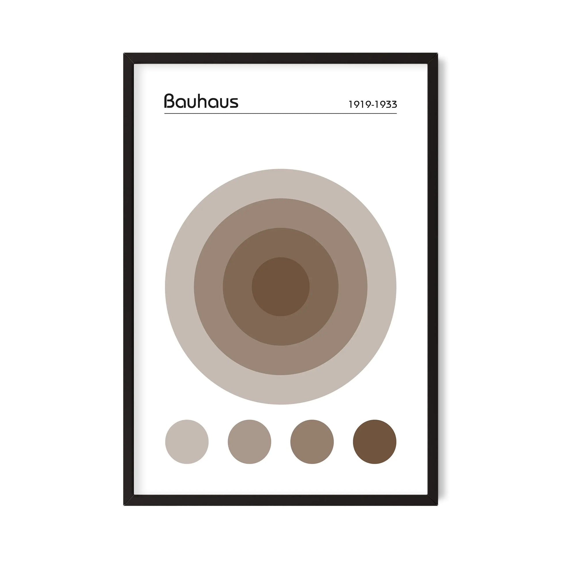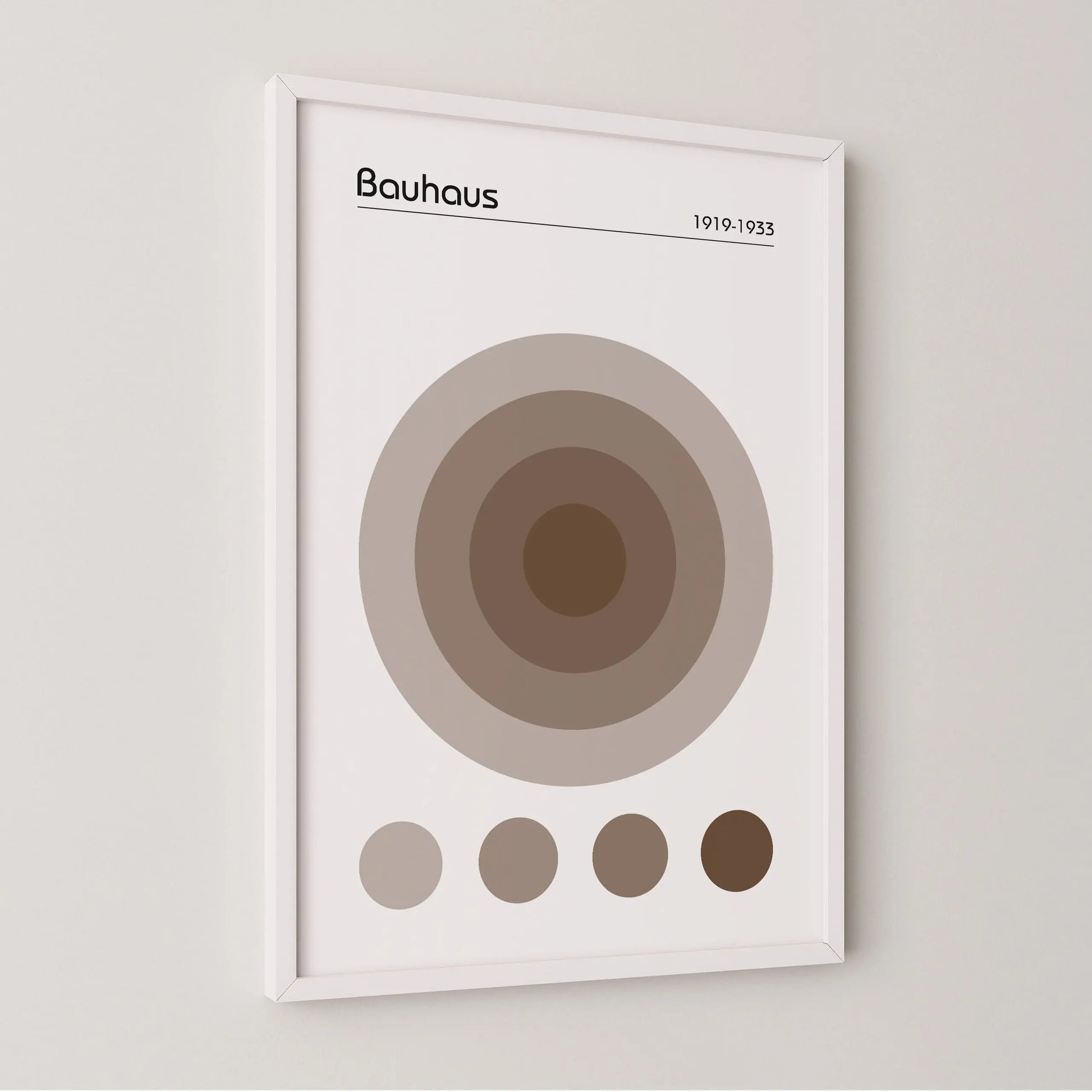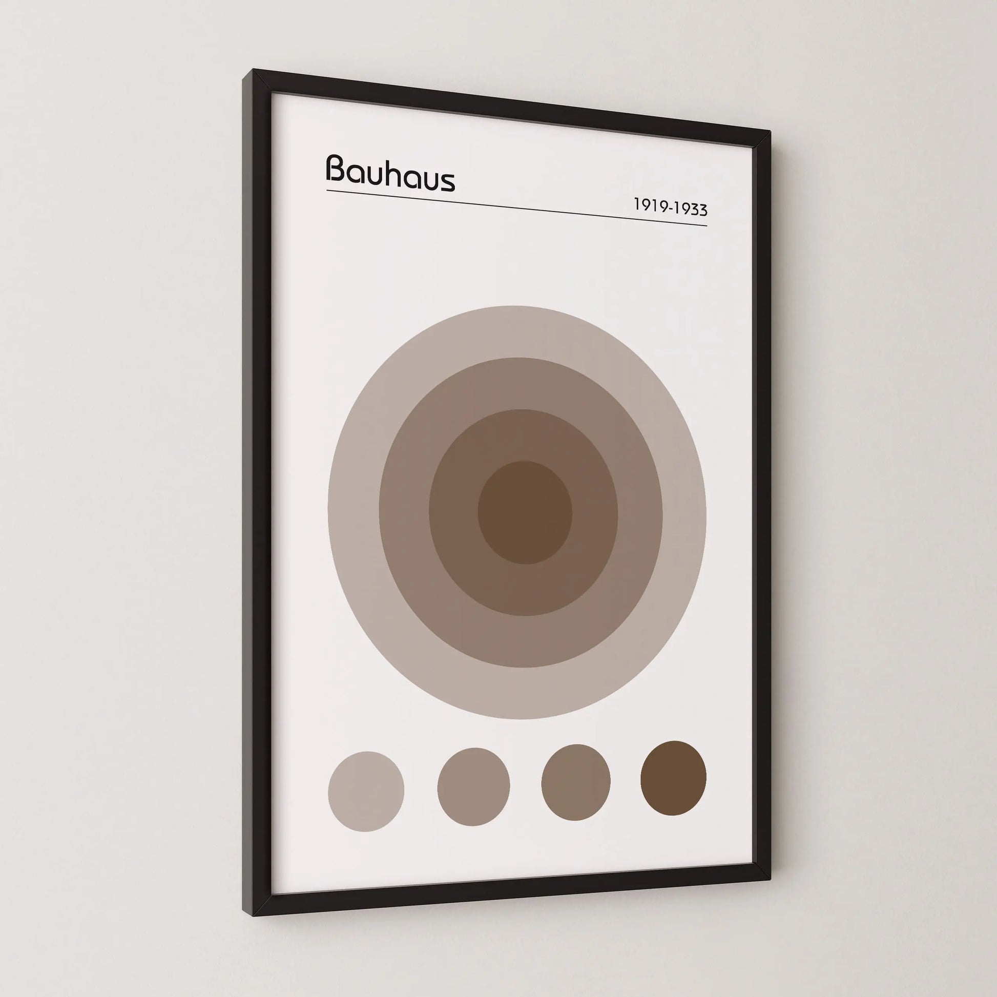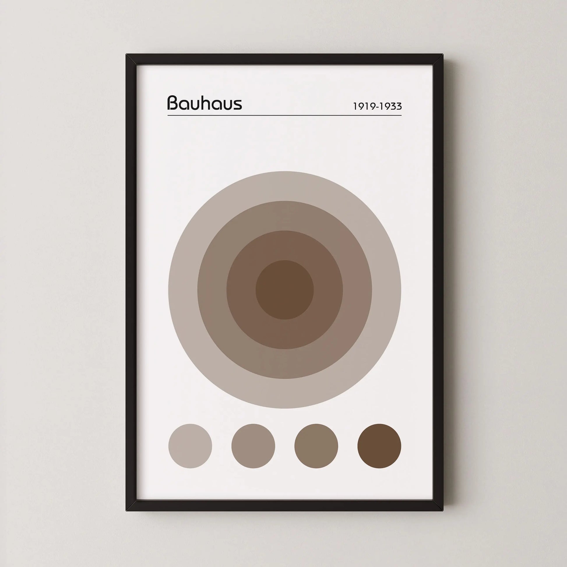 Deze geometrische Bauhaus‑poster in bruine kleur toont een genuanceerde geometrische compositie, bestaande uit een reeks concentrische cirkels in het midden. Onder dit hoofdmotief bevinden zich vier kleine, uitgelijnde cirkels die dezelfde tinten herhalen.