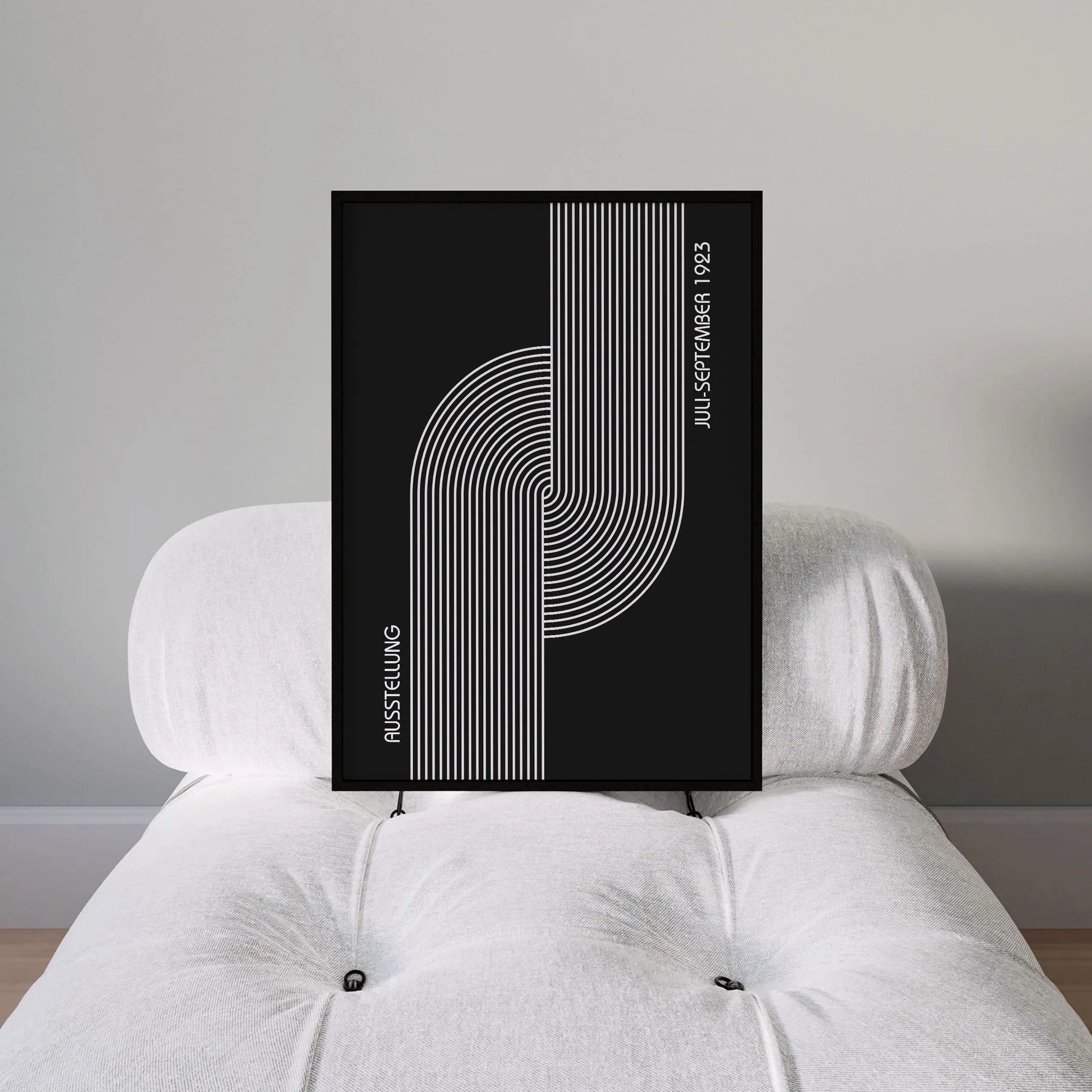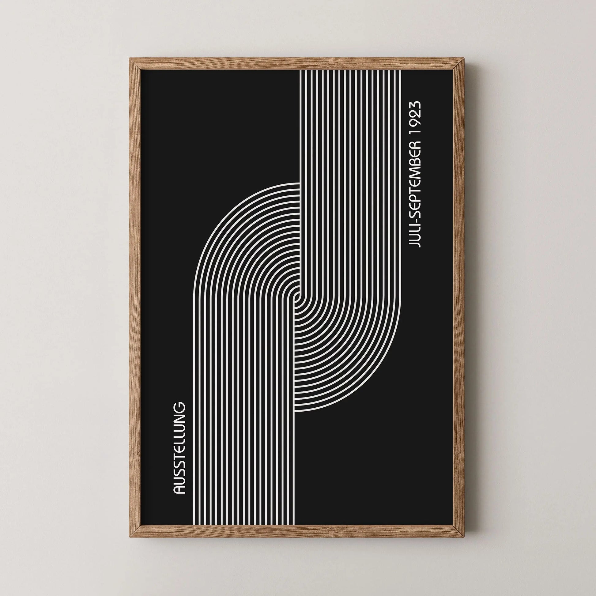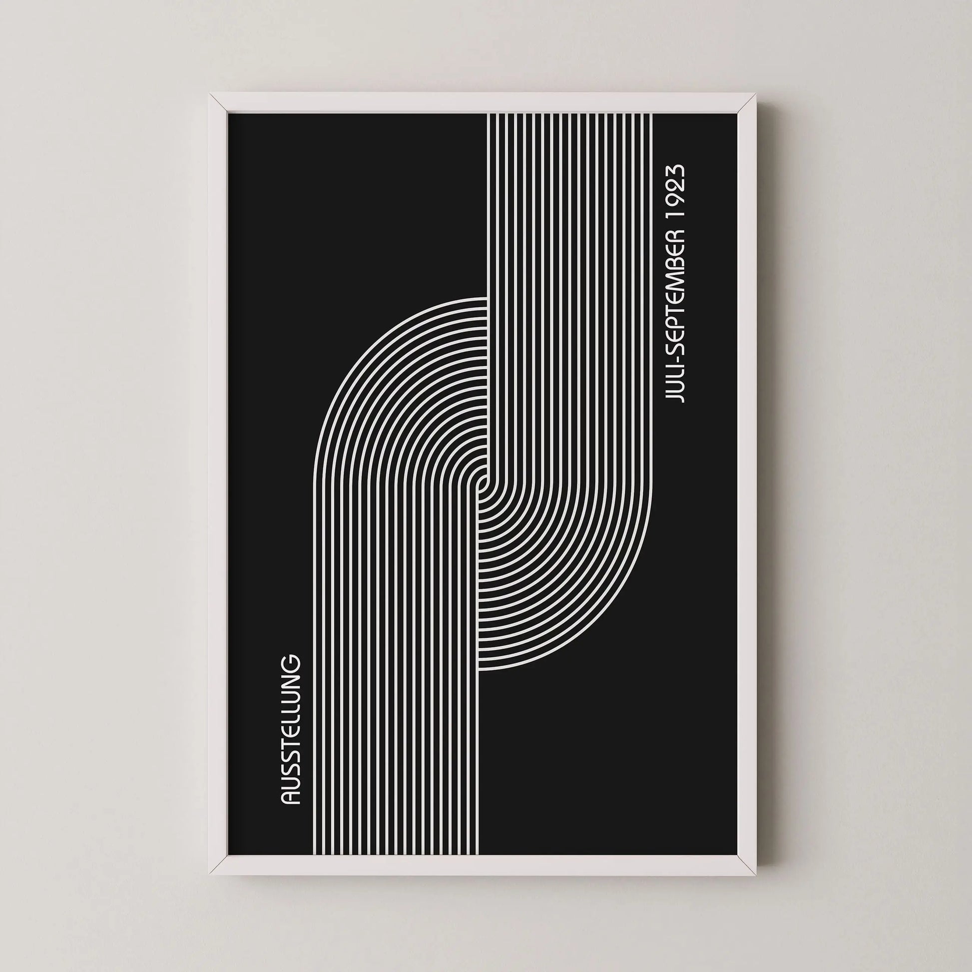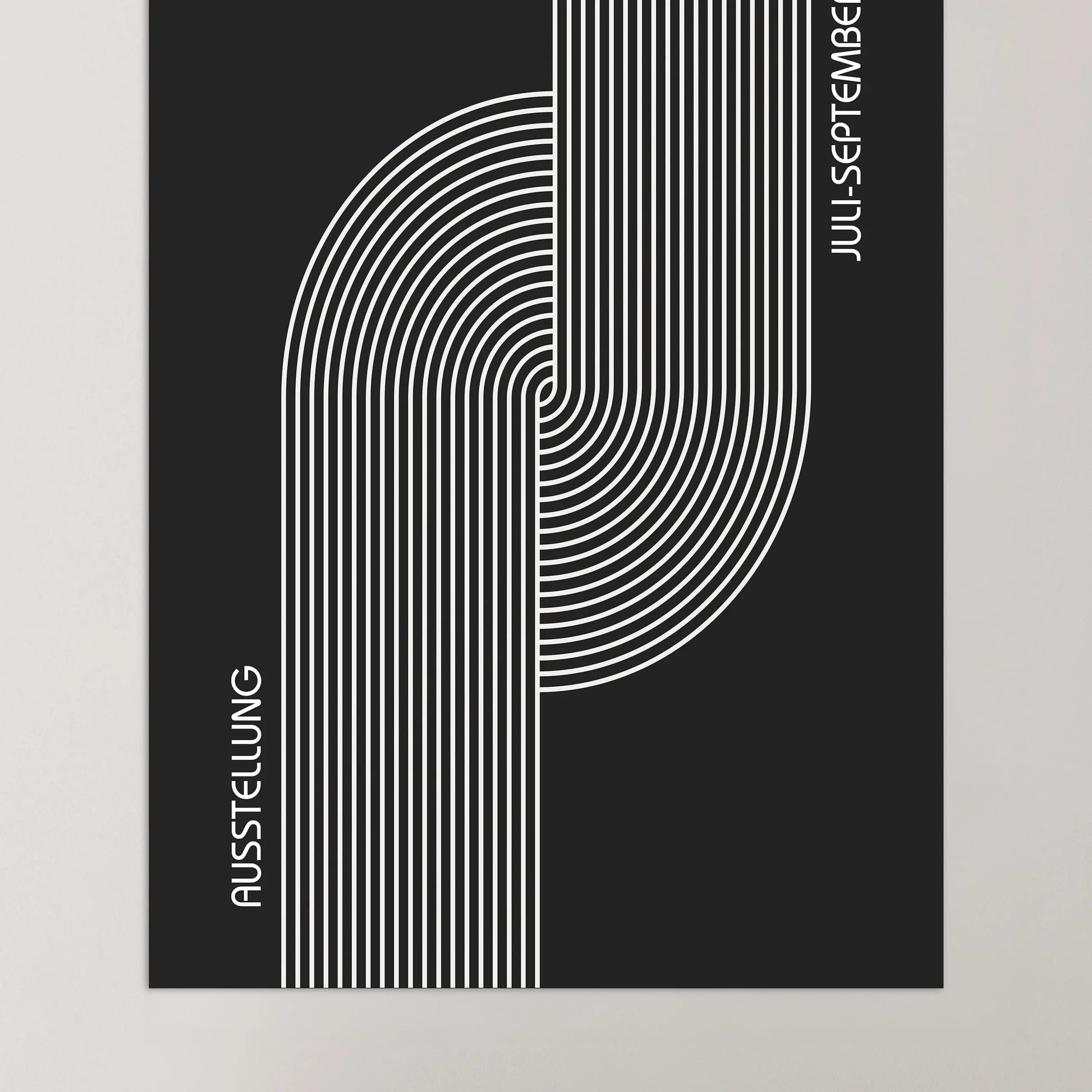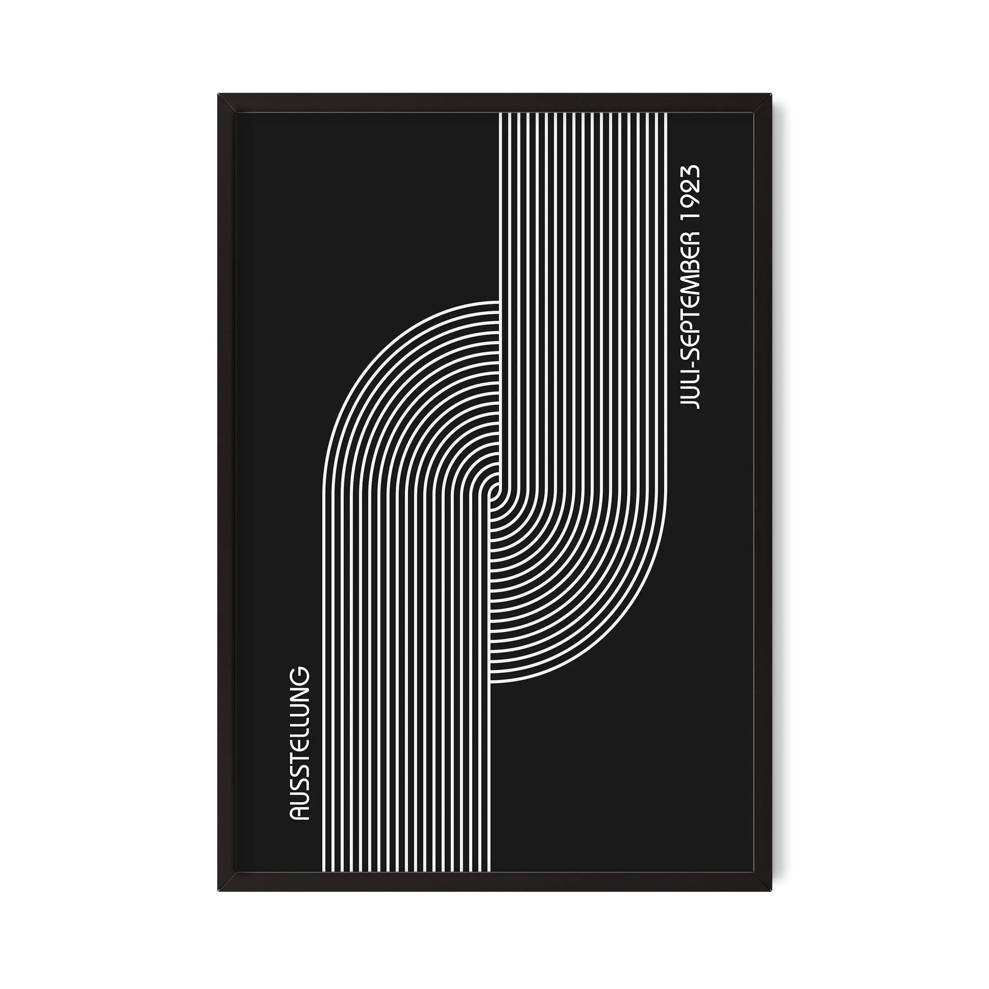 Deze minimalistische Bauhaus-vintageposter bestaat uit fijne, regelmatige parallelle lijnen die langs een verticale as zijn geplaatst. Deze lijnen verlengen zich en buigen in het midden om een afgeronde lus te vormen, waarbij rechte segmenten en concentrische bogen worden gecombineerd. Het geheel vormt een gestructureerde en continue compositie, met een duidelijk contrast tussen de egale achtergrond en de lineaire tekening, waardoor de geometrische precisie en het visuele ritme worden benadrukt.