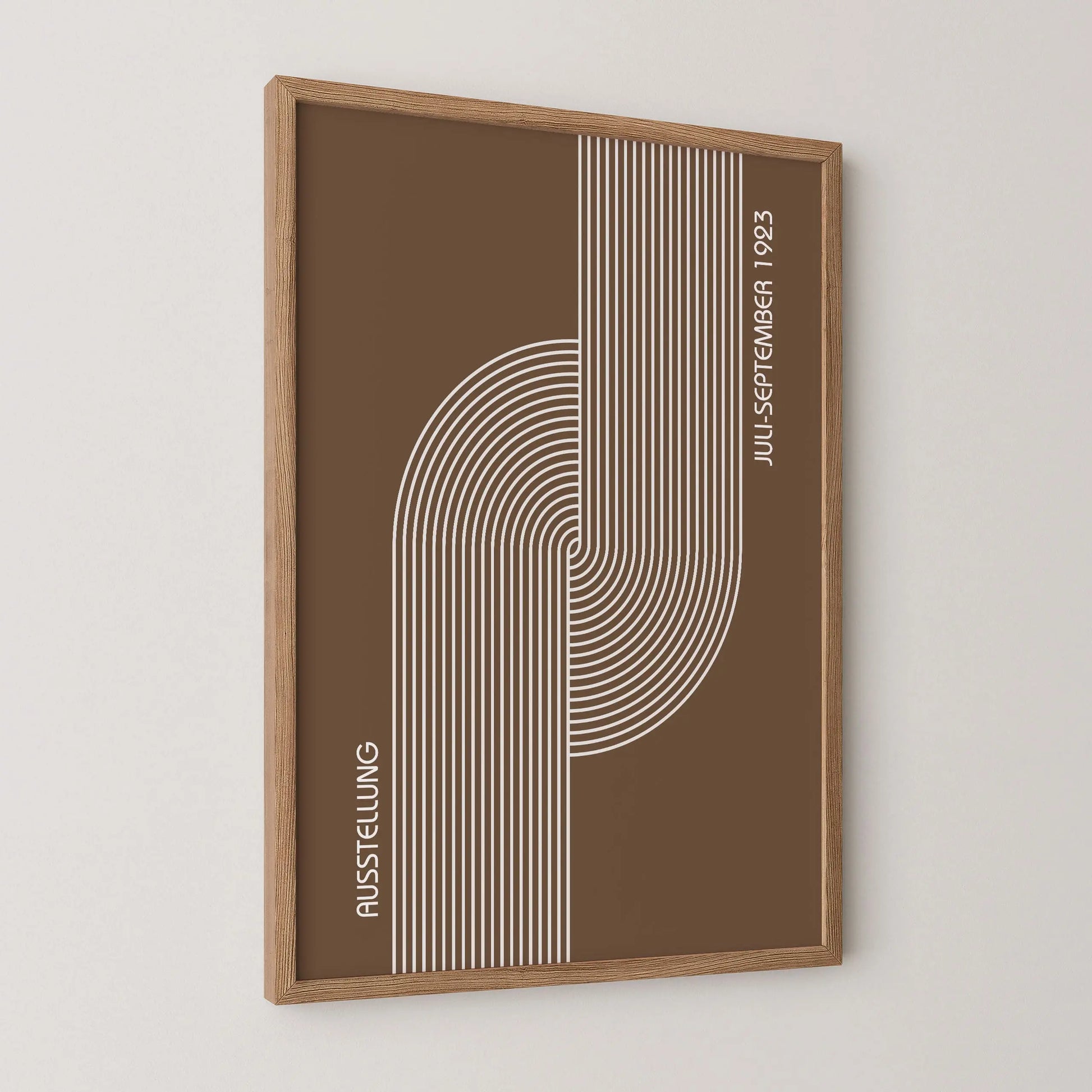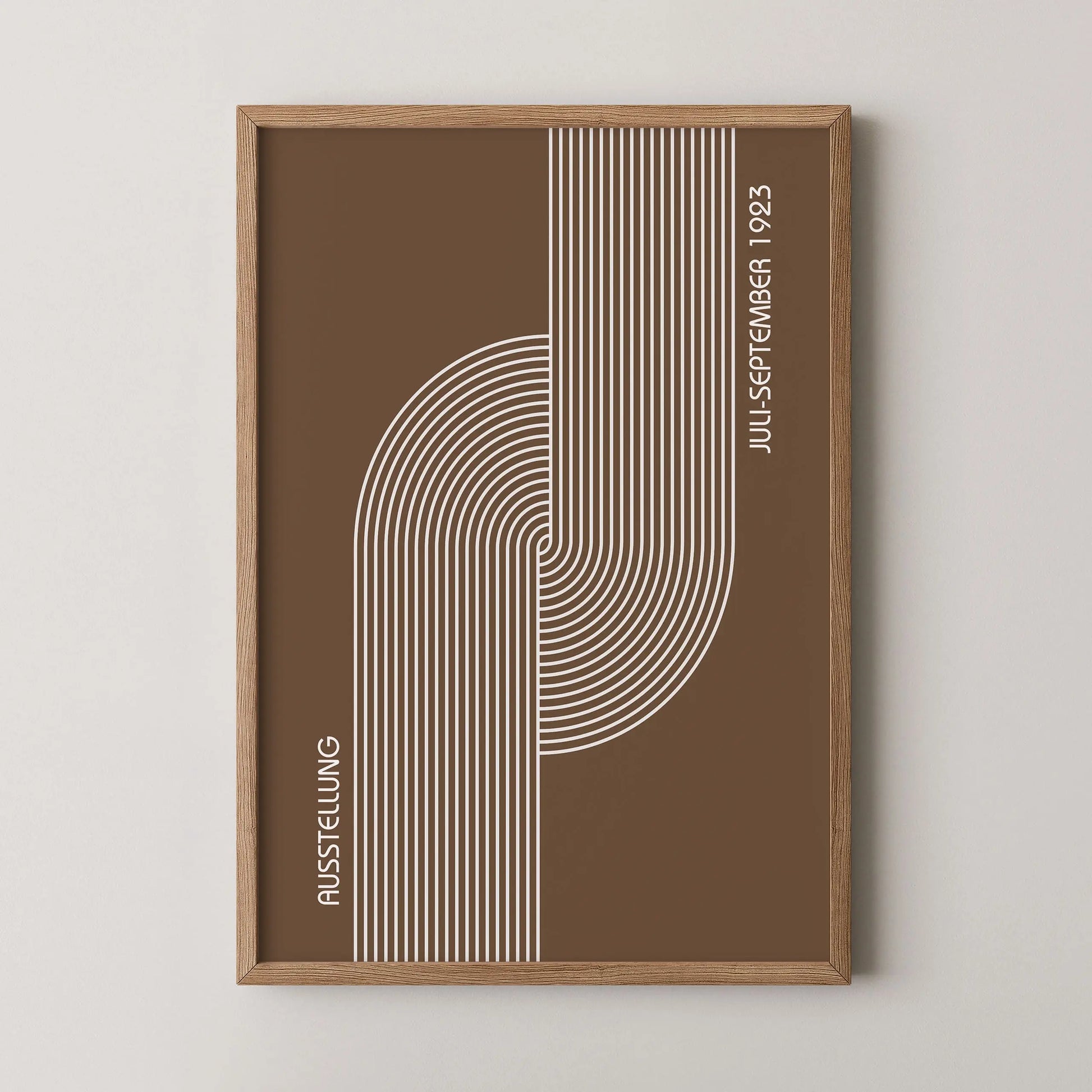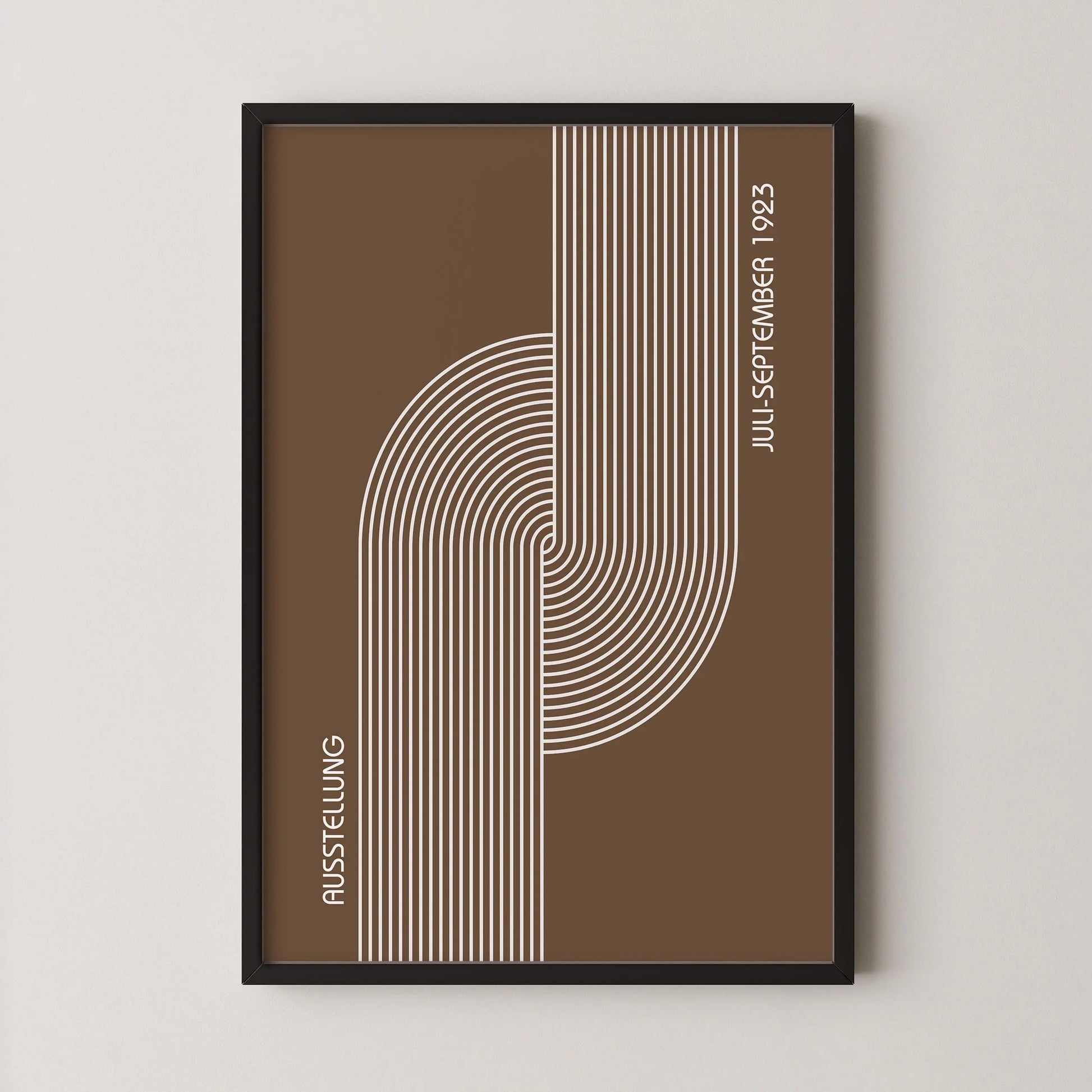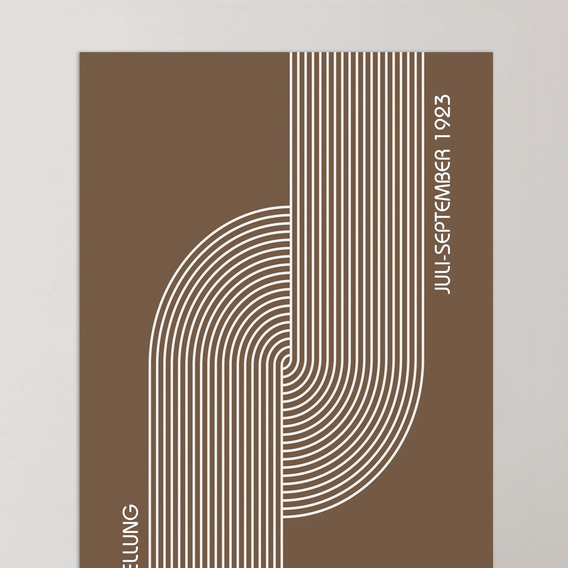 Deze minimalistische Bauhaus-vintageposter bestaat uit fijne, regelmatige parallelle lijnen die langs een verticale as zijn geplaatst. Deze lijnen verlengen zich en buigen in het midden om een afgeronde lus te vormen, waarbij rechte segmenten en concentrische bogen worden gecombineerd. Het geheel vormt een gestructureerde en continue compositie, met een duidelijk contrast tussen de egale achtergrond en de lineaire tekening, waardoor de geometrische precisie en het visuele ritme worden benadrukt.