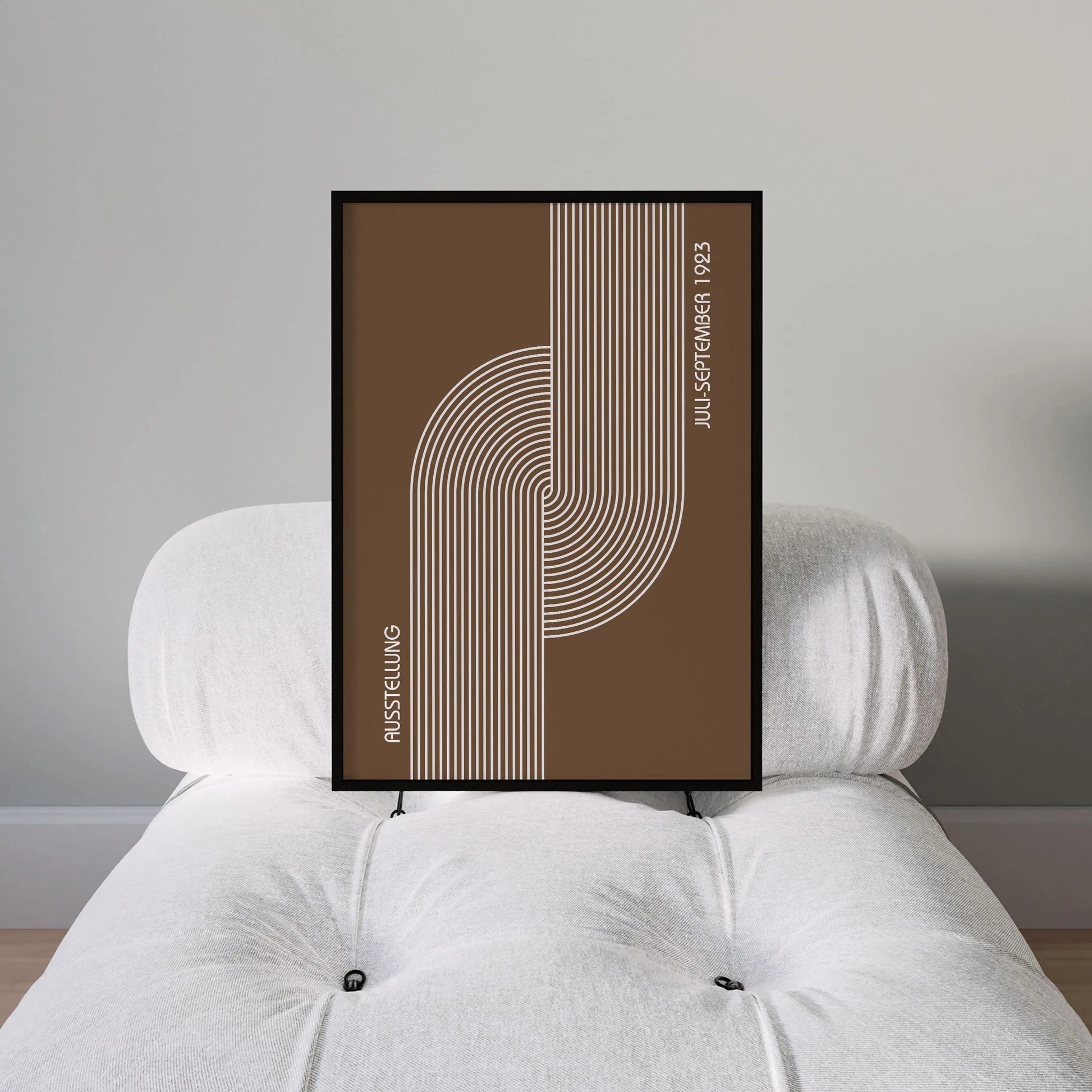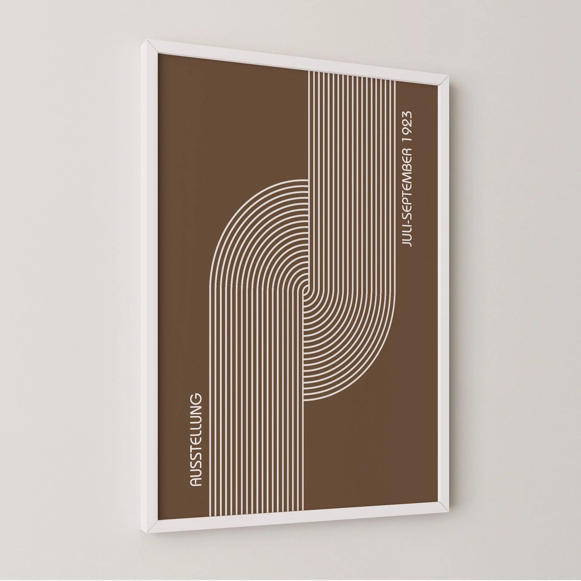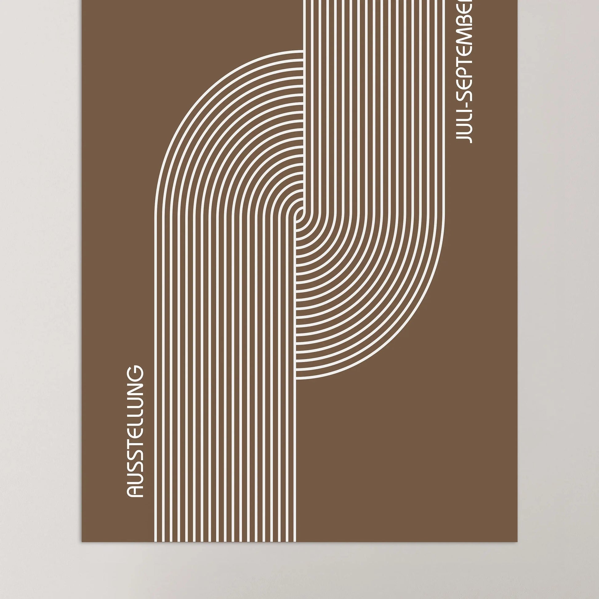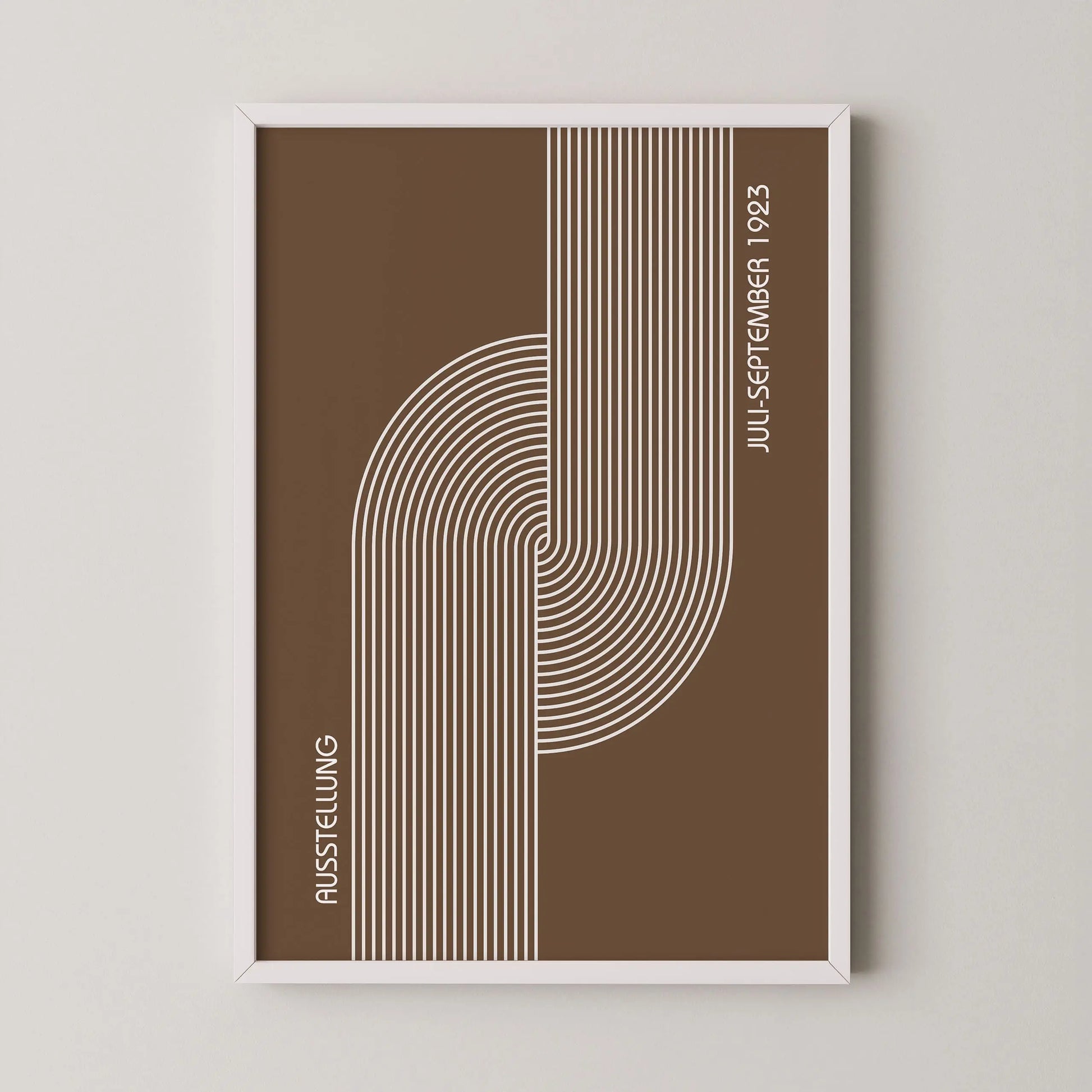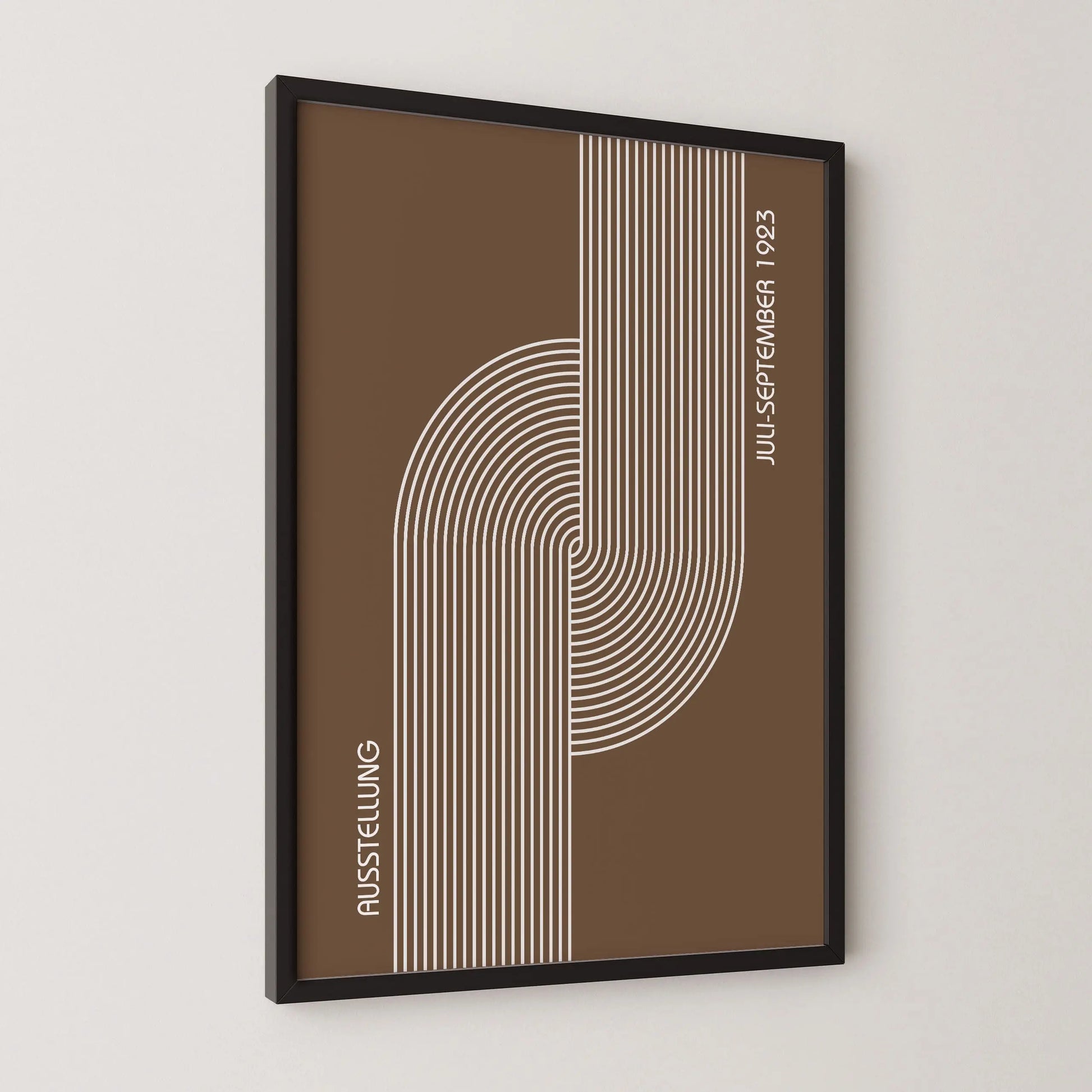 Deze minimalistische Bauhaus-vintageposter bestaat uit fijne, regelmatige parallelle lijnen die langs een verticale as zijn geplaatst. Deze lijnen verlengen zich en buigen in het midden om een afgeronde lus te vormen, waarbij rechte segmenten en concentrische bogen worden gecombineerd. Het geheel vormt een gestructureerde en continue compositie, met een duidelijk contrast tussen de egale achtergrond en de lineaire tekening, waardoor de geometrische precisie en het visuele ritme worden benadrukt.