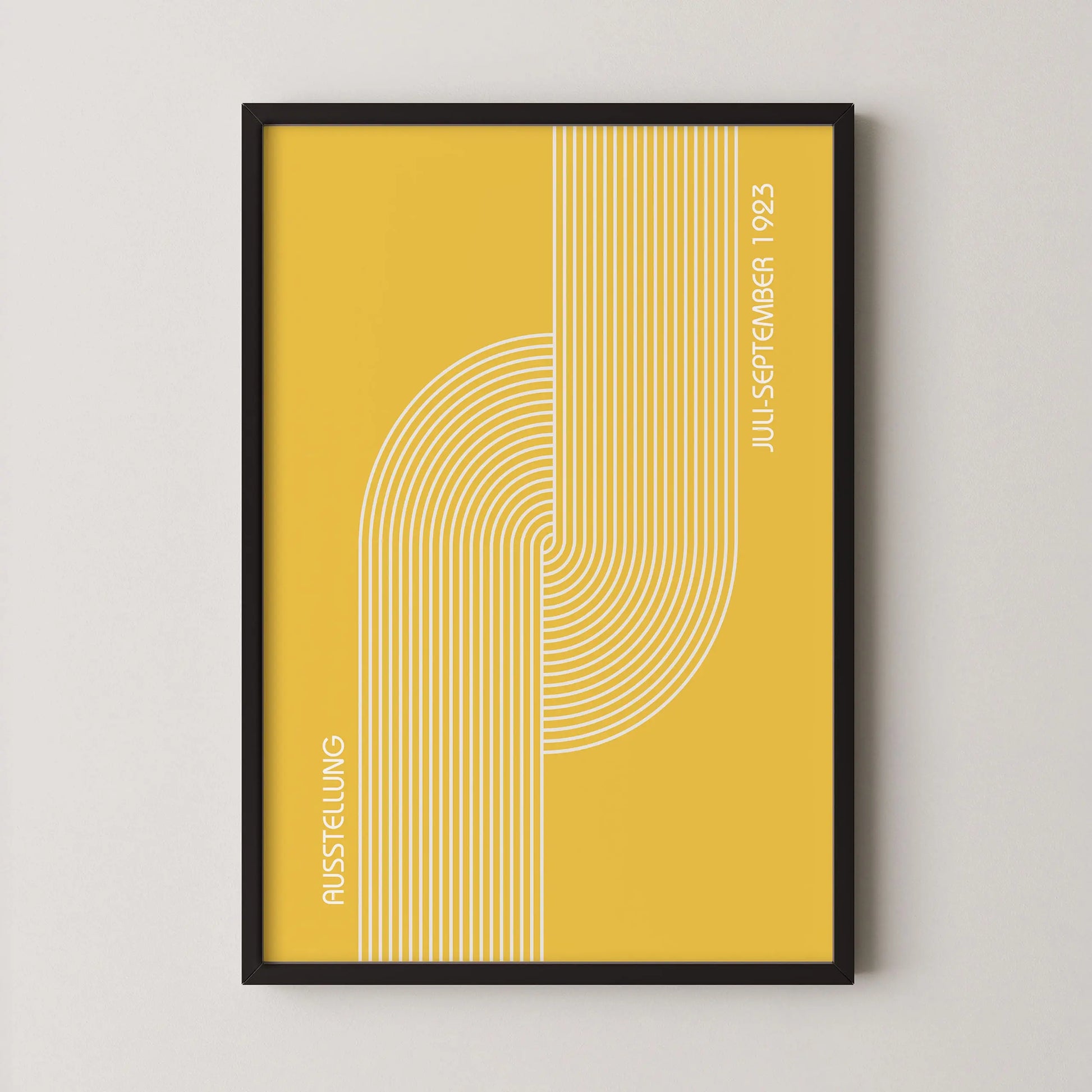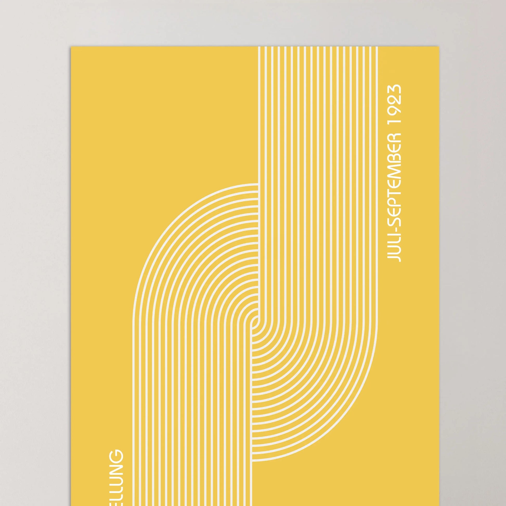 Deze minimalistische Bauhaus-vintageposter bestaat uit fijne, regelmatige parallelle lijnen die langs een verticale as zijn geplaatst. Deze lijnen verlengen zich en buigen in het midden om een afgeronde lus te vormen, waarbij rechte segmenten en concentrische bogen worden gecombineerd. Het geheel vormt een gestructureerde en continue compositie, met een duidelijk contrast tussen de egale achtergrond en de lineaire tekening, waardoor de geometrische precisie en het visuele ritme worden benadrukt.