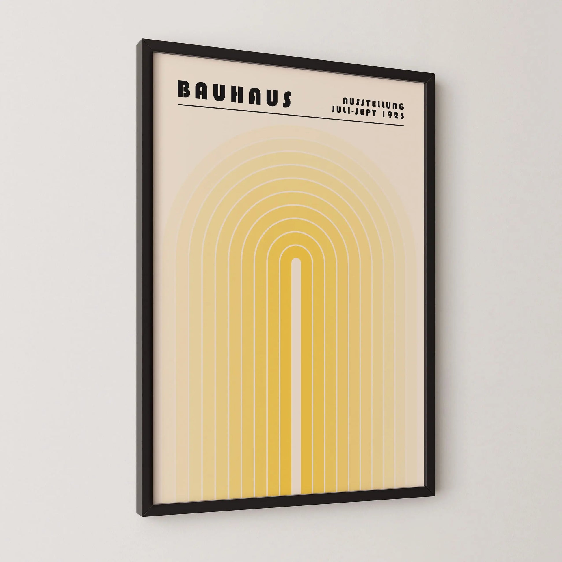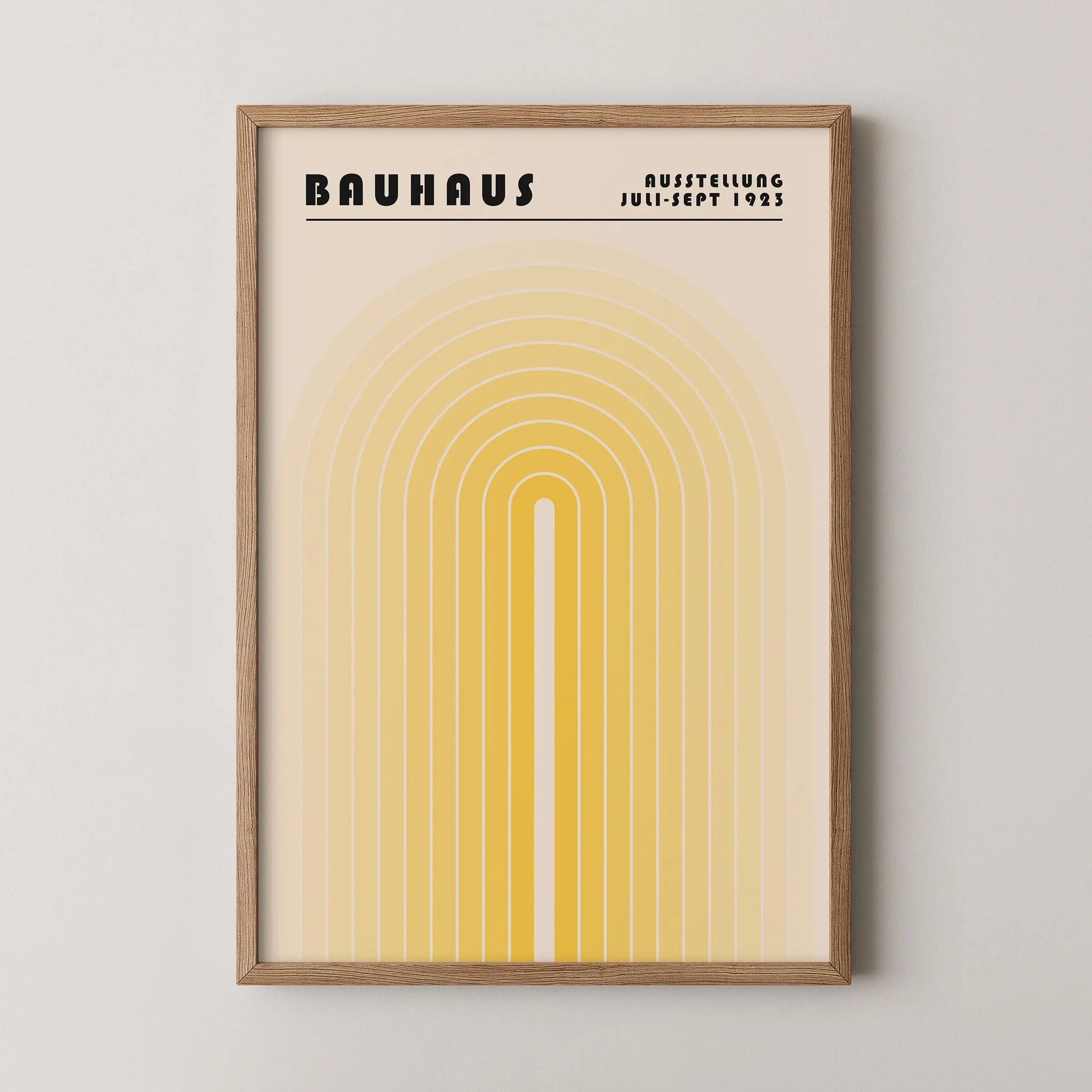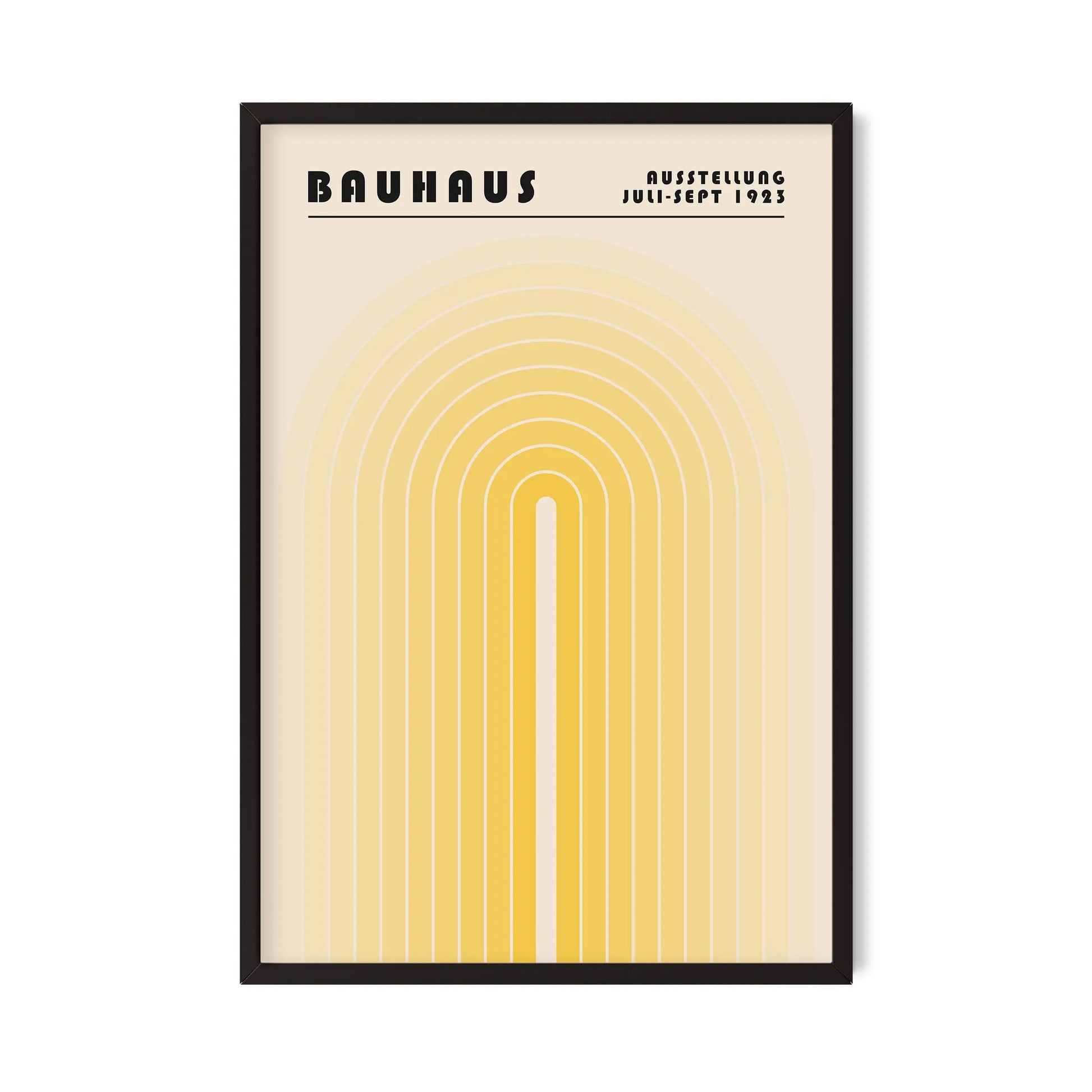 Deze vintage grafische Bauhaus-poster bestaat uit een reeks geometrische concentrische bogen, symmetrisch geplaatst rond een verticale as, die een unieke boogstructuur met een verlengde centrale opening vormen. De parallelle en regelmatige lijnen met geleidelijk verlopen tinten, van licht naar donker, creëren een evenwichtig visueel ritme en een gecontroleerde grafische diepte.