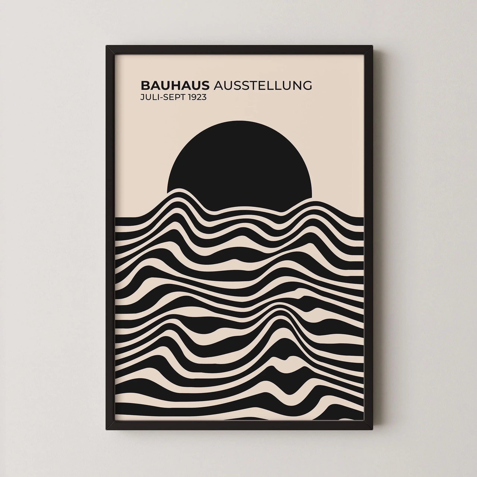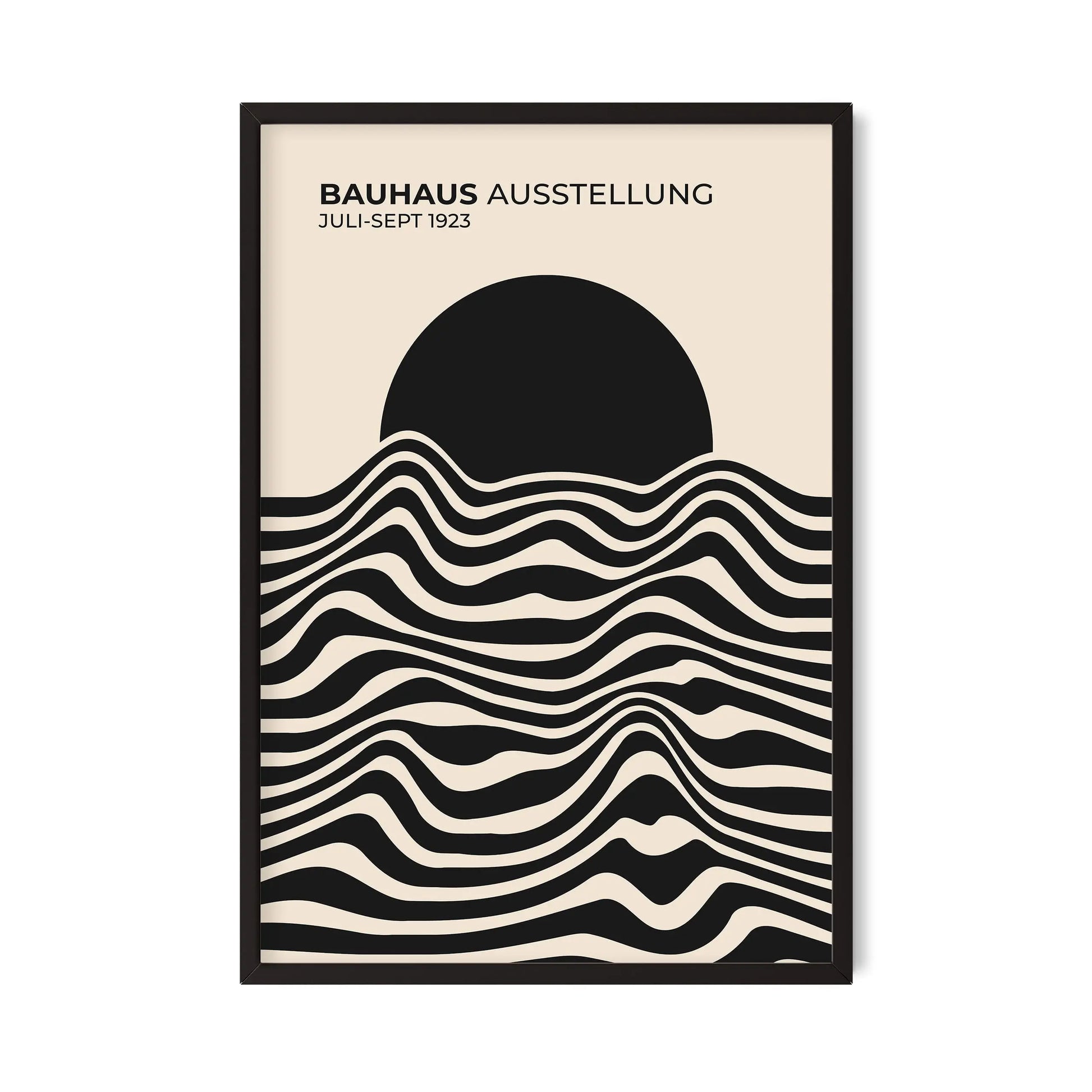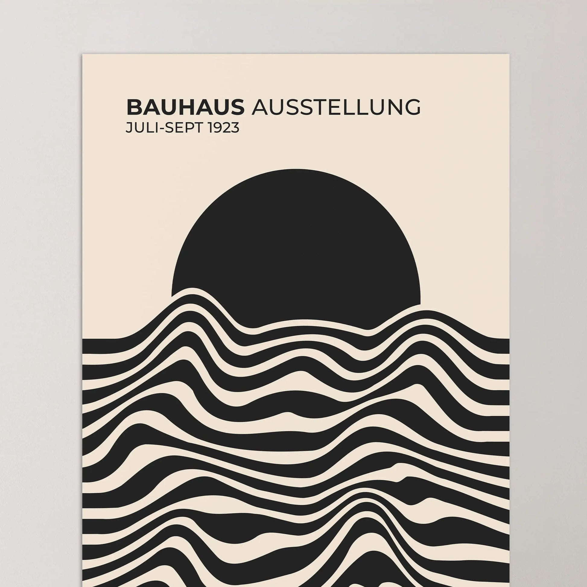 Cette affiche vintage Bauhaus est composée de lignes ondulées parallèles, alternant des aplats sombres et clairs, disposées horizontalement sur la partie inférieure. Ces lignes forment des courbes fluides et continues, créant un rythme visuel régulier. La partie supérieure est occupée par un disque plein, partiellement superposé aux lignes, établissant un contraste net entre formes organiques et géométrie simple.