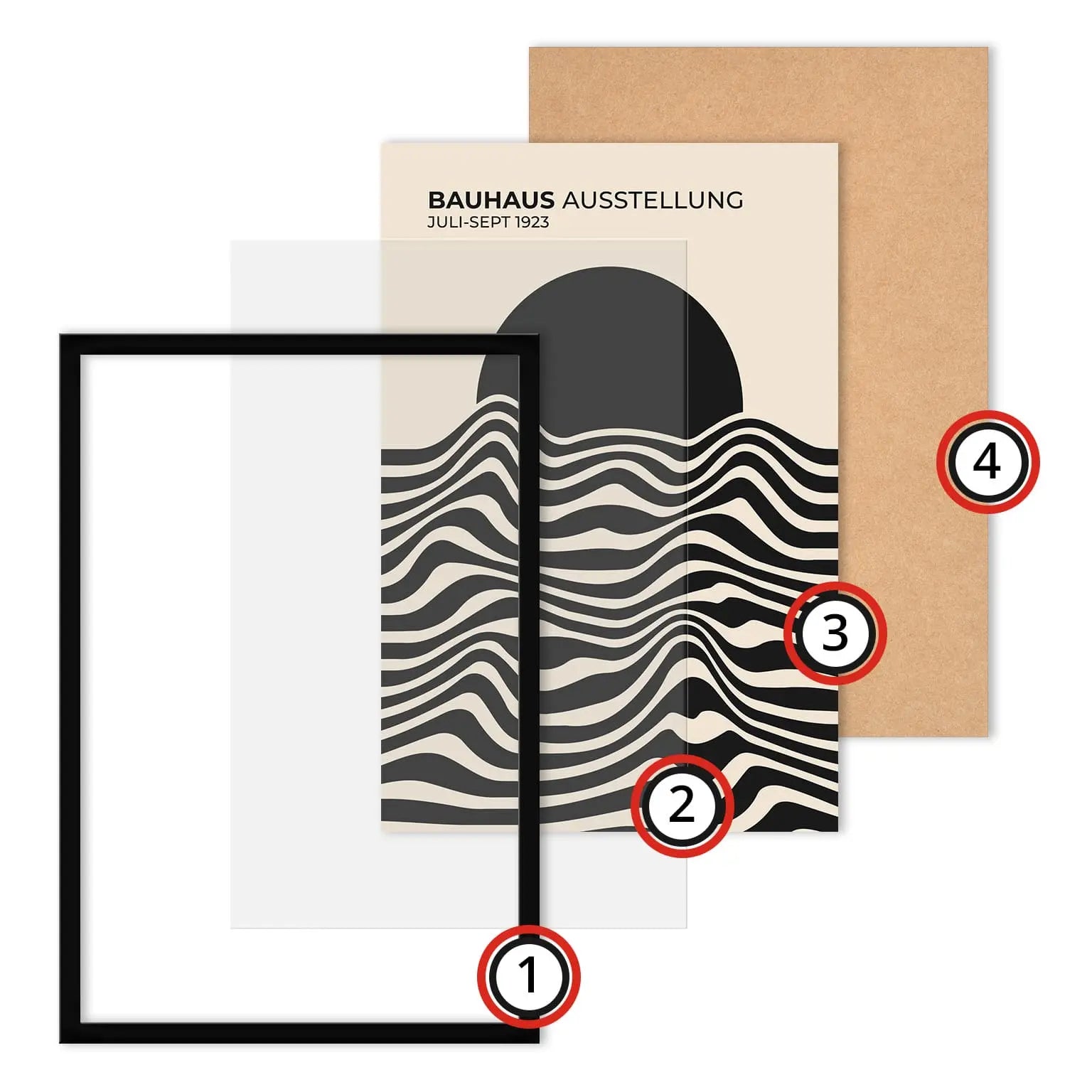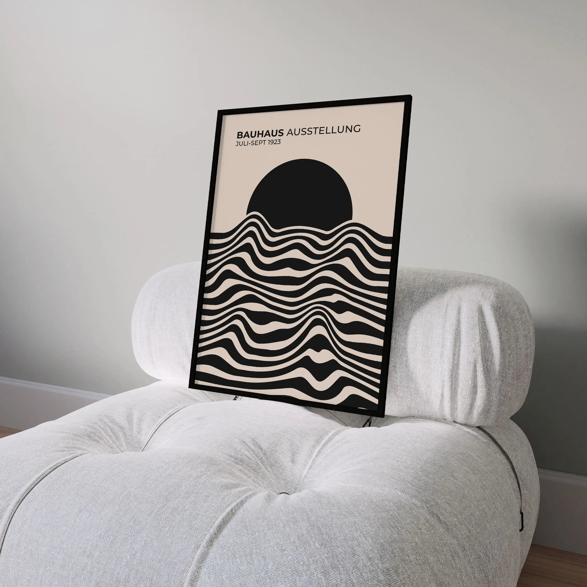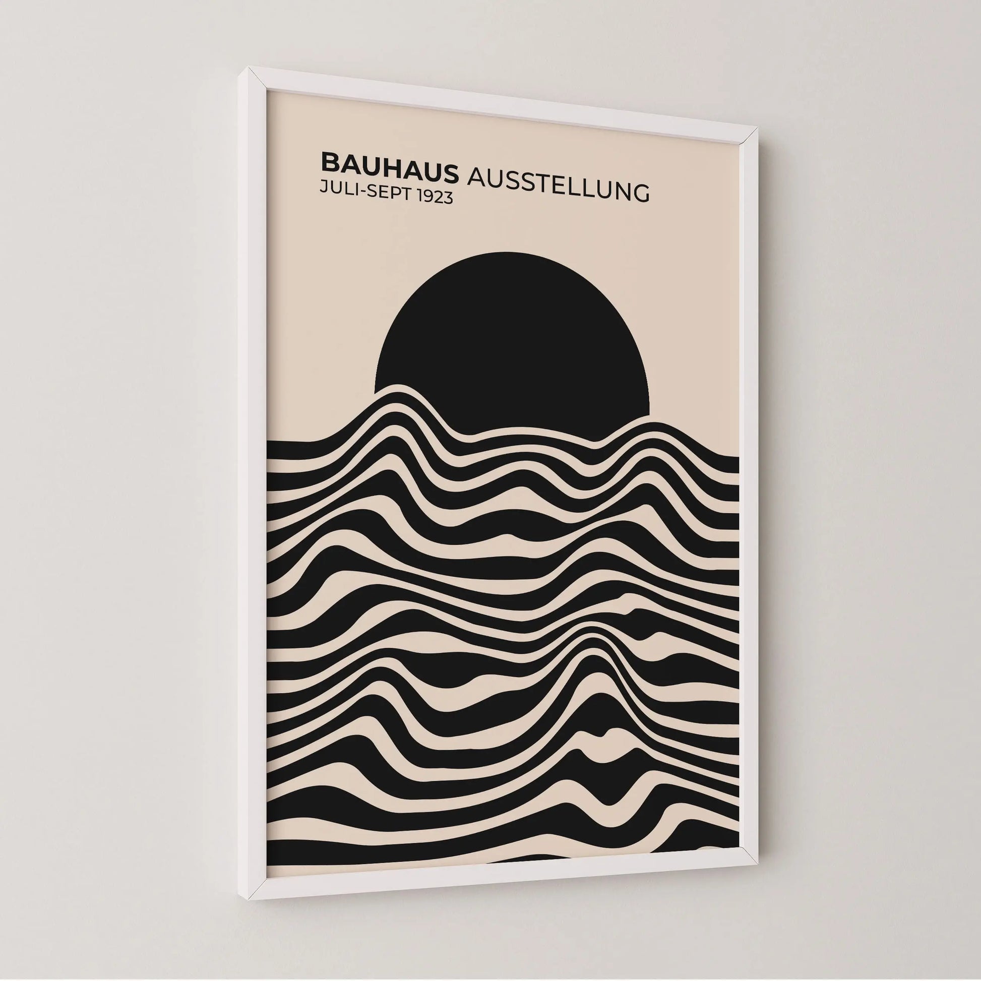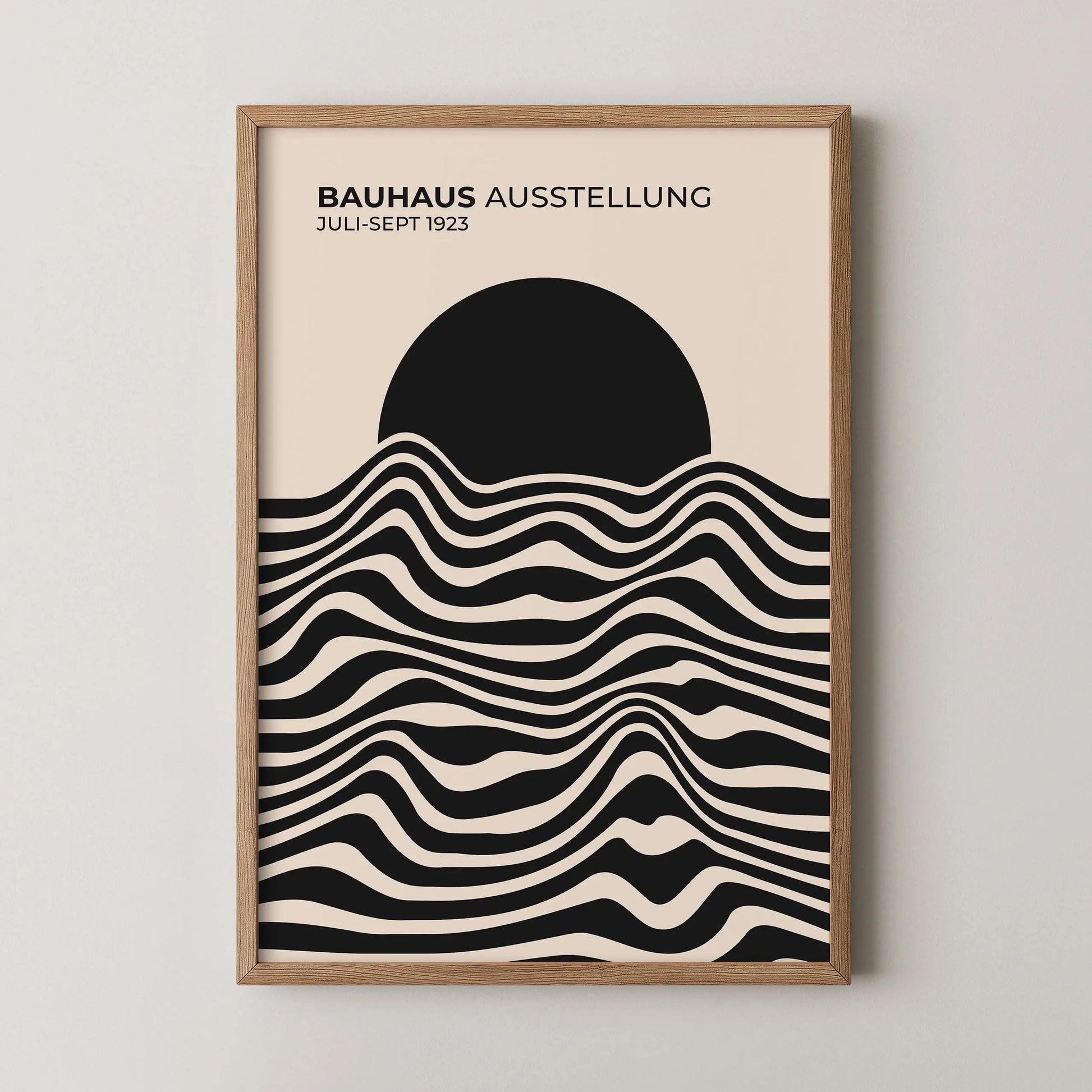 Cette affiche vintage Bauhaus est composée de lignes ondulées parallèles, alternant des aplats sombres et clairs, disposées horizontalement sur la partie inférieure. Ces lignes forment des courbes fluides et continues, créant un rythme visuel régulier. La partie supérieure est occupée par un disque plein, partiellement superposé aux lignes, établissant un contraste net entre formes organiques et géométrie simple.