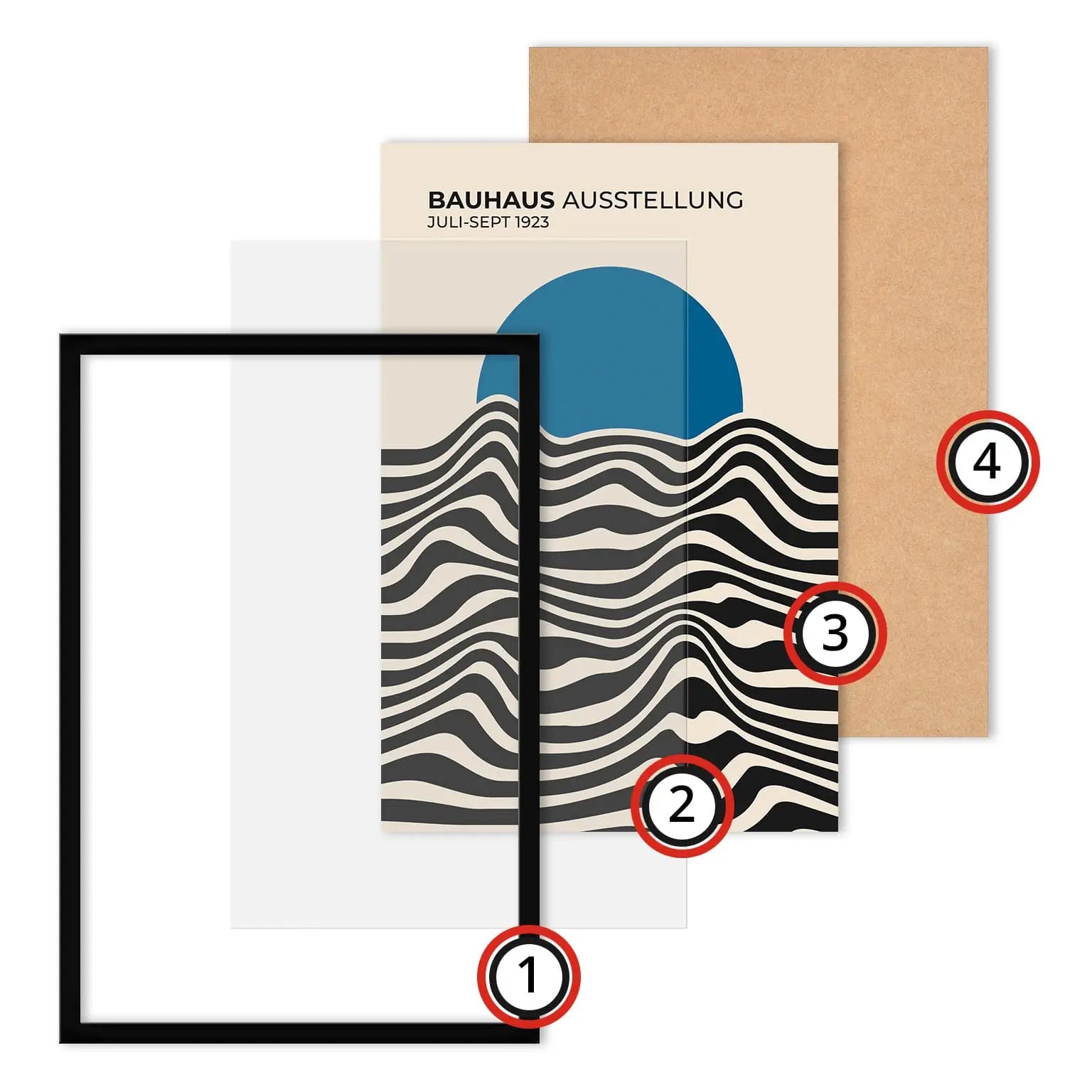 Cette affiche vintage Bauhaus est composée de lignes ondulées parallèles, alternant des aplats sombres et clairs, disposées horizontalement sur la partie inférieure. Ces lignes forment des courbes fluides et continues, créant un rythme visuel régulier. La partie supérieure est occupée par un disque plein, partiellement superposé aux lignes, établissant un contraste net entre formes organiques et géométrie simple.