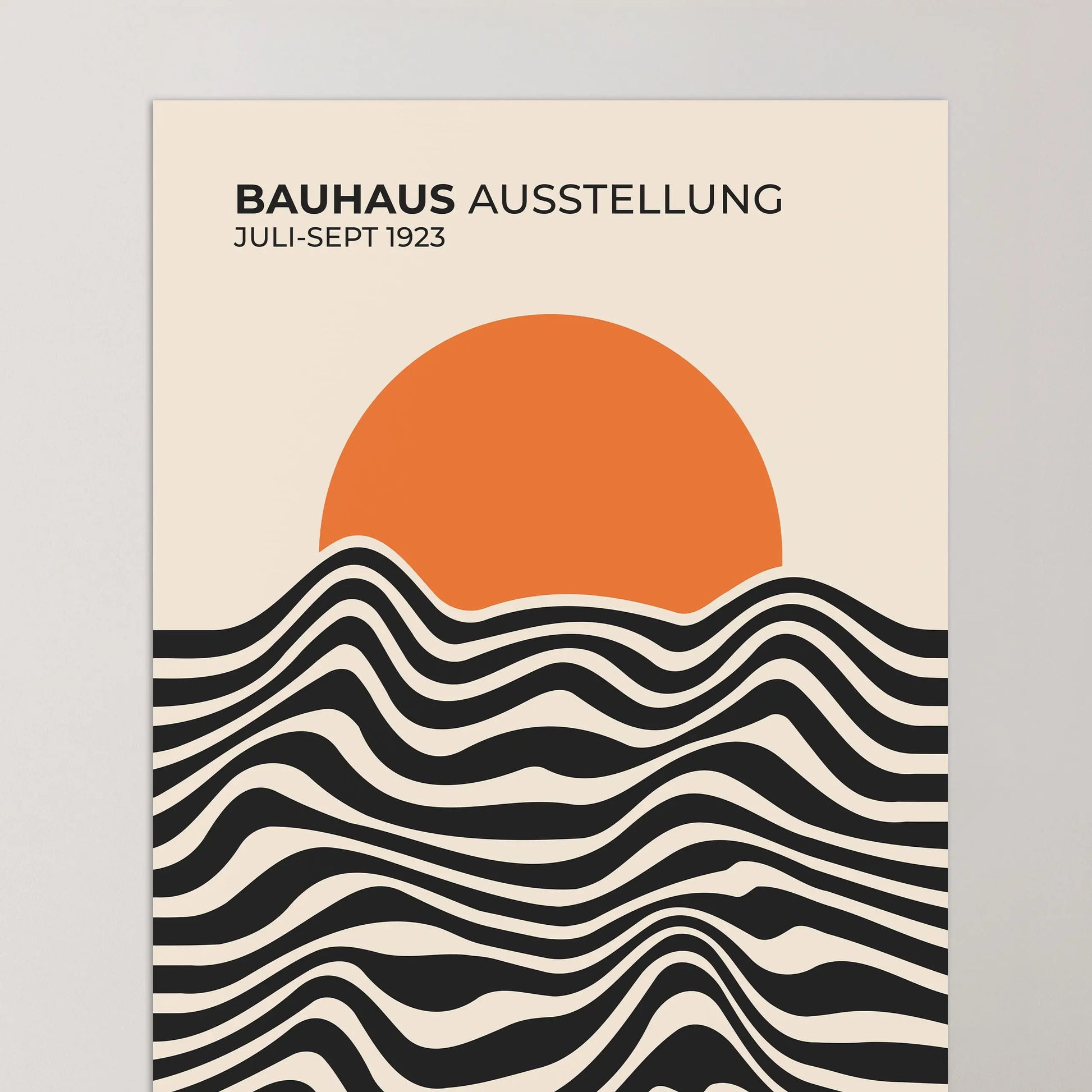 Cette affiche vintage Bauhaus est composée de lignes ondulées parallèles, alternant des aplats sombres et clairs, disposées horizontalement sur la partie inférieure. Ces lignes forment des courbes fluides et continues, créant un rythme visuel régulier. La partie supérieure est occupée par un disque plein, partiellement superposé aux lignes, établissant un contraste net entre formes organiques et géométrie simple.