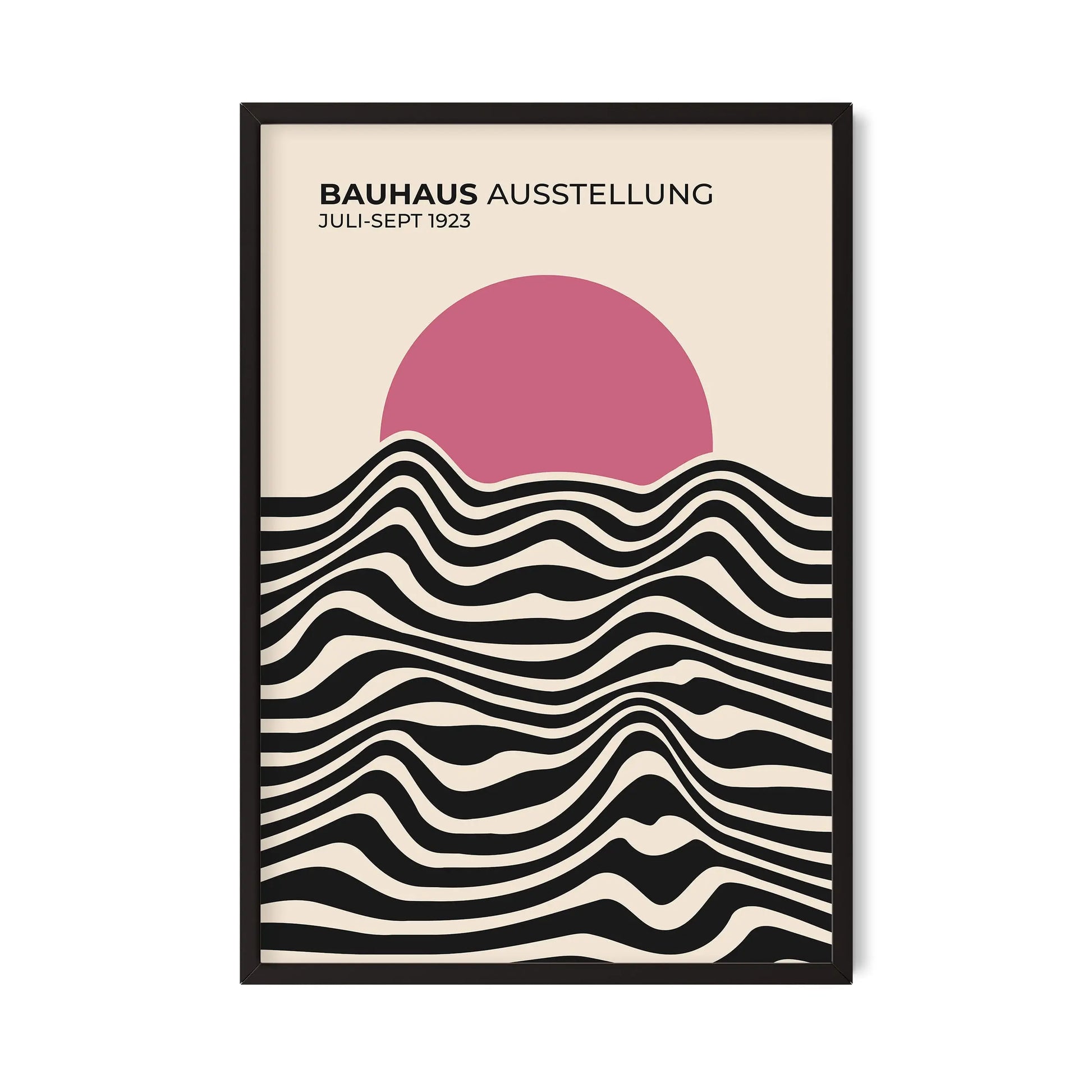 Cette affiche vintage Bauhaus est composée de lignes ondulées parallèles, alternant des aplats sombres et clairs, disposées horizontalement sur la partie inférieure. Ces lignes forment des courbes fluides et continues, créant un rythme visuel régulier. La partie supérieure est occupée par un disque plein, partiellement superposé aux lignes, établissant un contraste net entre formes organiques et géométrie simple.