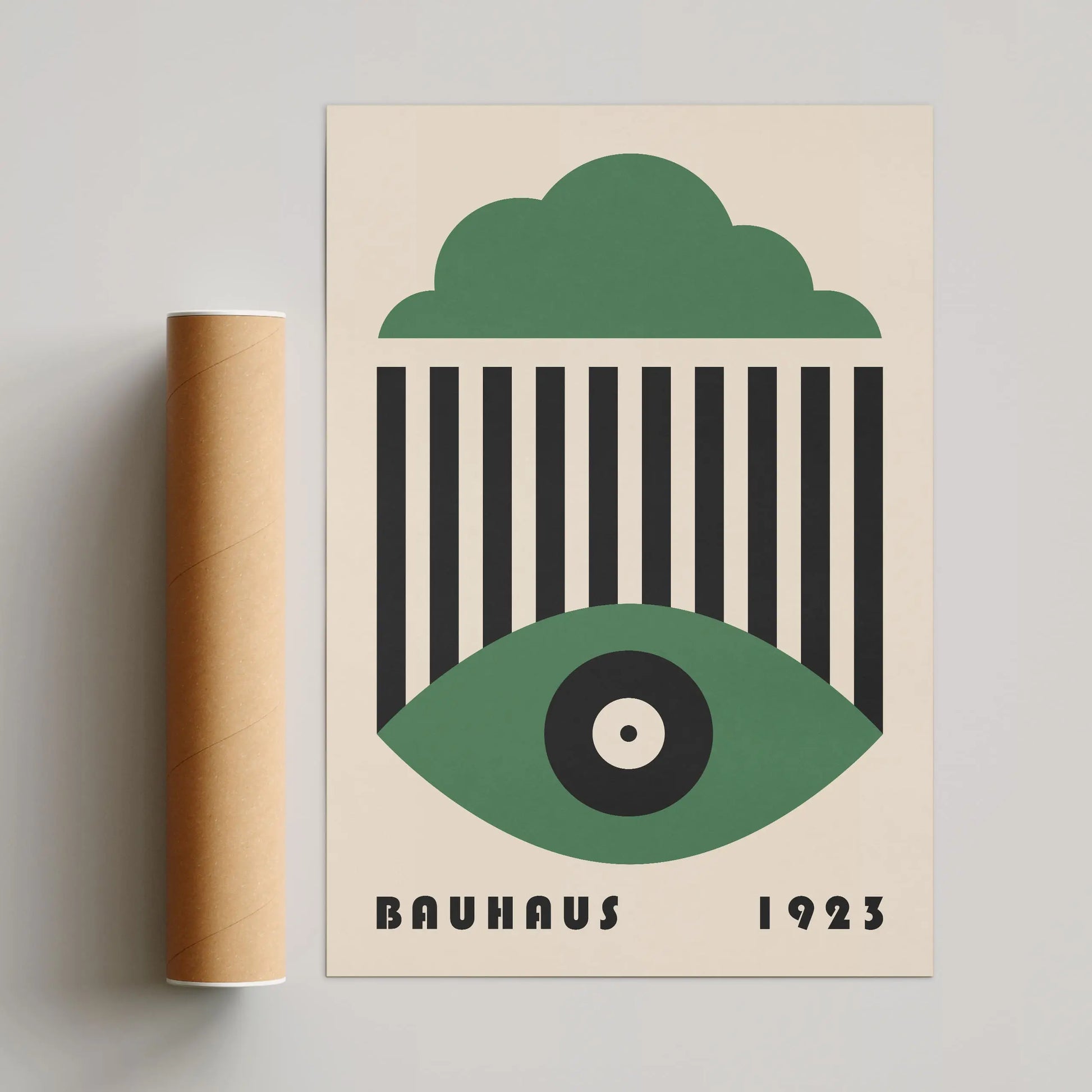 Cette affiche vintage graphique Bauhaus est constituée d'un nuage stylisé en partie supérieure, d'un ensemble de lignes verticales parallèles au centre, et une forme d’œil géométrique en partie inférieure, centrée autour d’un cercle. L’ensemble déploie un langage formel épuré, où la répétition des lignes dialogue avec la douceur des courbes pour créer une tension visuelle à la fois graphique et contemplative.