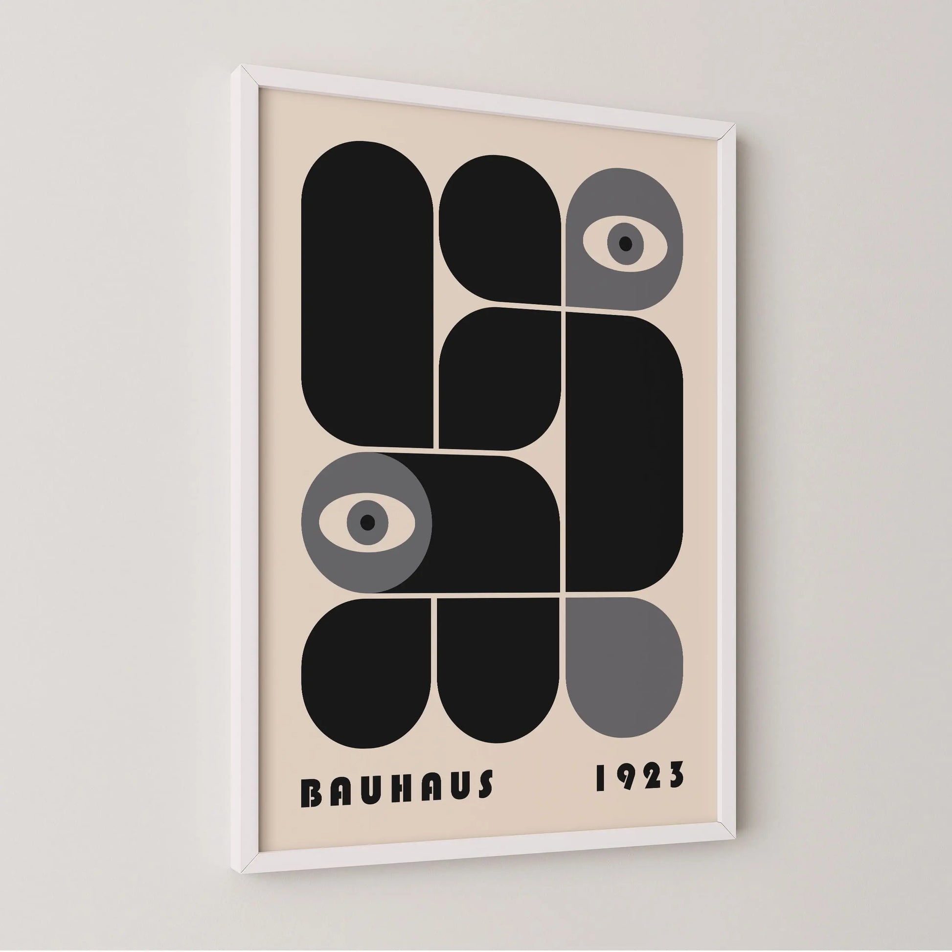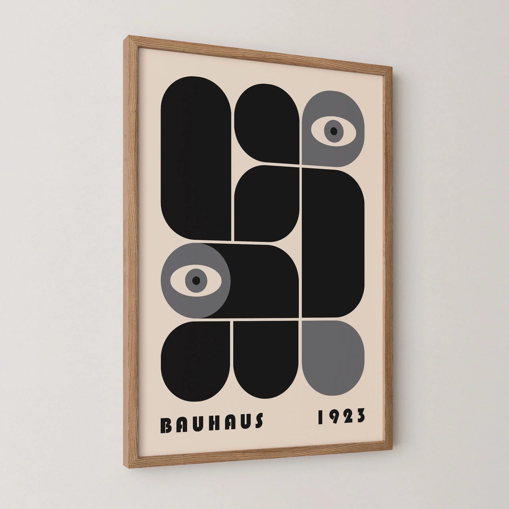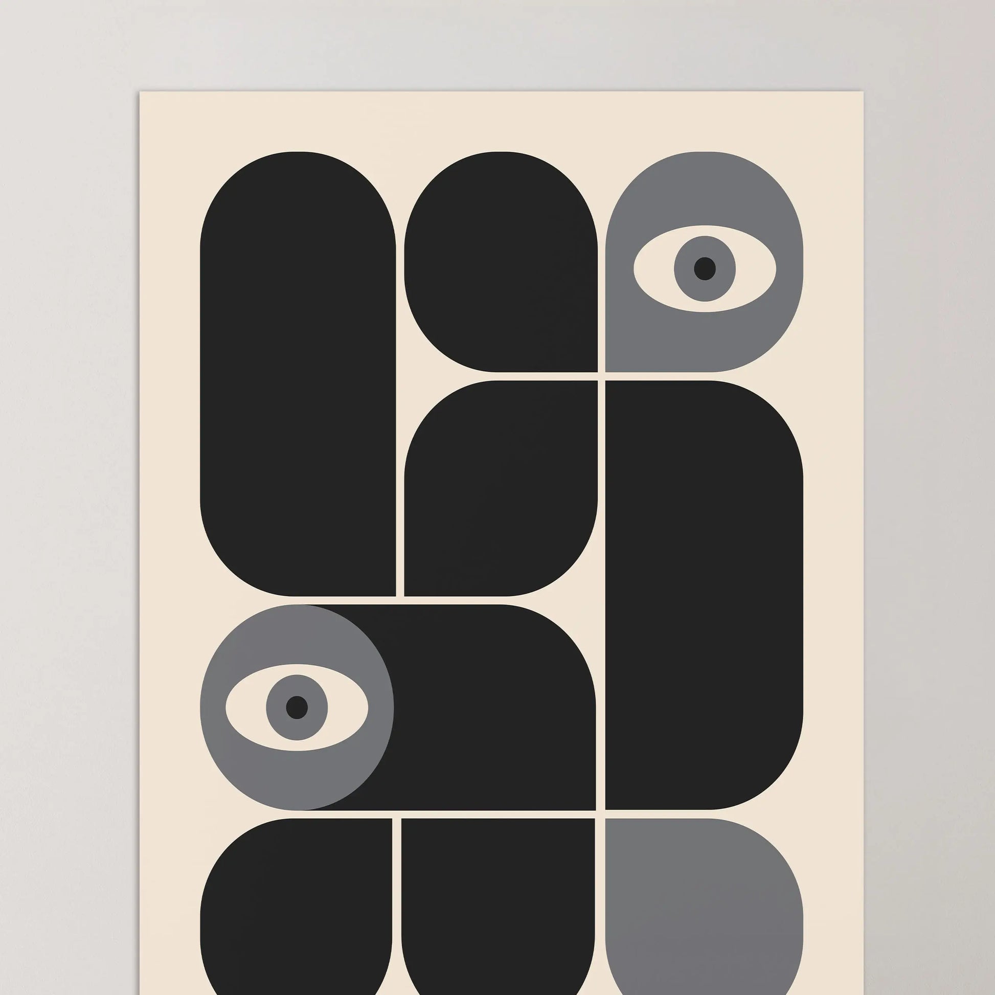 Cette affiche vintage graphique Bauhaus est composée de formes modulaires aux angles arrondis ou stricts, juxtaposées selon une grille définie, tantôt en complémentarité, tantôt en opposition. L’apparition d’yeux stylisés introduit une dimension humaine et conceptuelle, suggérant un regard critique intégré au système rationnel de la modernité.