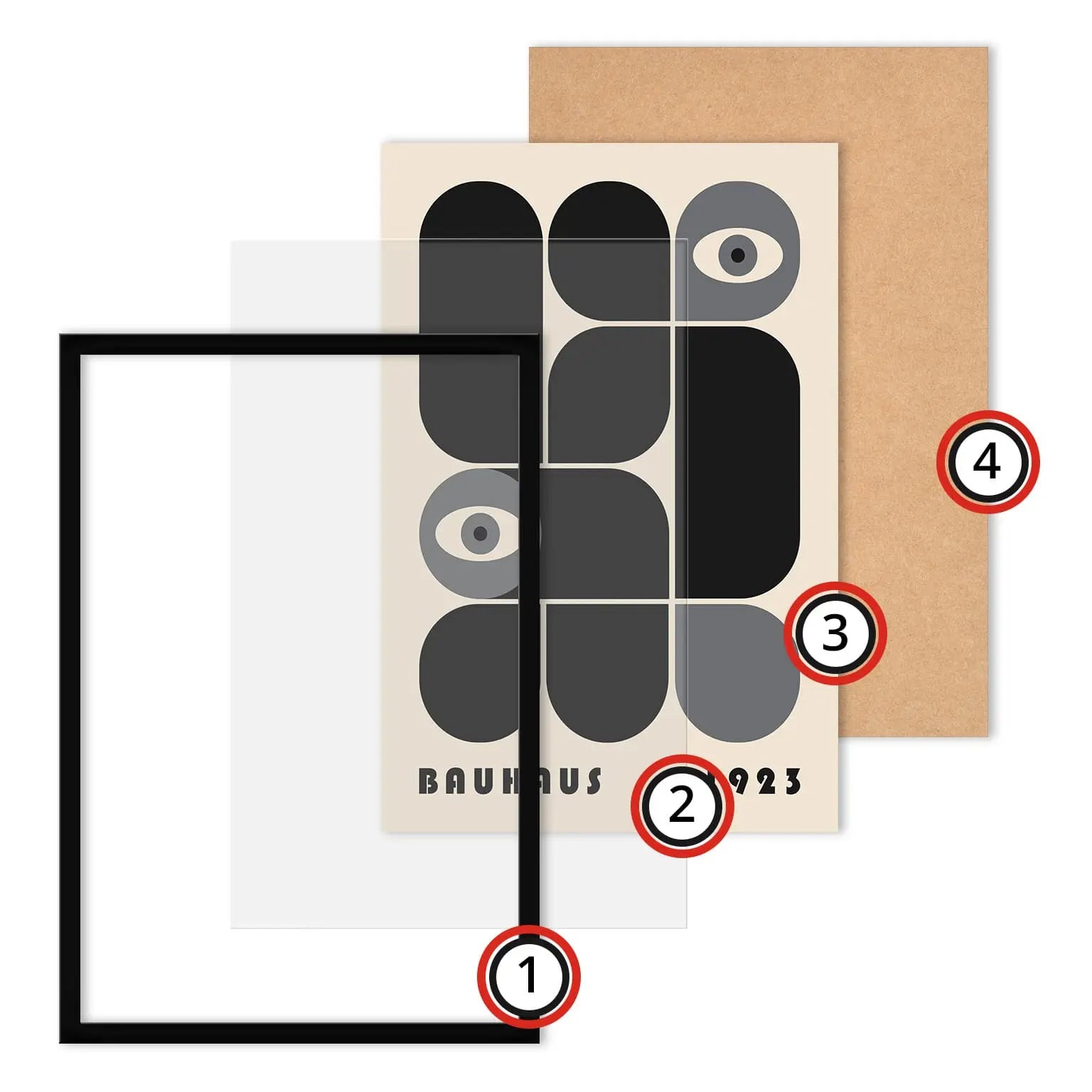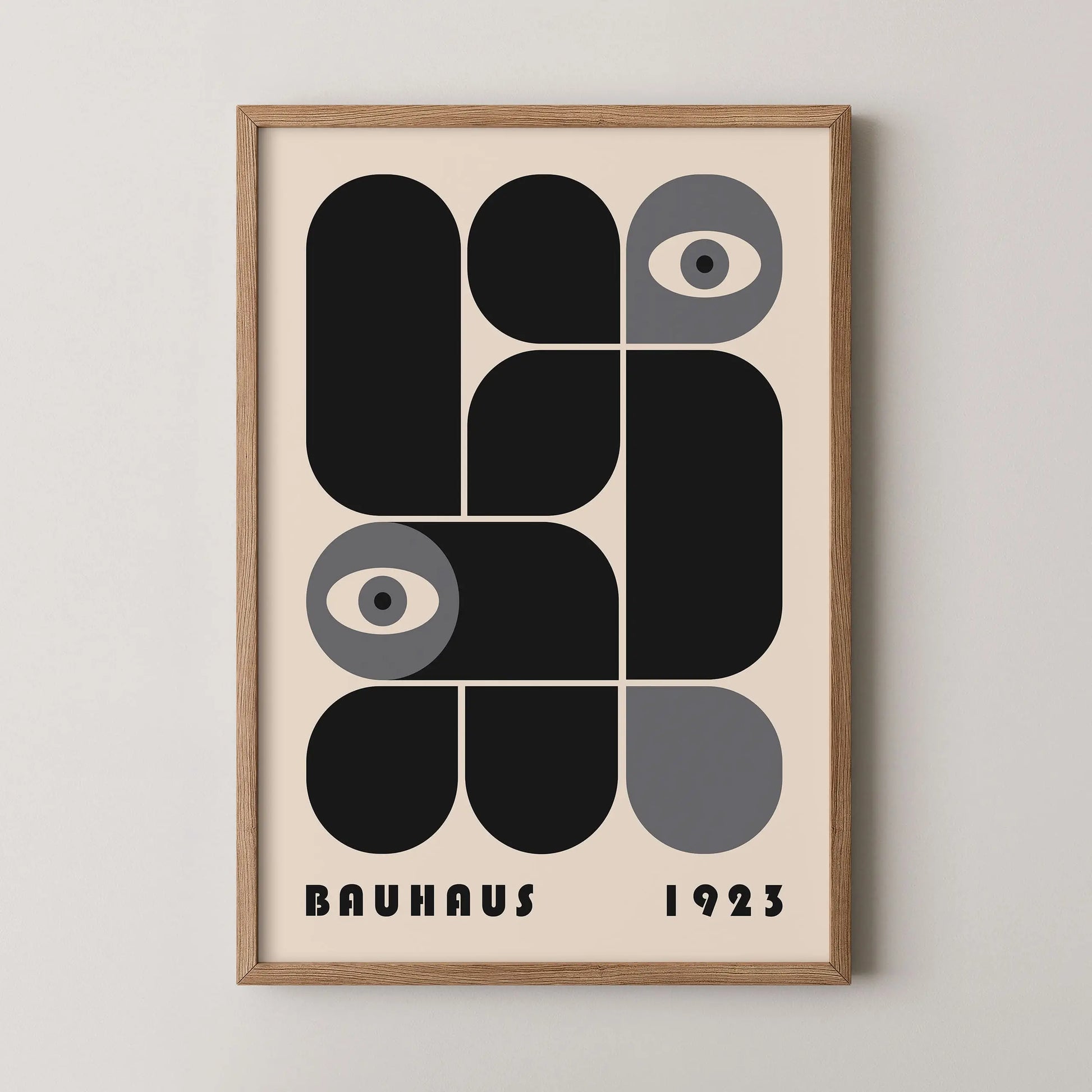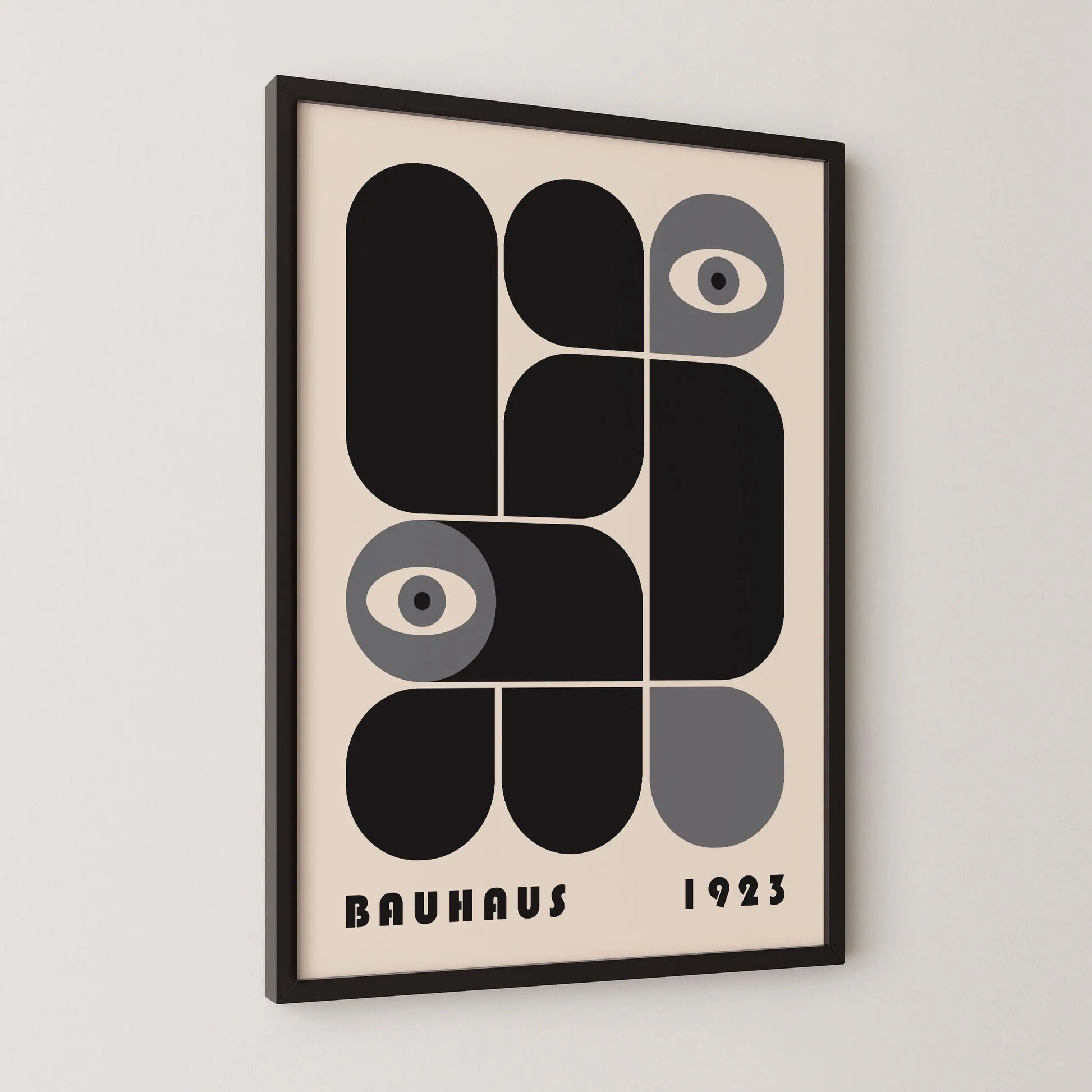 Cette affiche vintage graphique Bauhaus est composée de formes modulaires aux angles arrondis ou stricts, juxtaposées selon une grille définie, tantôt en complémentarité, tantôt en opposition. L’apparition d’yeux stylisés introduit une dimension humaine et conceptuelle, suggérant un regard critique intégré au système rationnel de la modernité.