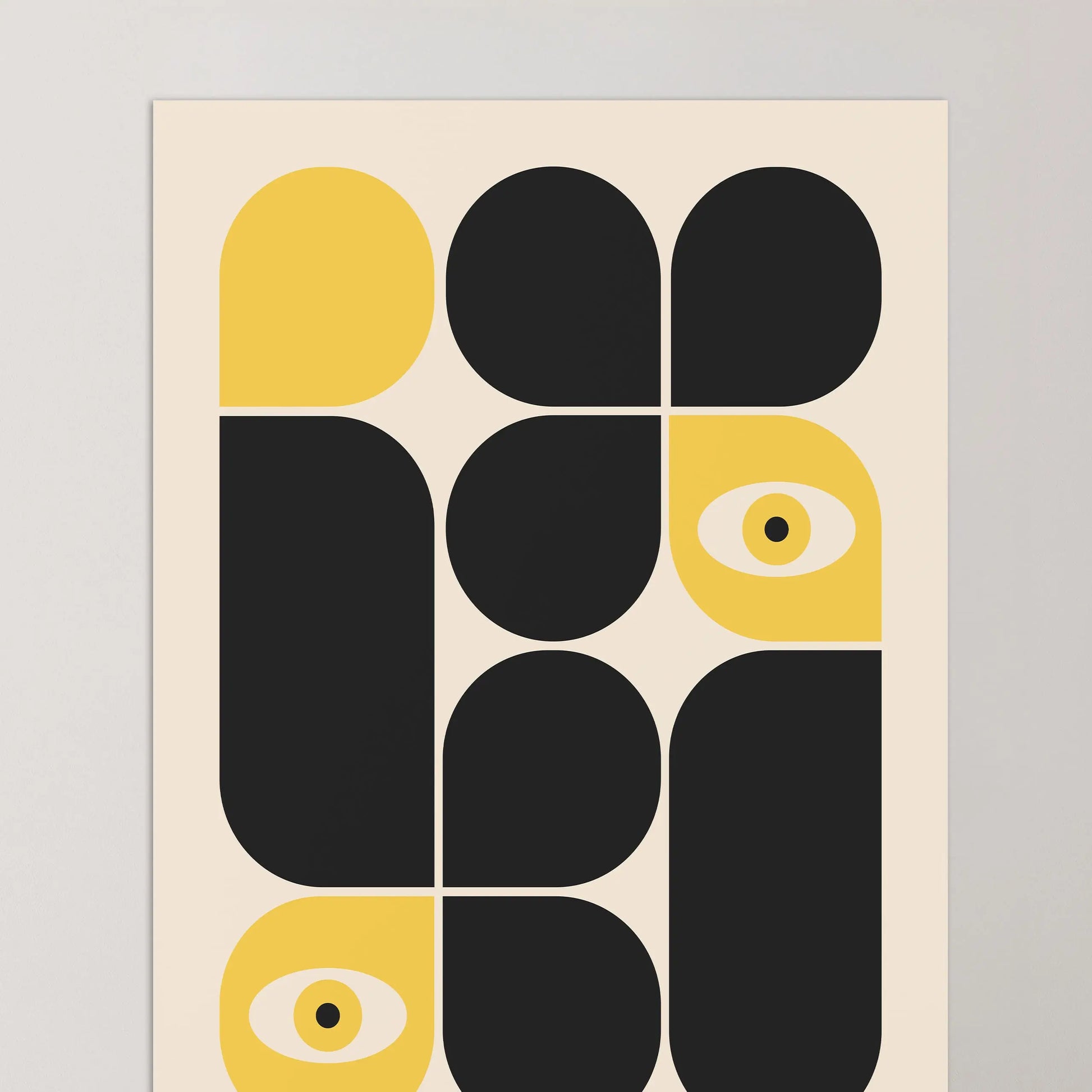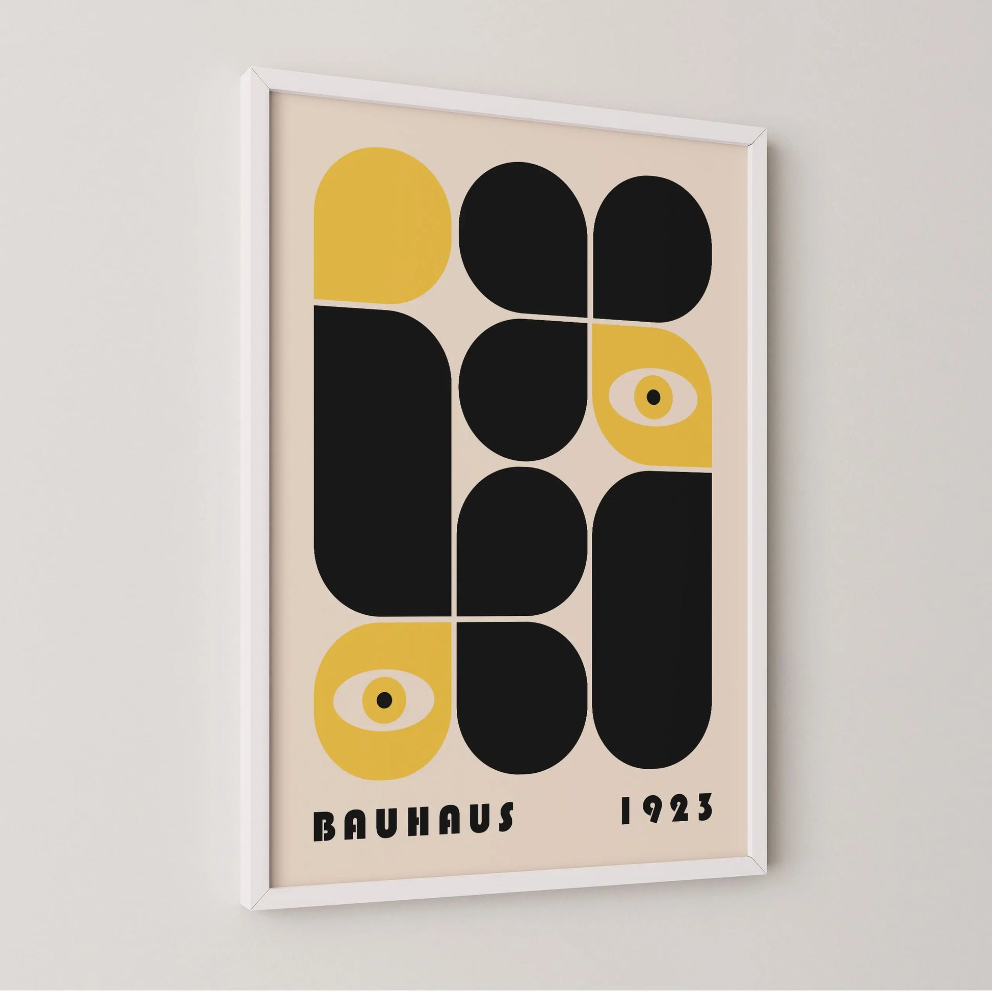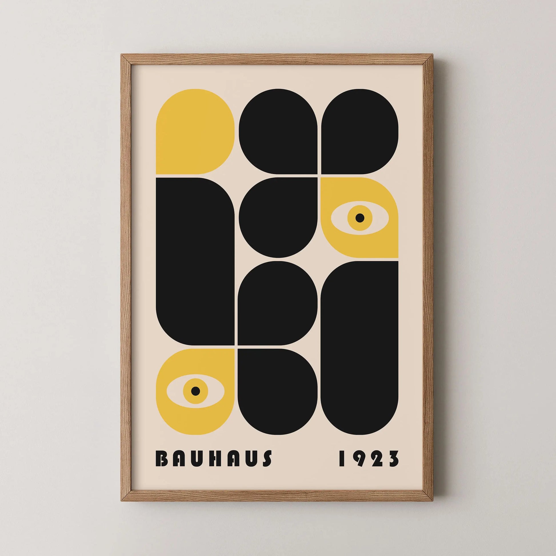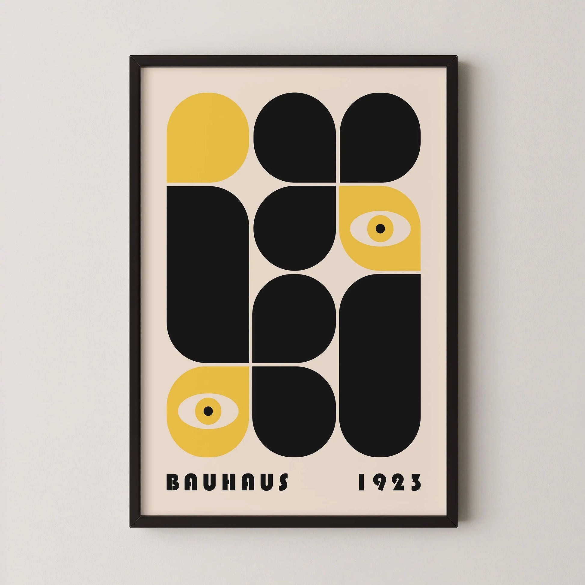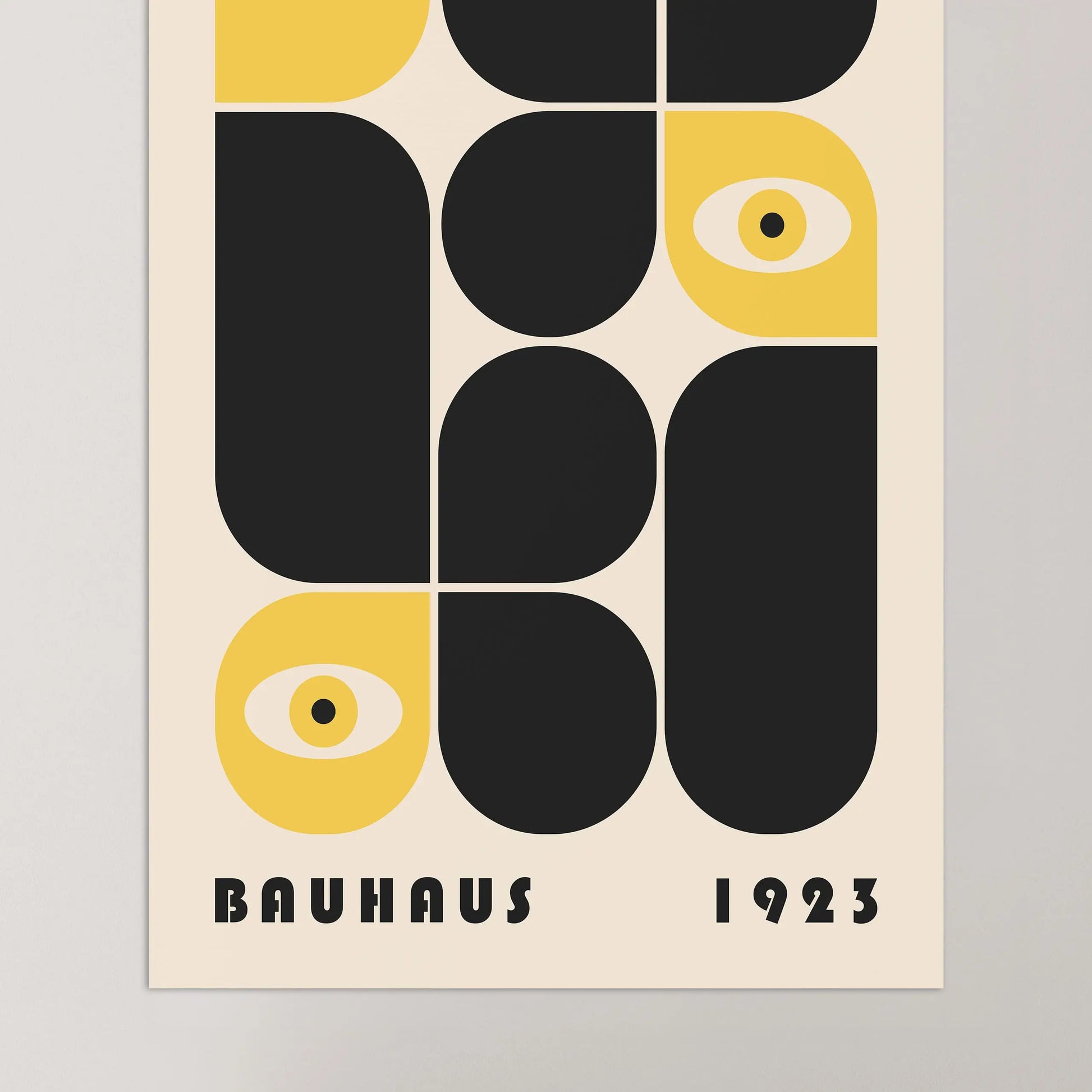 Cette affiche vintage graphique Bauhaus est composée de formes modulaires aux angles arrondis ou stricts, juxtaposées selon une grille définie, tantôt en complémentarité, tantôt en opposition. L’apparition d’yeux stylisés introduit une dimension humaine et conceptuelle, suggérant un regard critique intégré au système rationnel de la modernité.