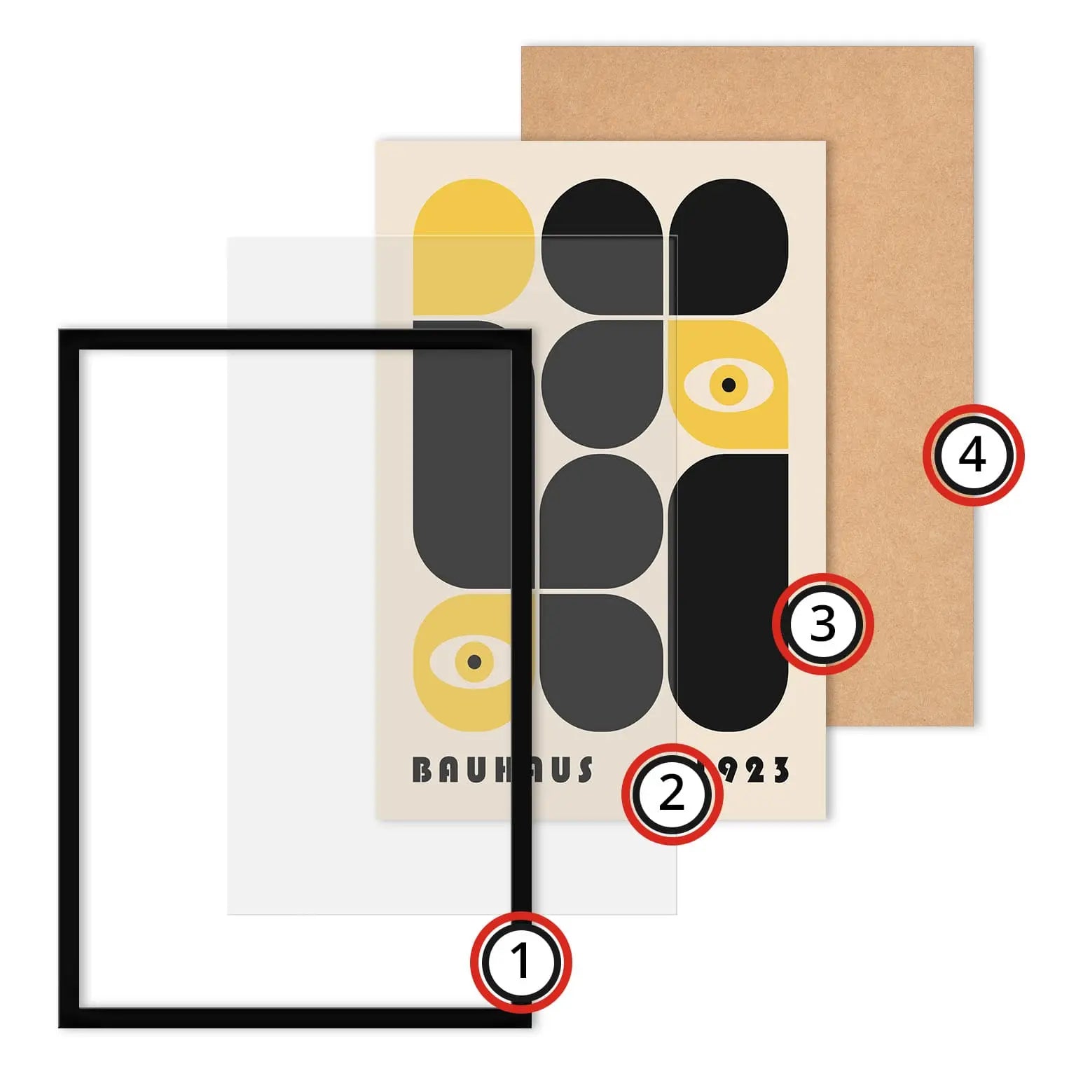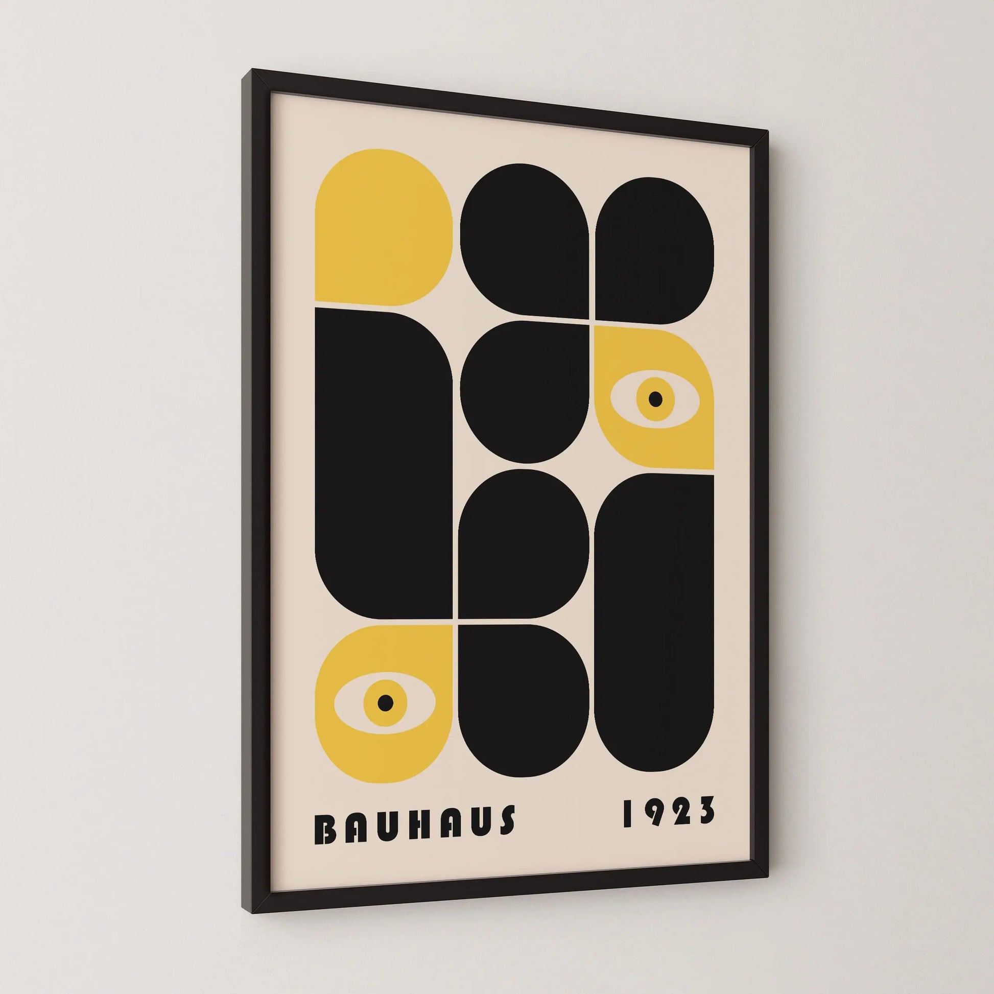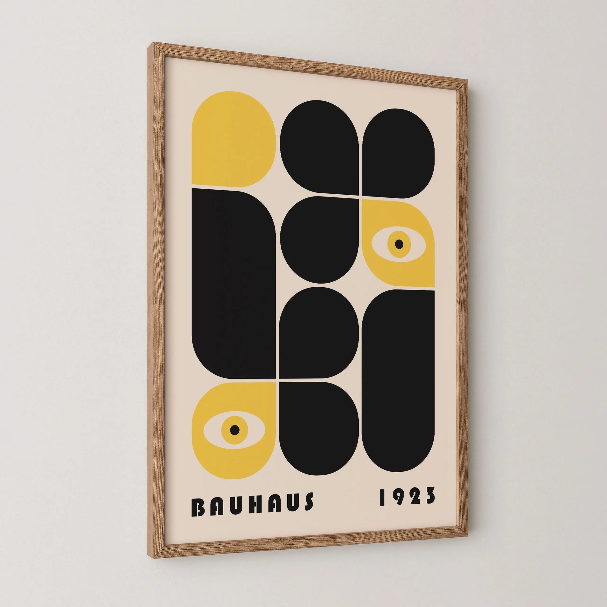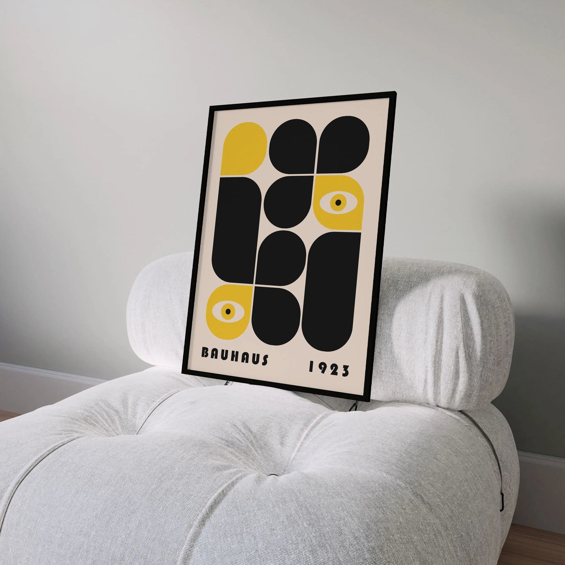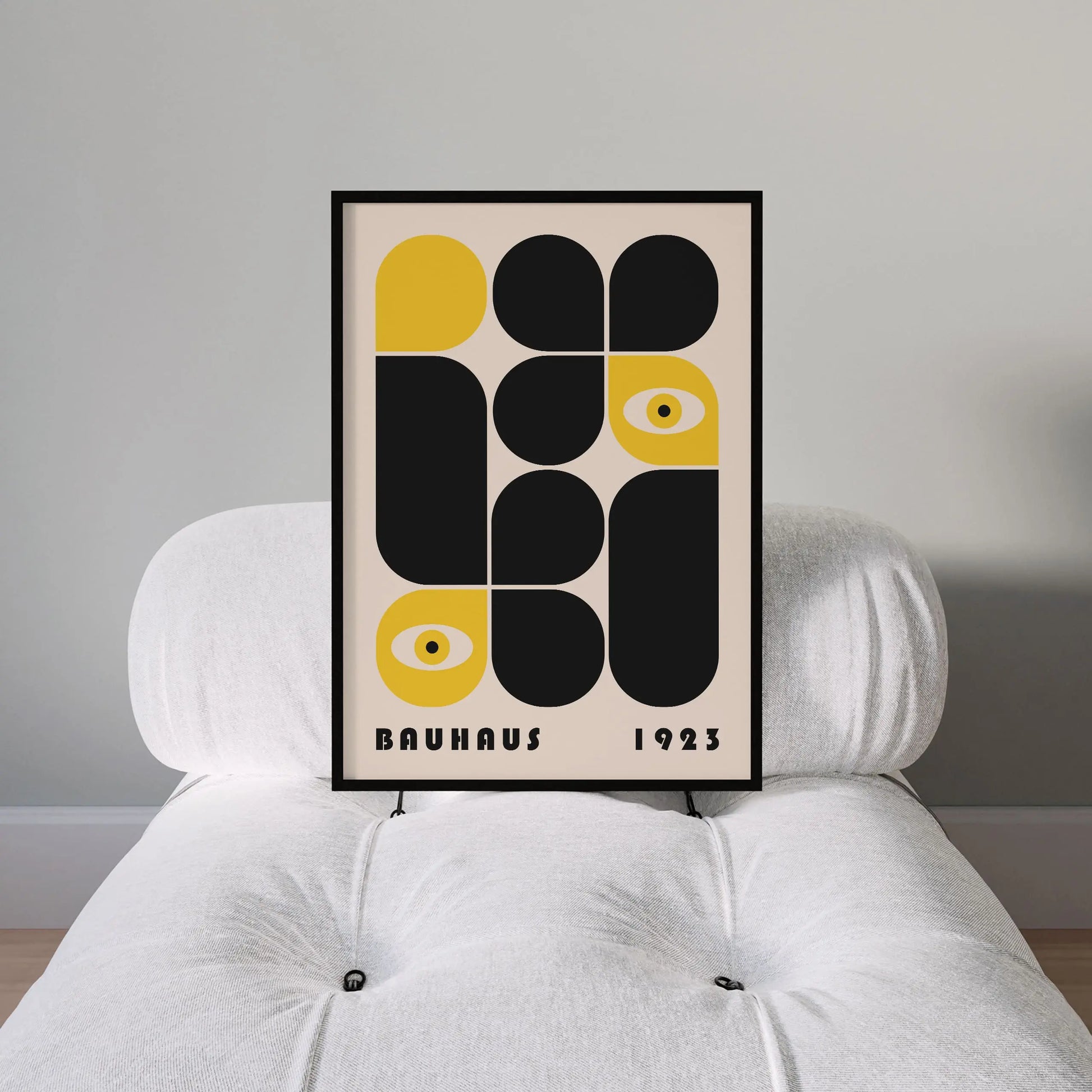 Cette affiche vintage graphique Bauhaus est composée de formes modulaires aux angles arrondis ou stricts, juxtaposées selon une grille définie, tantôt en complémentarité, tantôt en opposition. L’apparition d’yeux stylisés introduit une dimension humaine et conceptuelle, suggérant un regard critique intégré au système rationnel de la modernité.