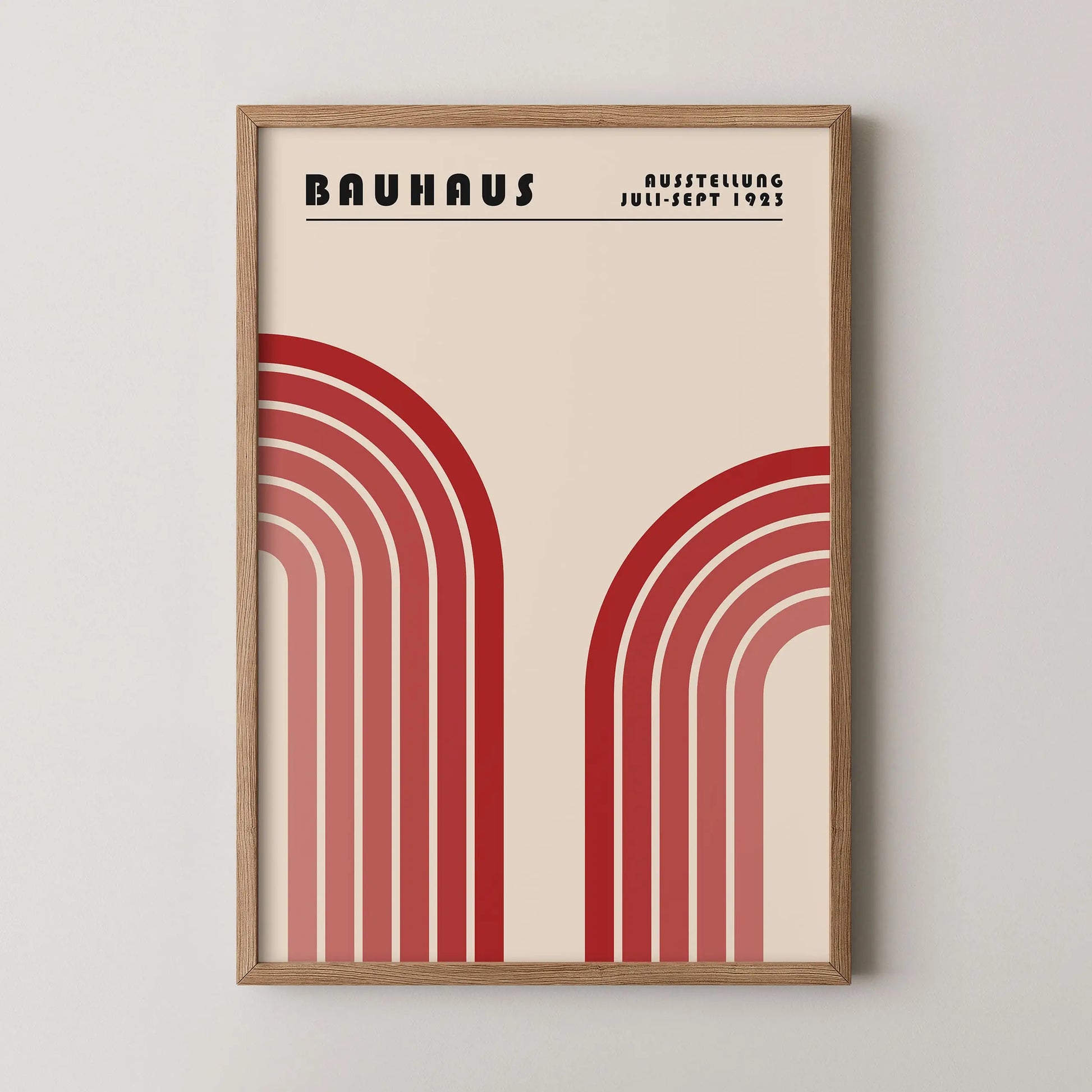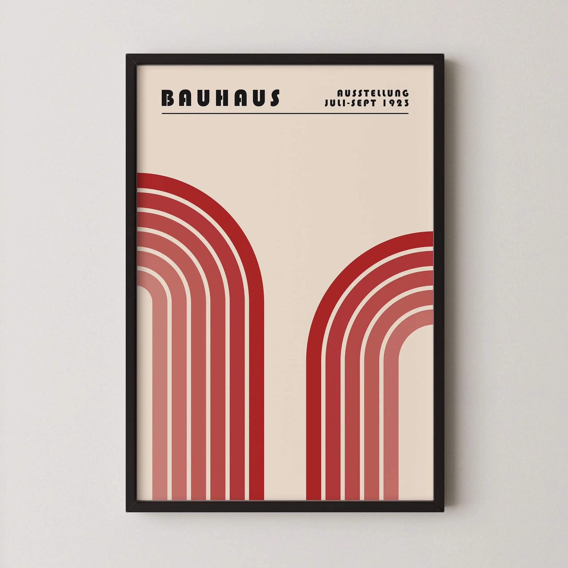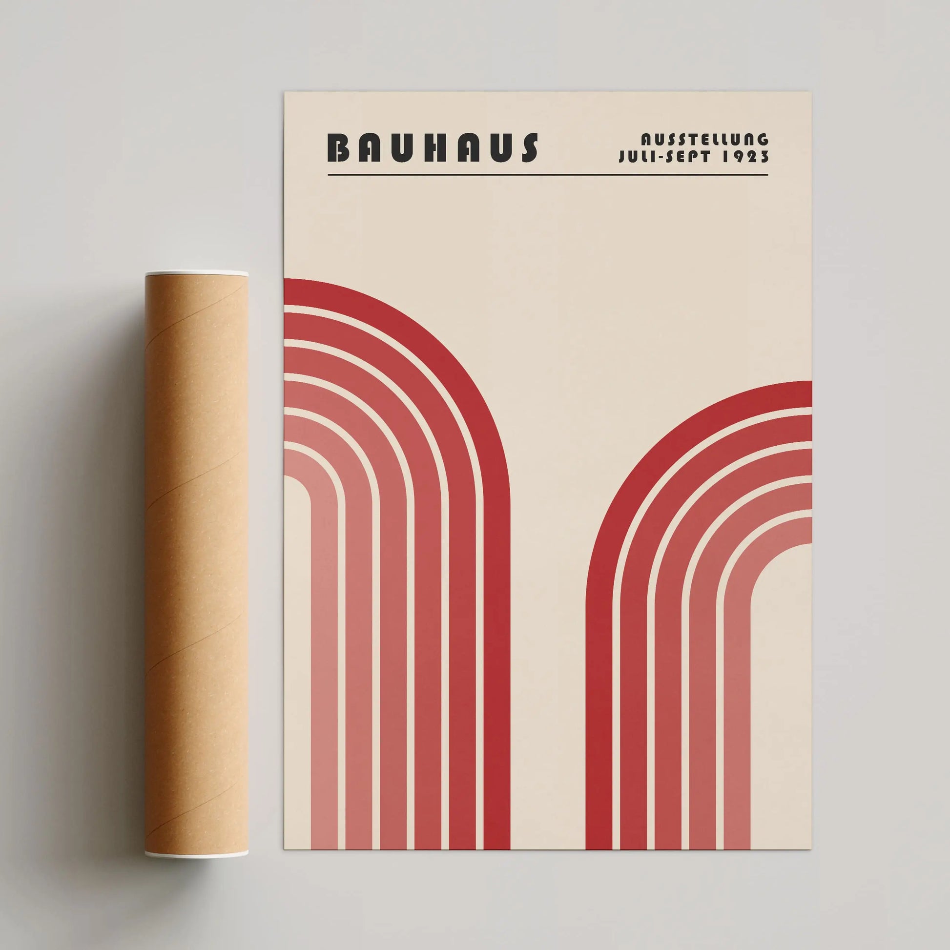 Cette affiche vintage graphique Bauhaus met en scène deux formes arquées monumentales, disposées symétriquement à gauche et à droite, évoquant des arcs stylisés. Chaque forme est composée de bandes concentriques aux tons progressivement dégradés, allant du plus sombre au plus clair, créant un rythme visuel marqué et une impression de profondeur.