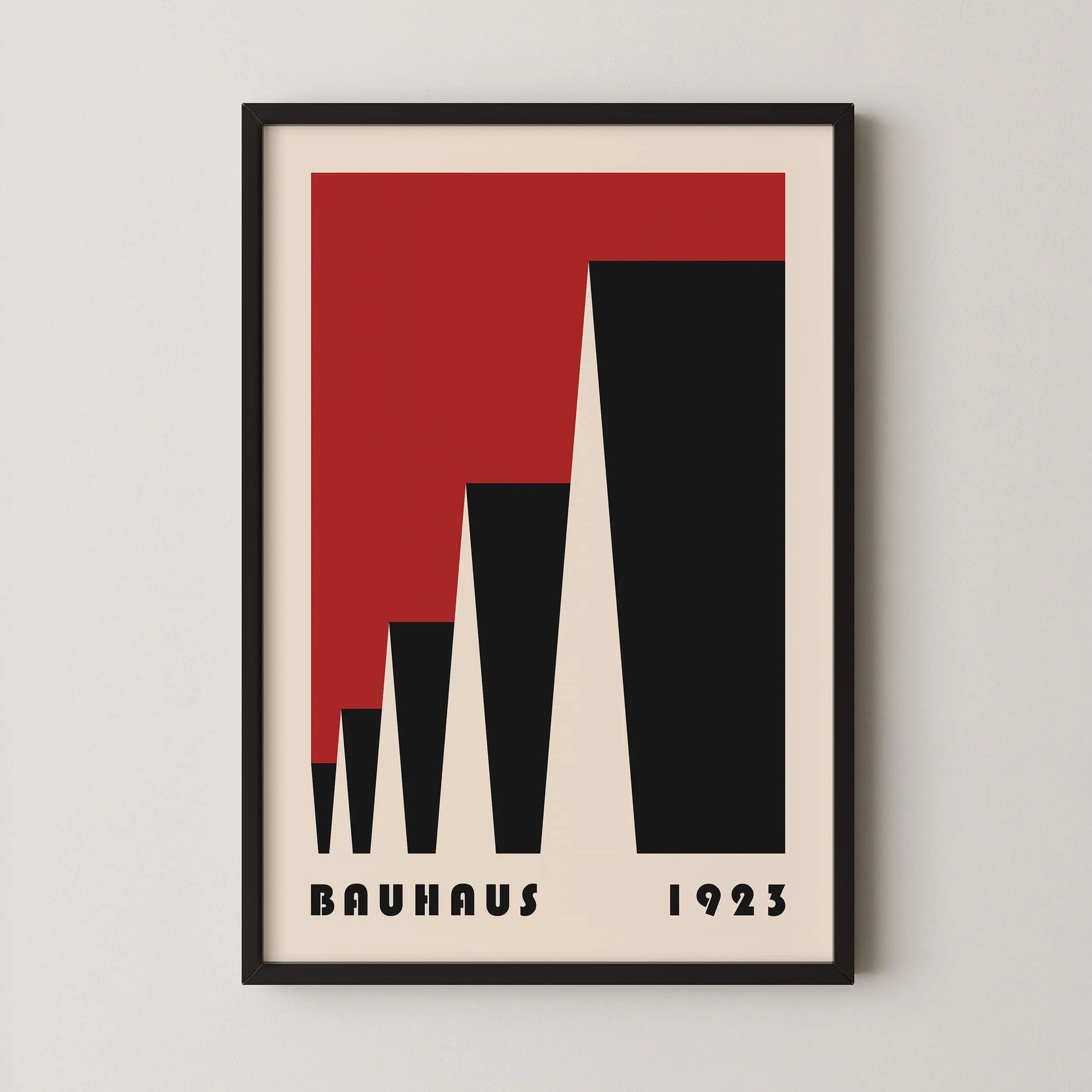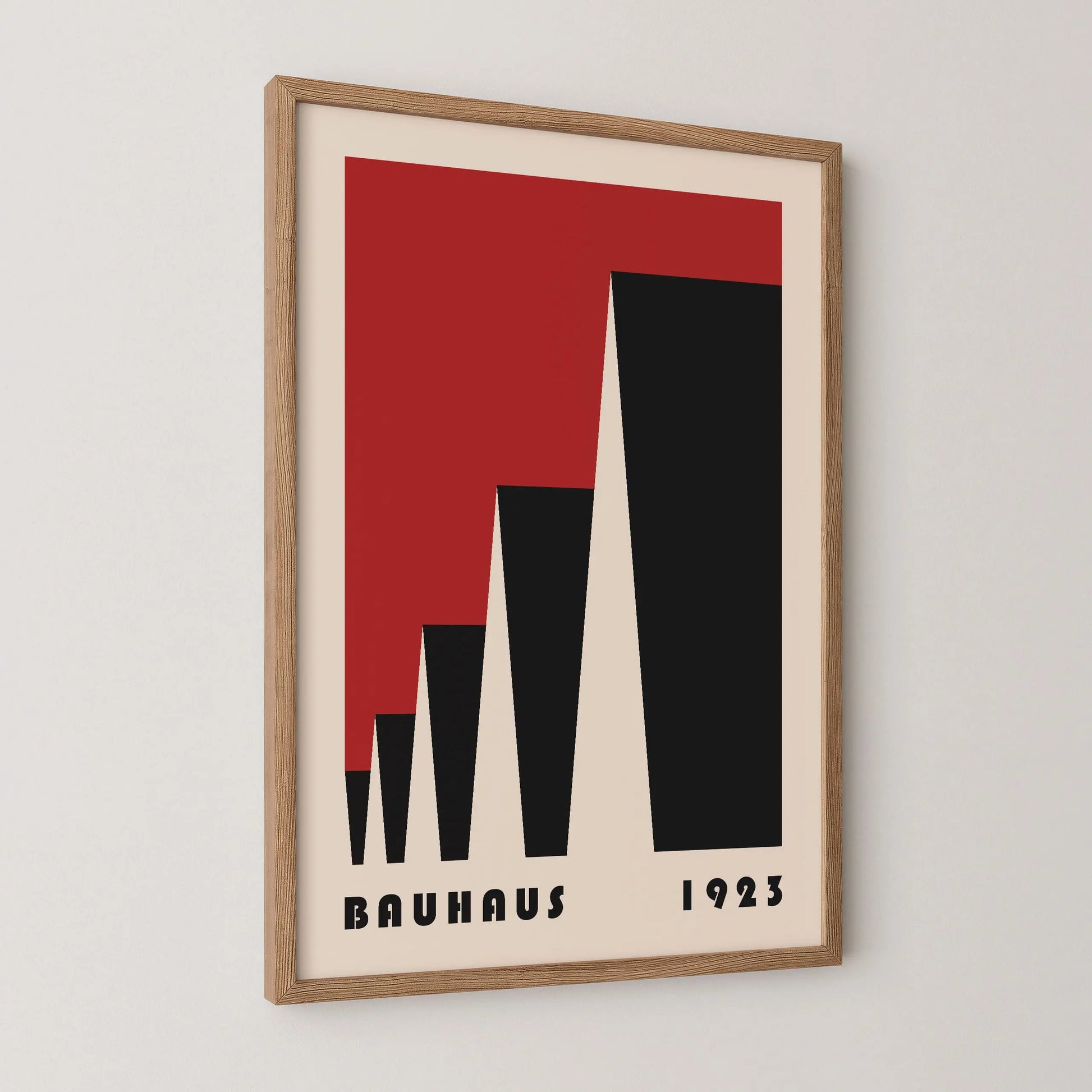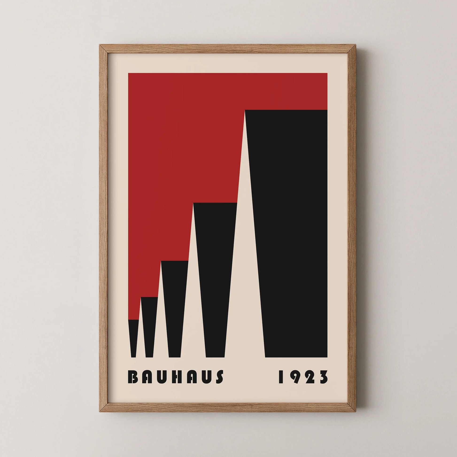 Cette affiche vintage de couleur rouge Bauhaus est composée de triangles mis en perspective latéralement sur fond beige.