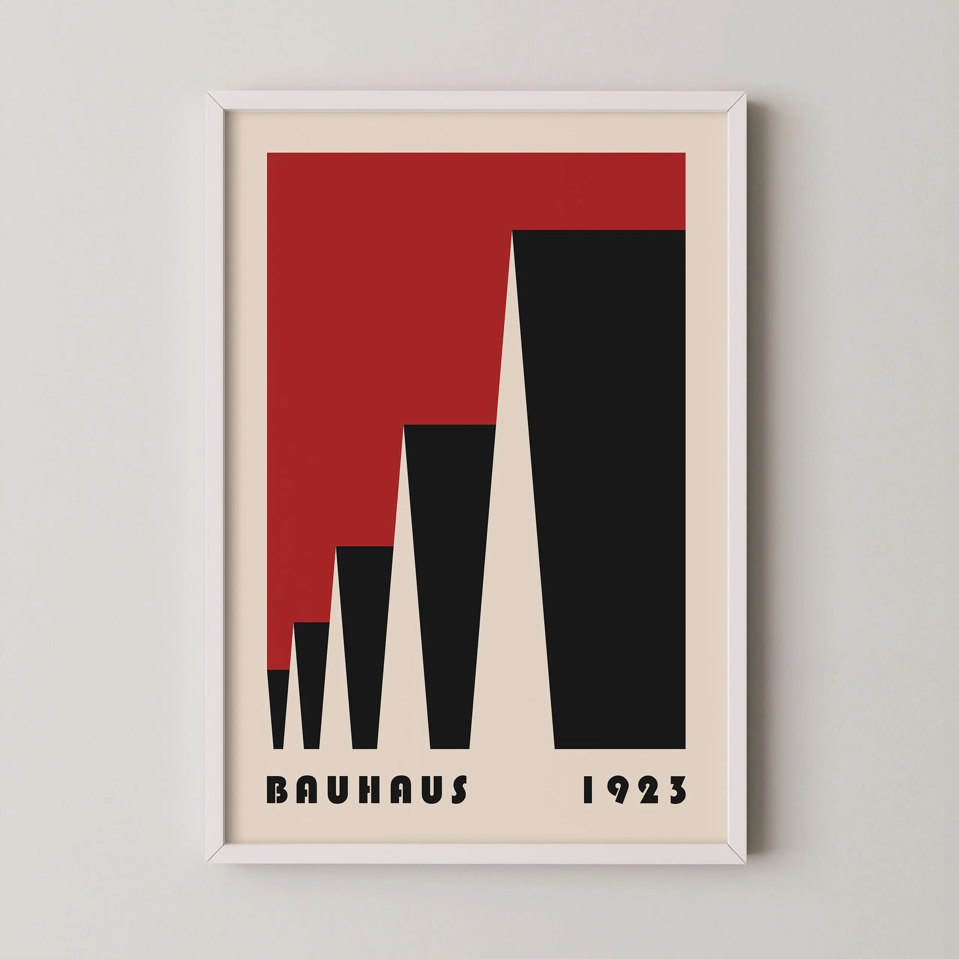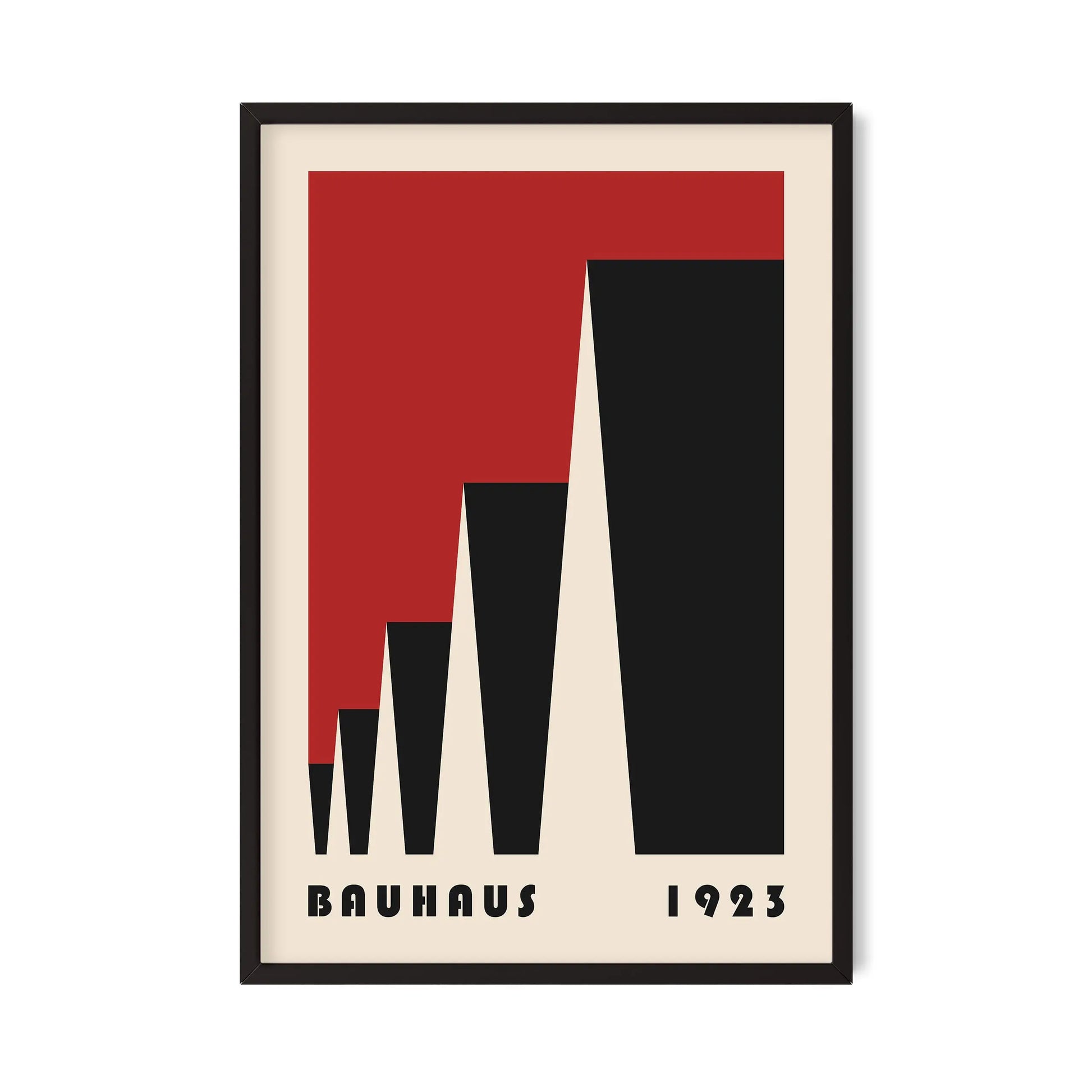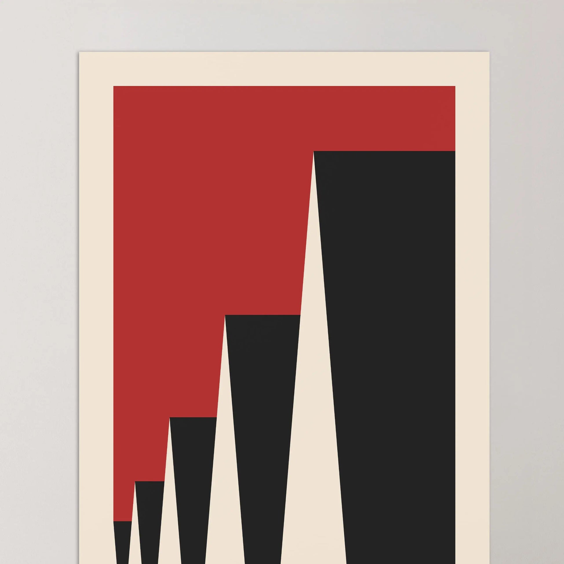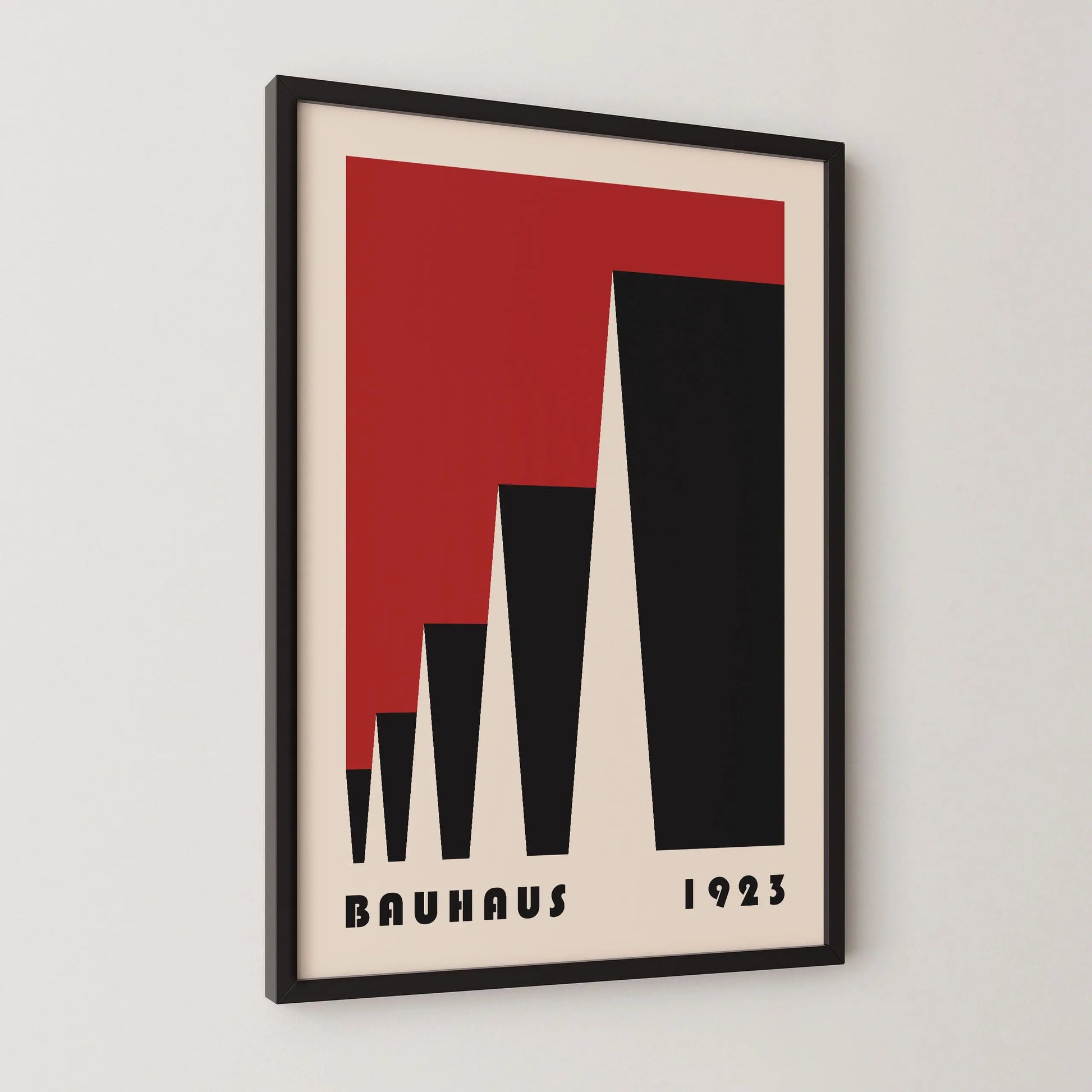 Cette affiche vintage de couleur rouge Bauhaus est composée de triangles mis en perspective latéralement sur fond beige.