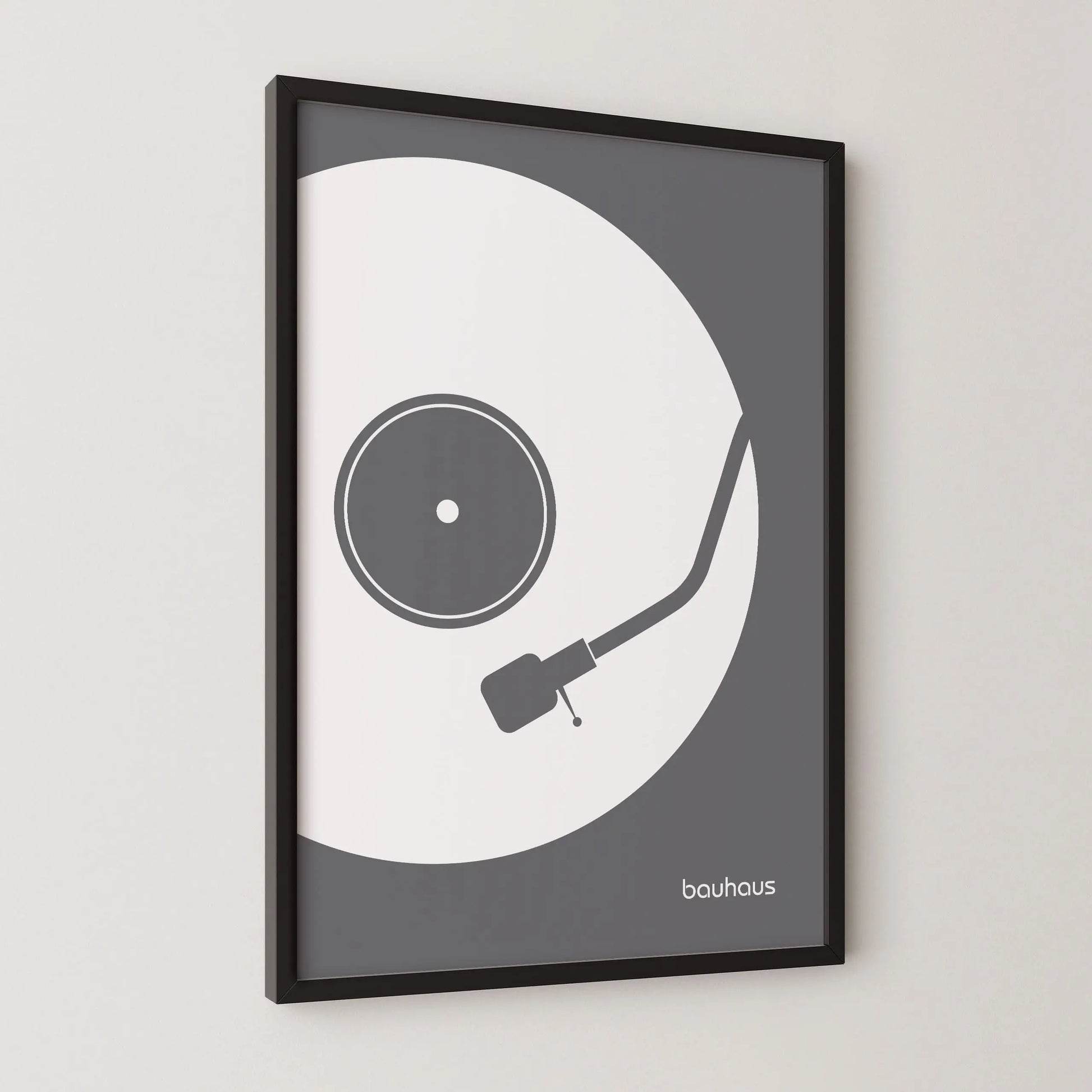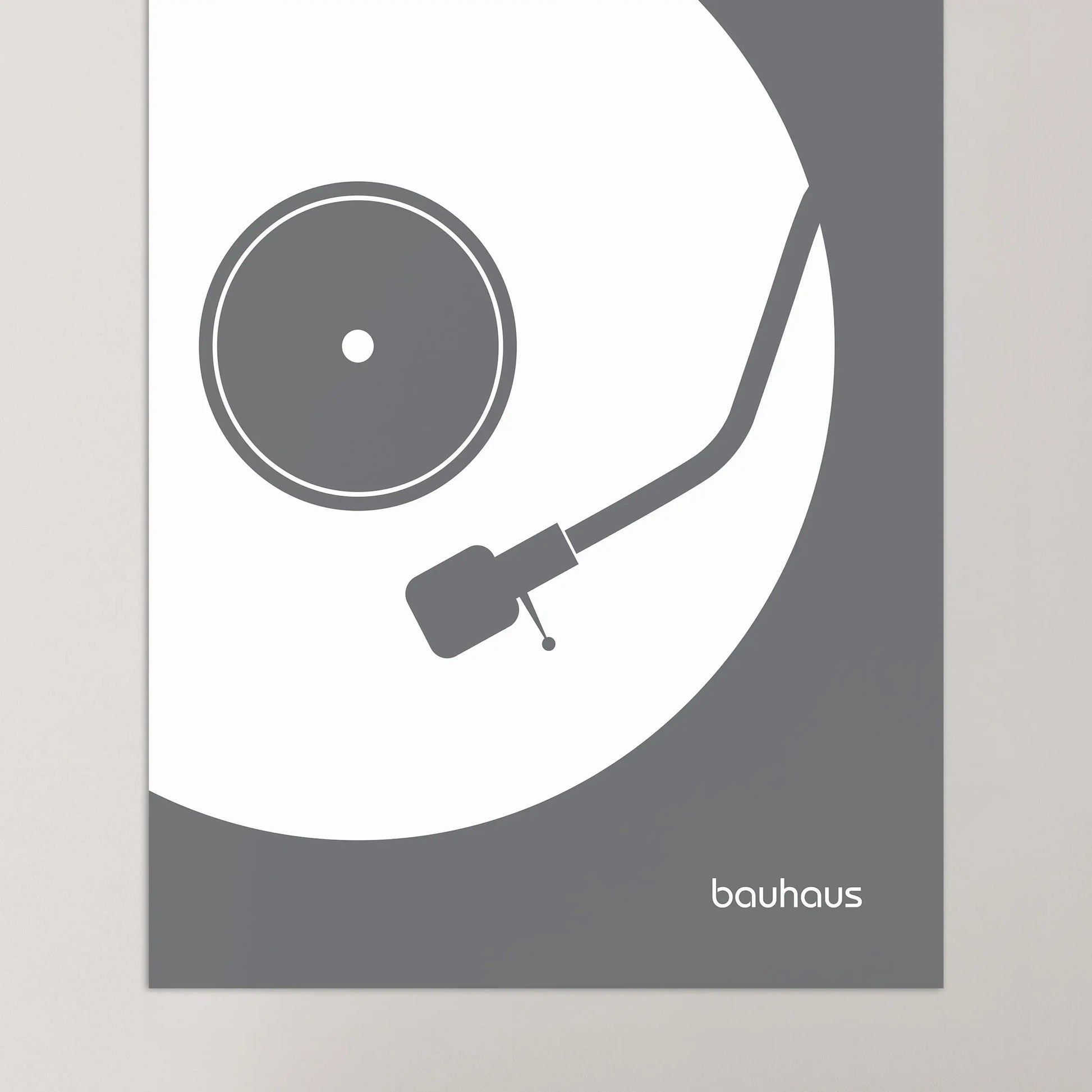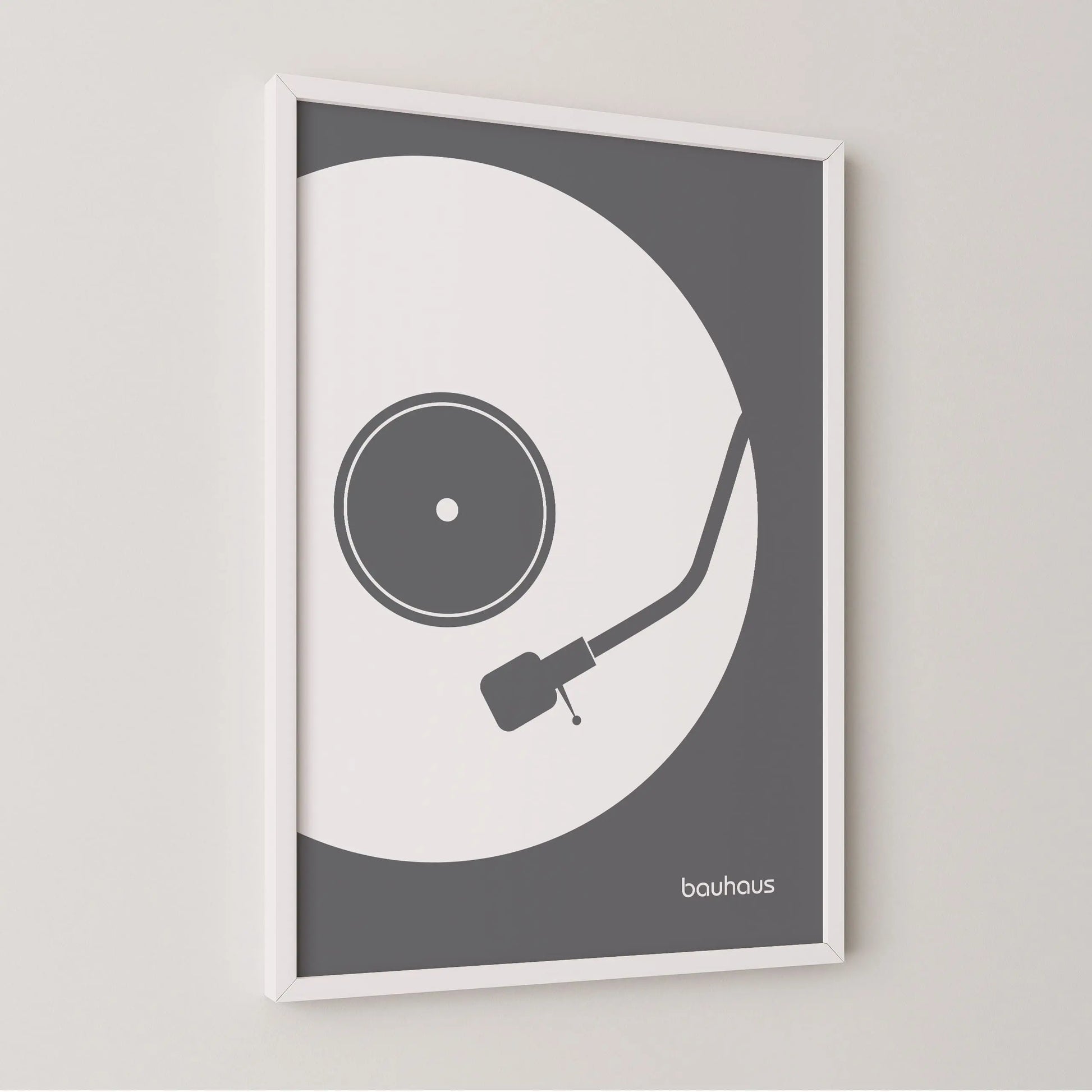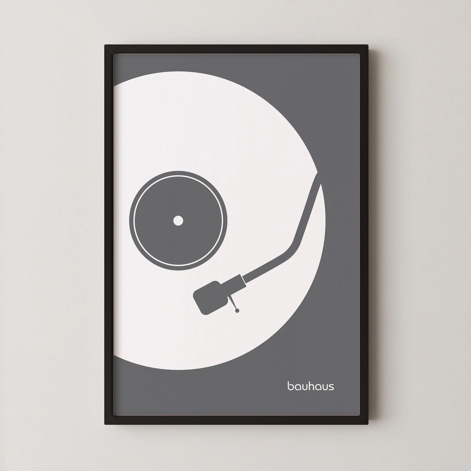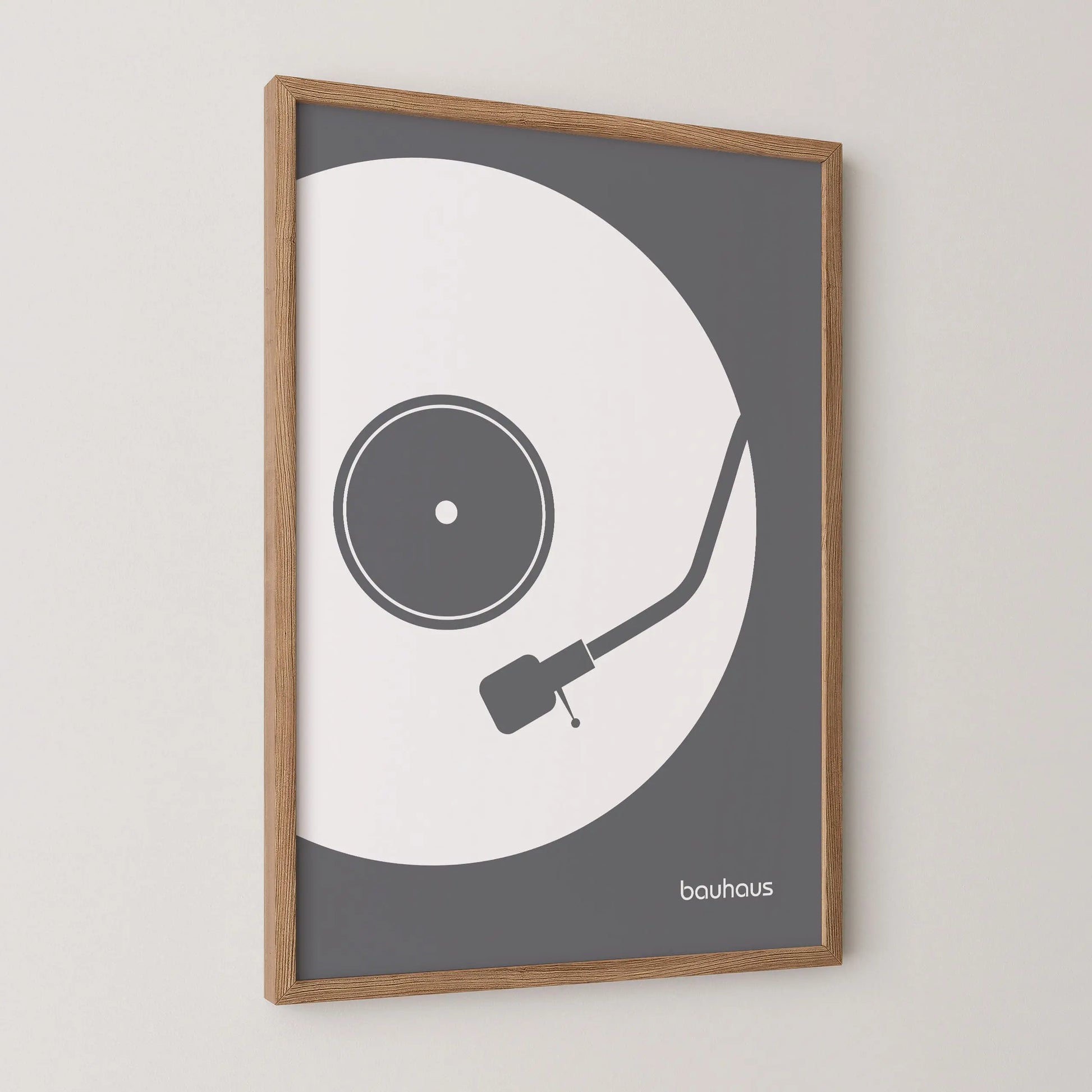 Cette affiche vintage Bauhaus présente une forme circulaire partiellement décentrée vers la gauche, instaurant un déséquilibre visuel maîtrisé. Des lignes angulaires prolongent cette forme vers la droite, dessinant un bras qui structure la composition et oriente le regard. Le jeu de contrastes entre surfaces pleines, vides et tracés linéaires compose une représentation stylisée d’un gramophone.
