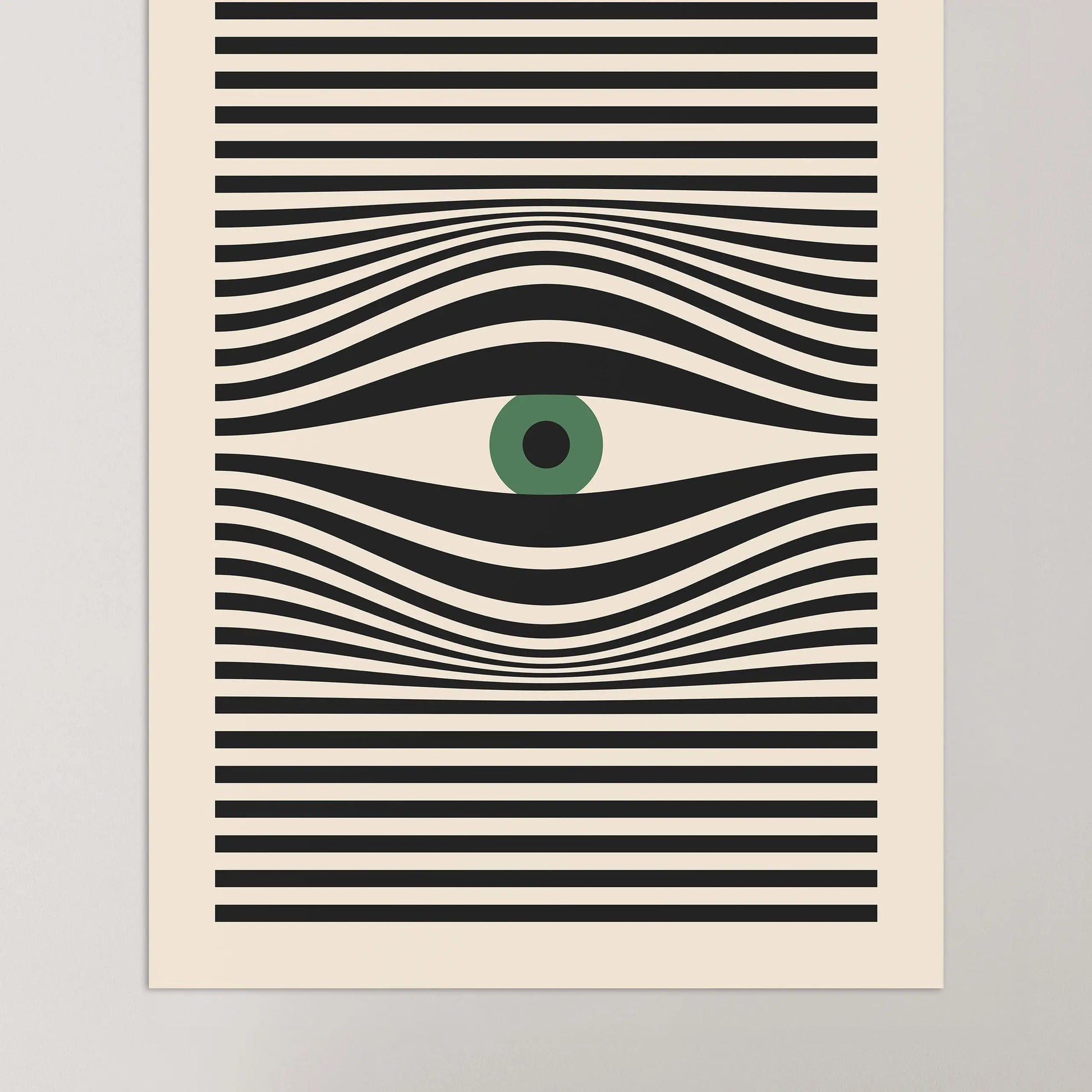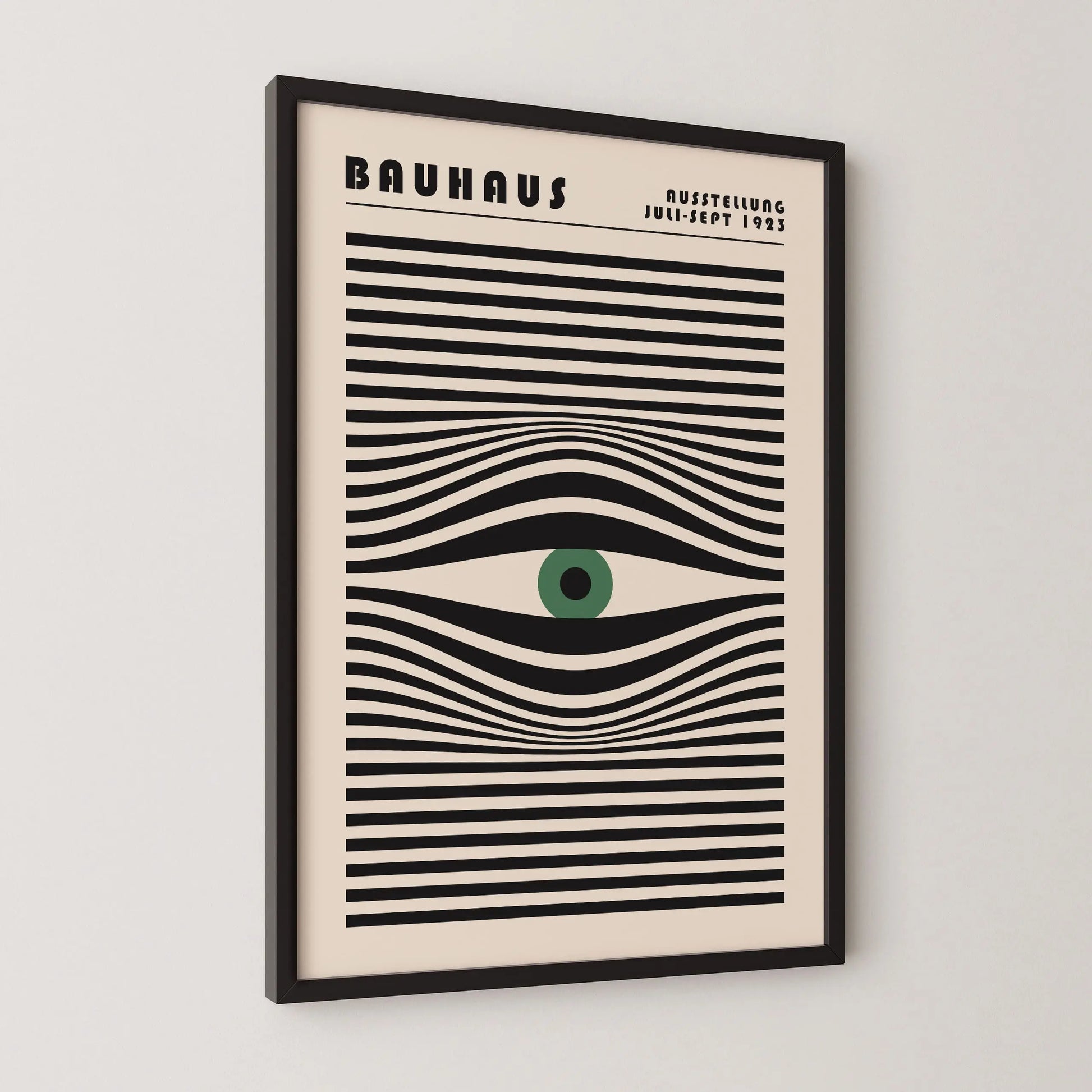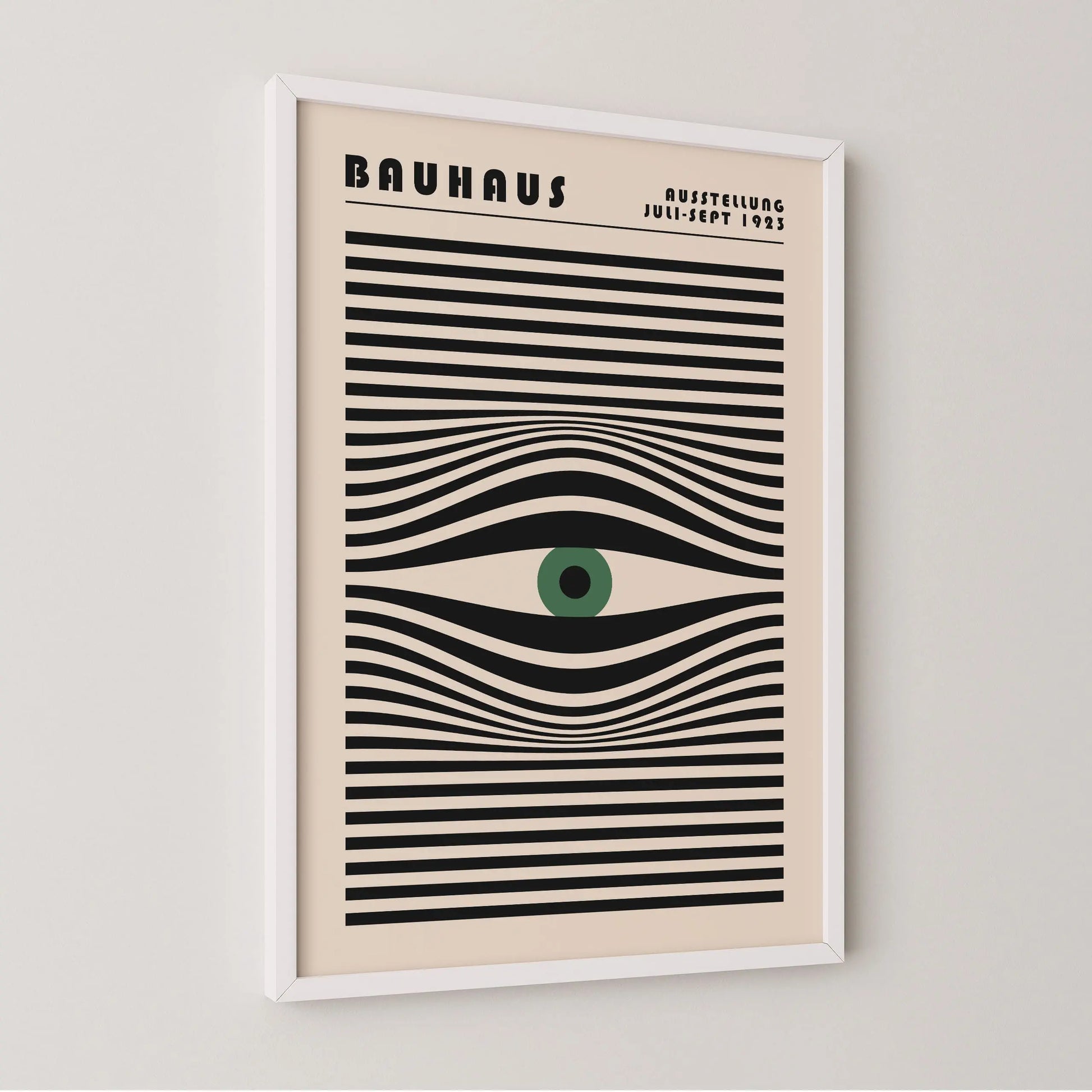 Cette affiche vintage Bauhaus représente un motif composé de lignes horizontales parallèles, dont la déformation progressive au centre crée une forme d’œil stylisé en perspective, avec un cercle en son milieu.