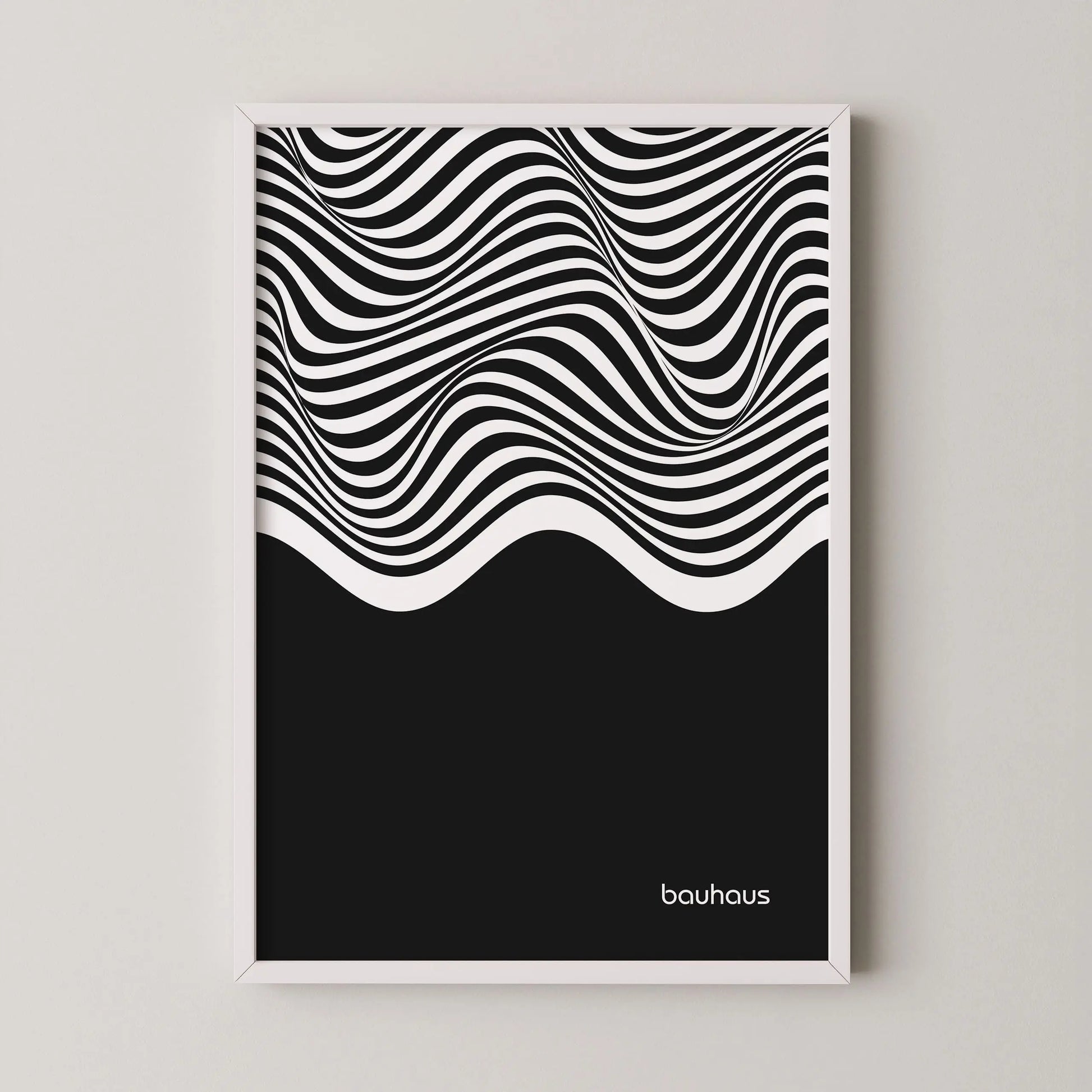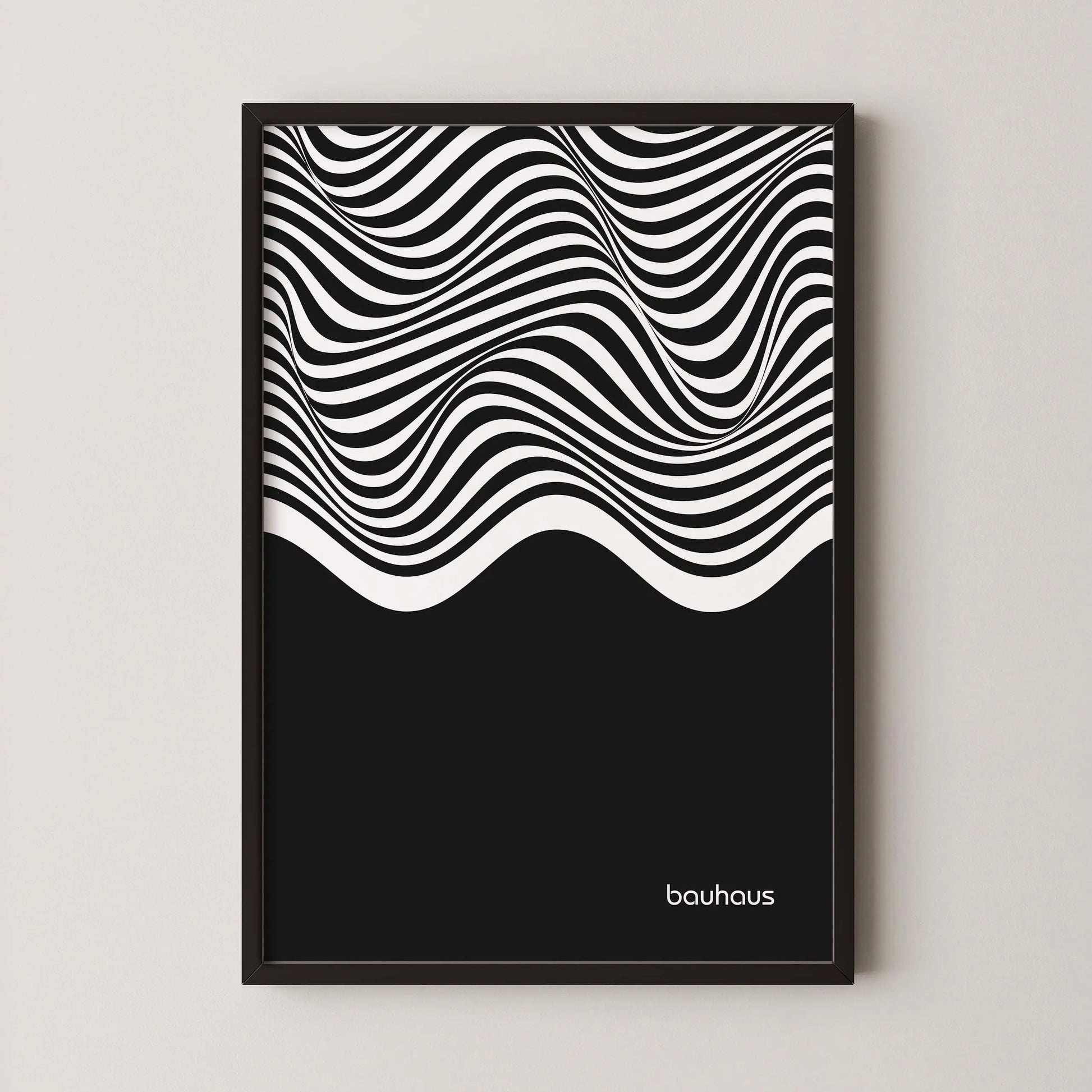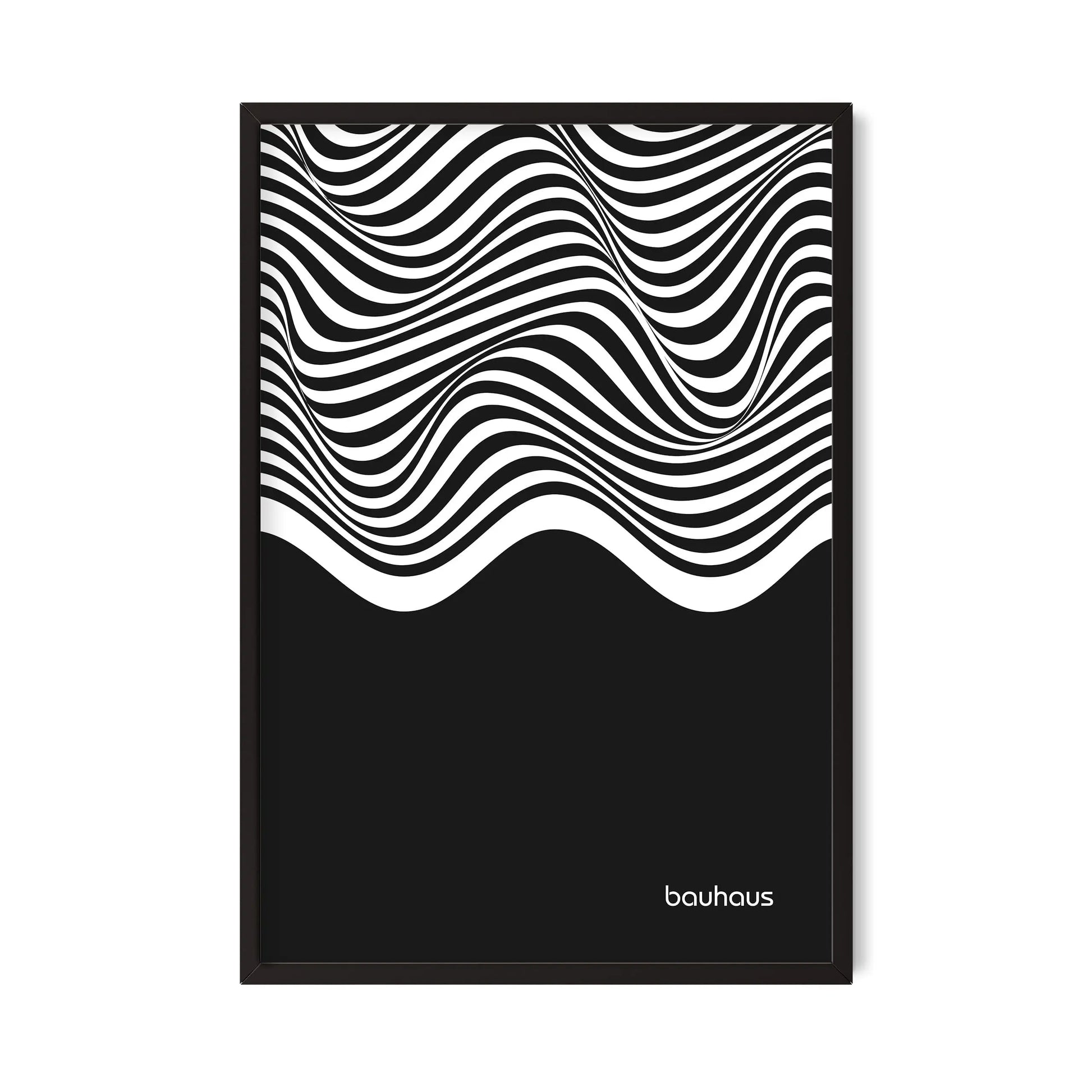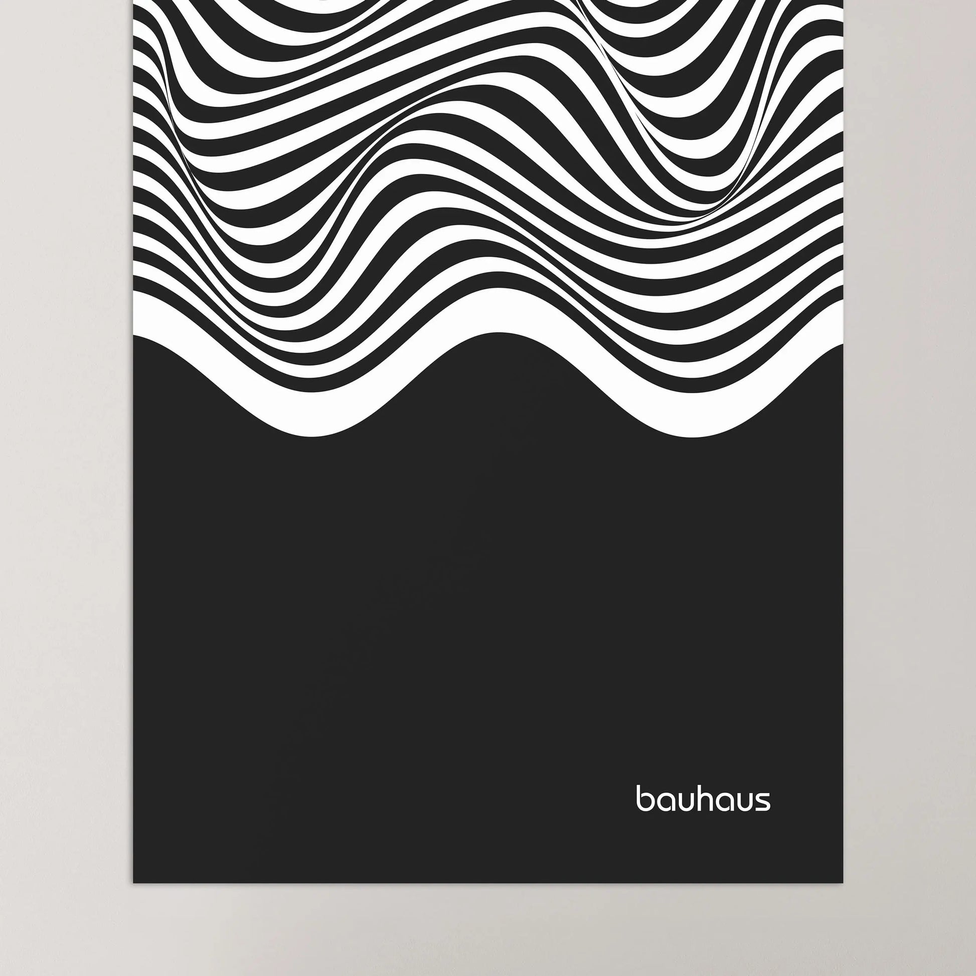 Cette affiche Bauhaus est constituée de lignes ondulées parallèles en contraste, disposées horizontalement et couvrant la partie supérieure de la composition. Ces lignes forment des courbes fluides et continues, générant un effet de mouvement. La partie inférieure est occupée par un aplat noir uniforme, créant un contraste marqué entre zone graphique dynamique et surface pleine.