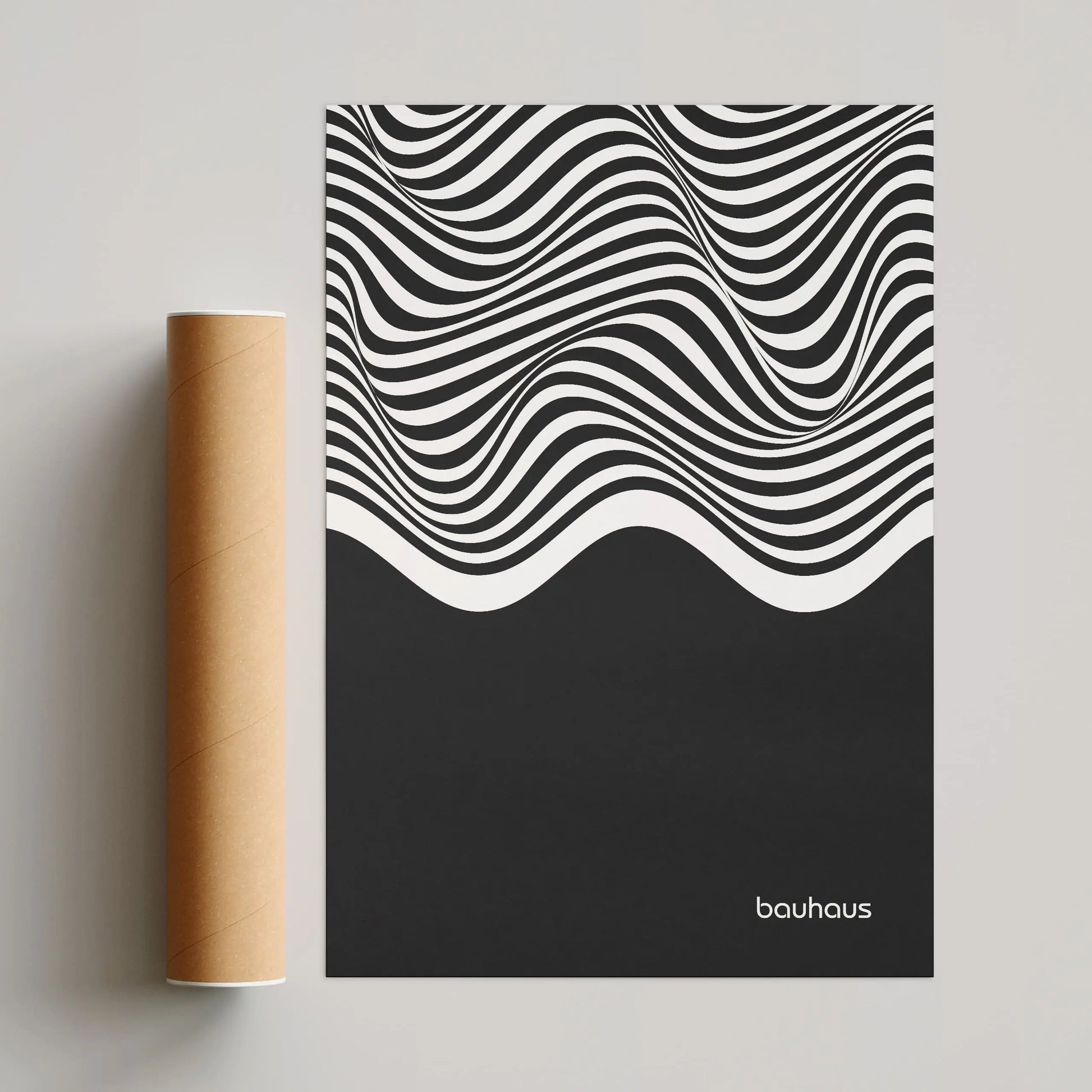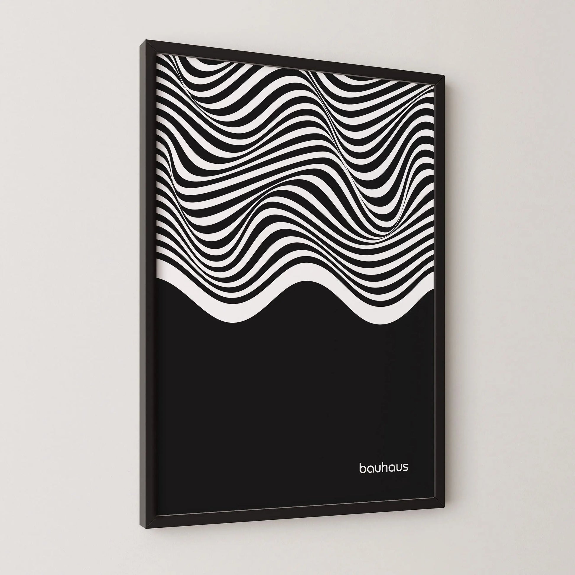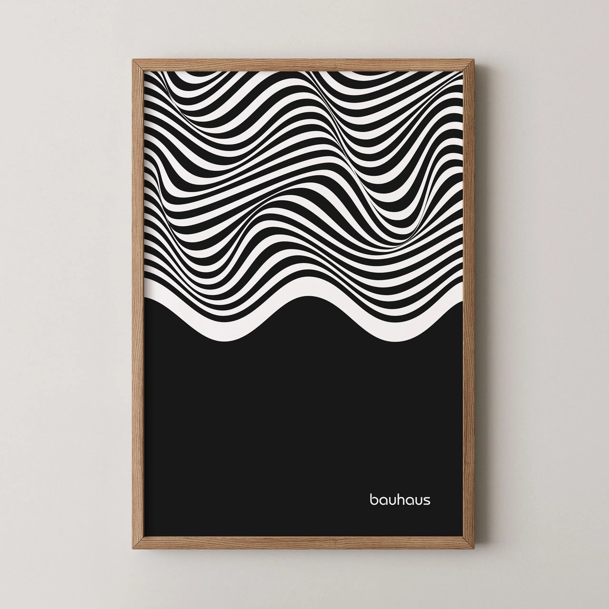 Cette affiche Bauhaus est constituée de lignes ondulées parallèles en contraste, disposées horizontalement et couvrant la partie supérieure de la composition. Ces lignes forment des courbes fluides et continues, générant un effet de mouvement. La partie inférieure est occupée par un aplat noir uniforme, créant un contraste marqué entre zone graphique dynamique et surface pleine.