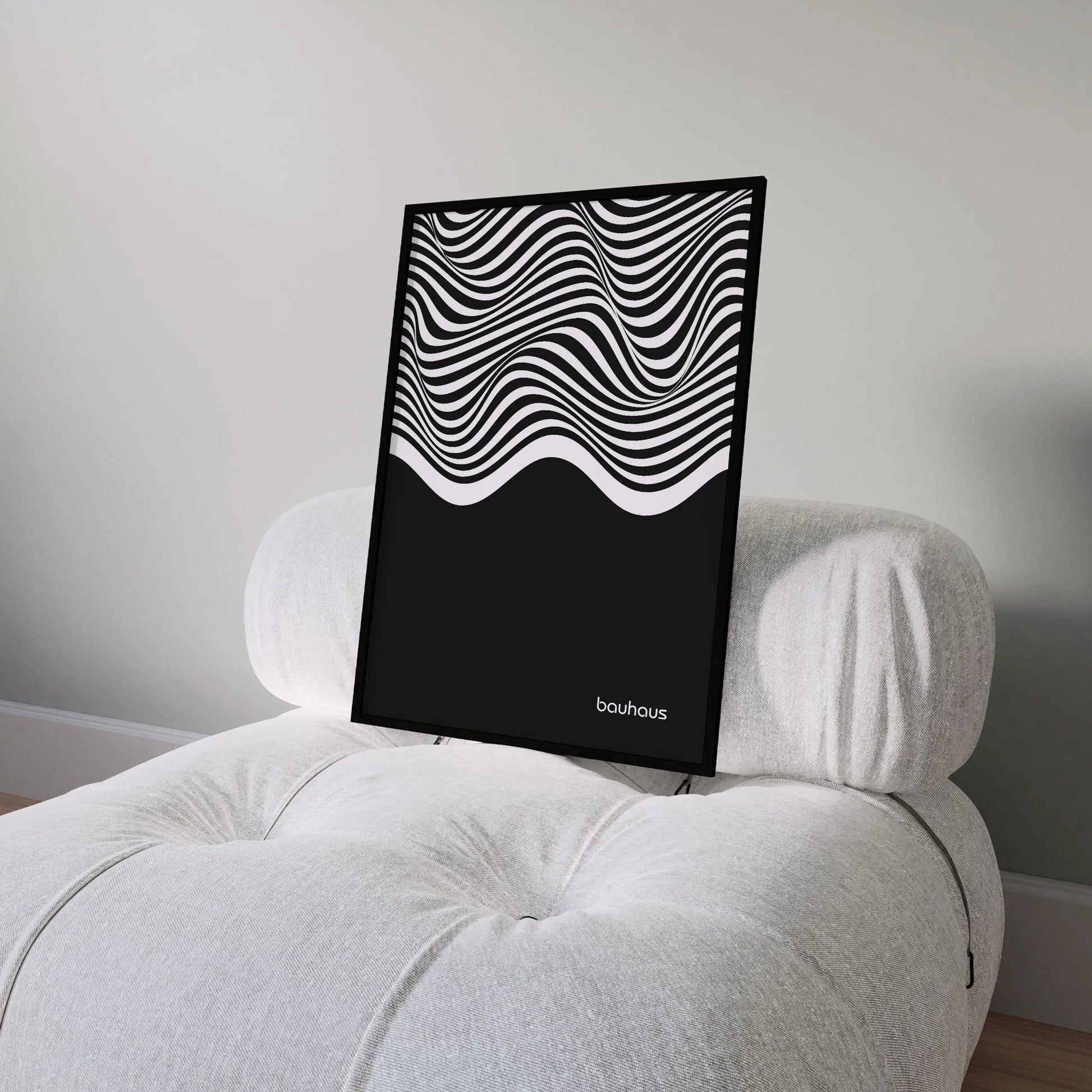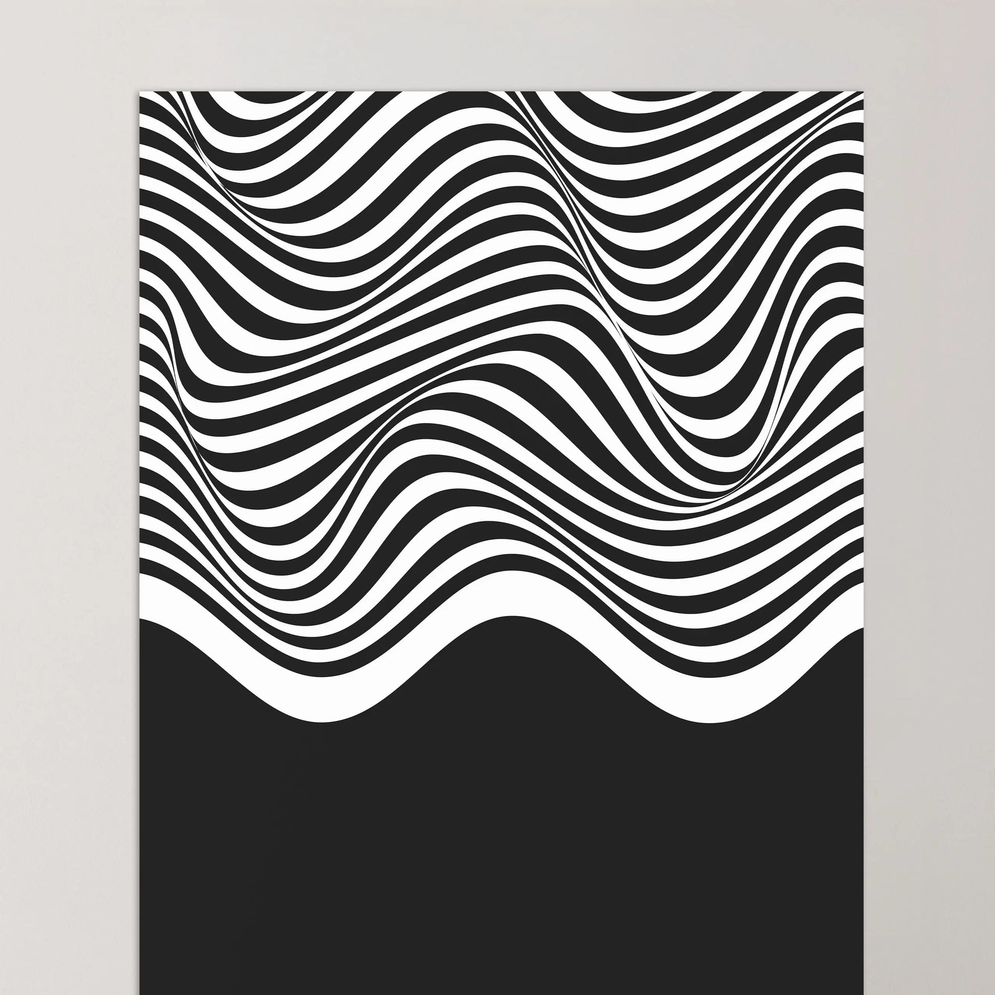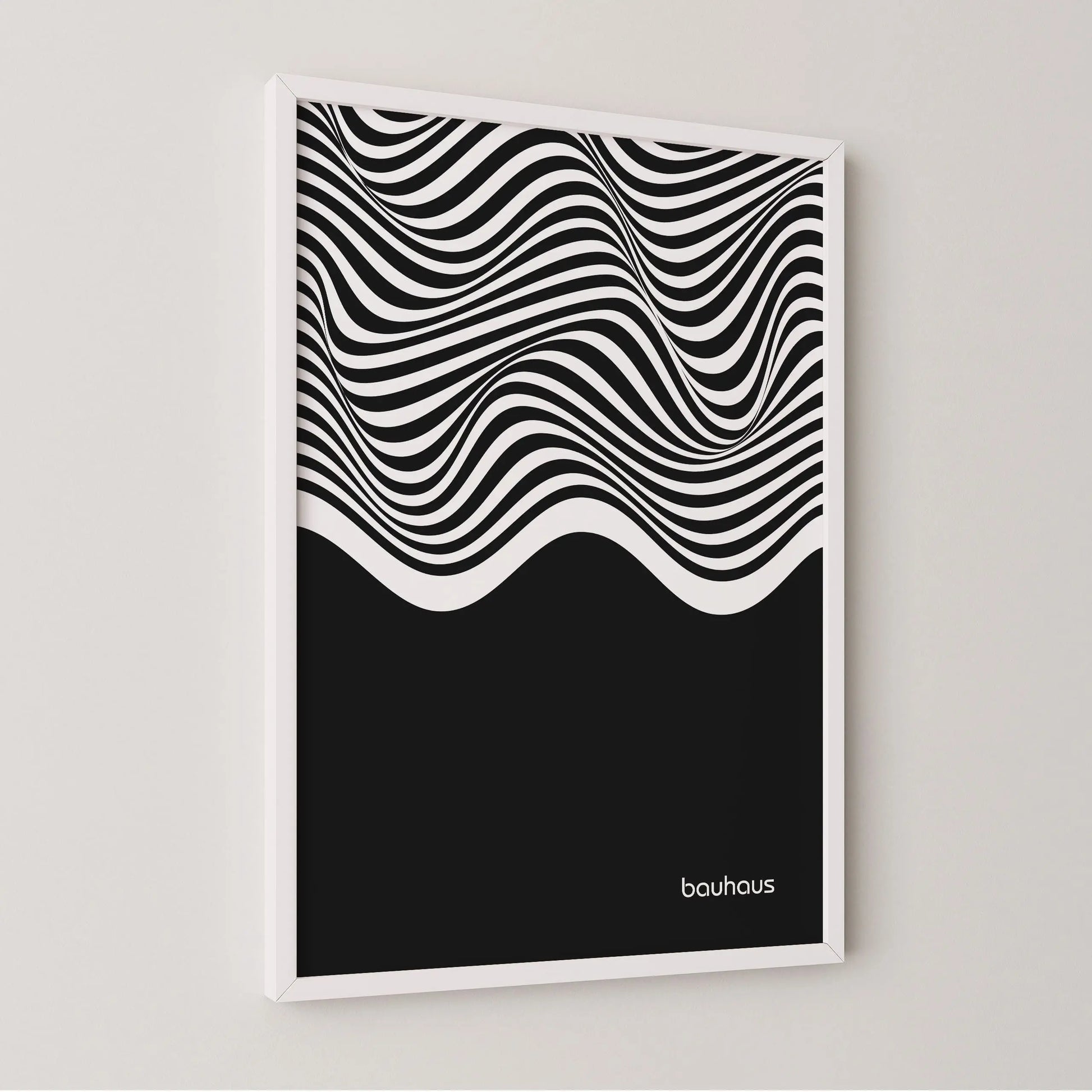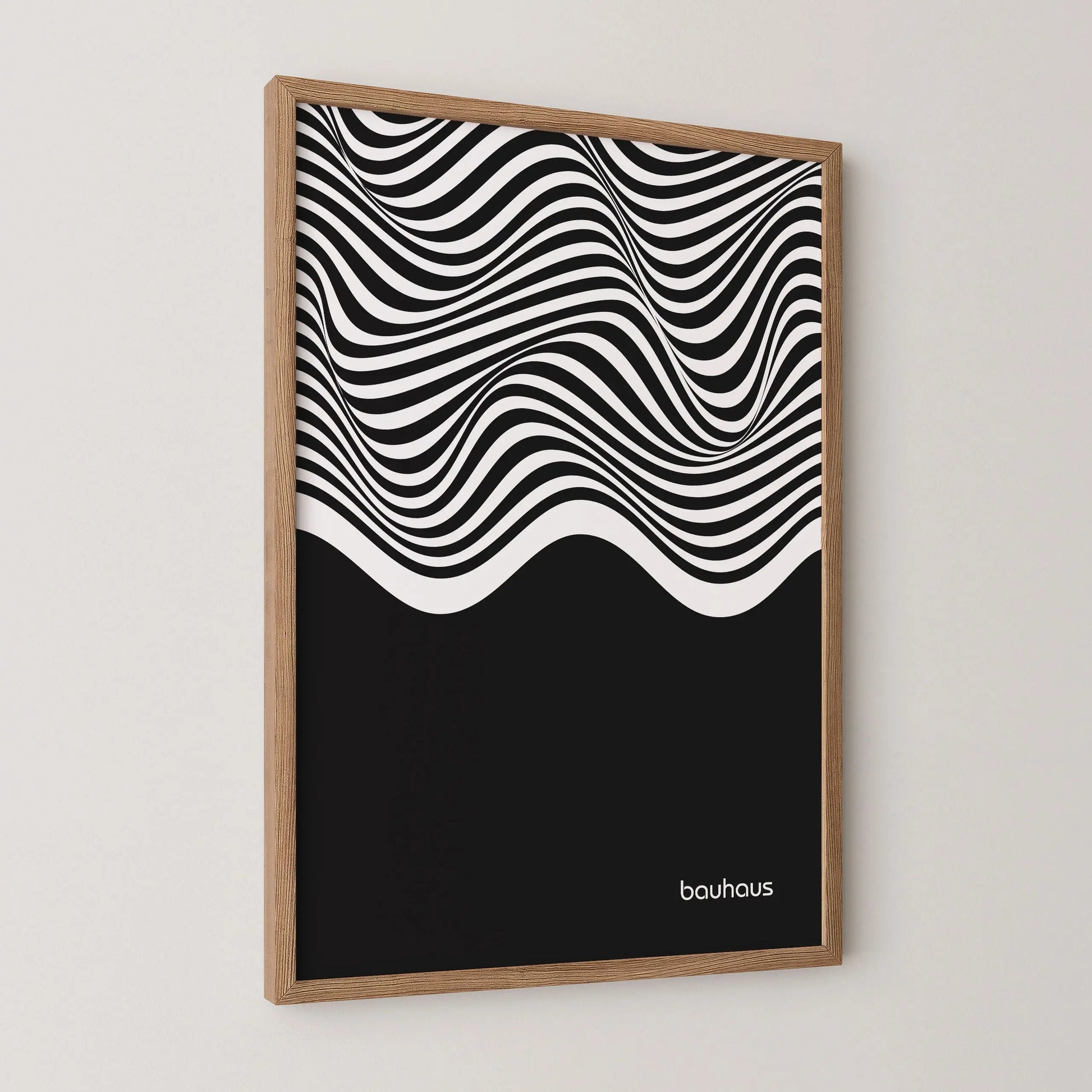 Cette affiche Bauhaus est constituée de lignes ondulées parallèles en contraste, disposées horizontalement et couvrant la partie supérieure de la composition. Ces lignes forment des courbes fluides et continues, générant un effet de mouvement. La partie inférieure est occupée par un aplat noir uniforme, créant un contraste marqué entre zone graphique dynamique et surface pleine.