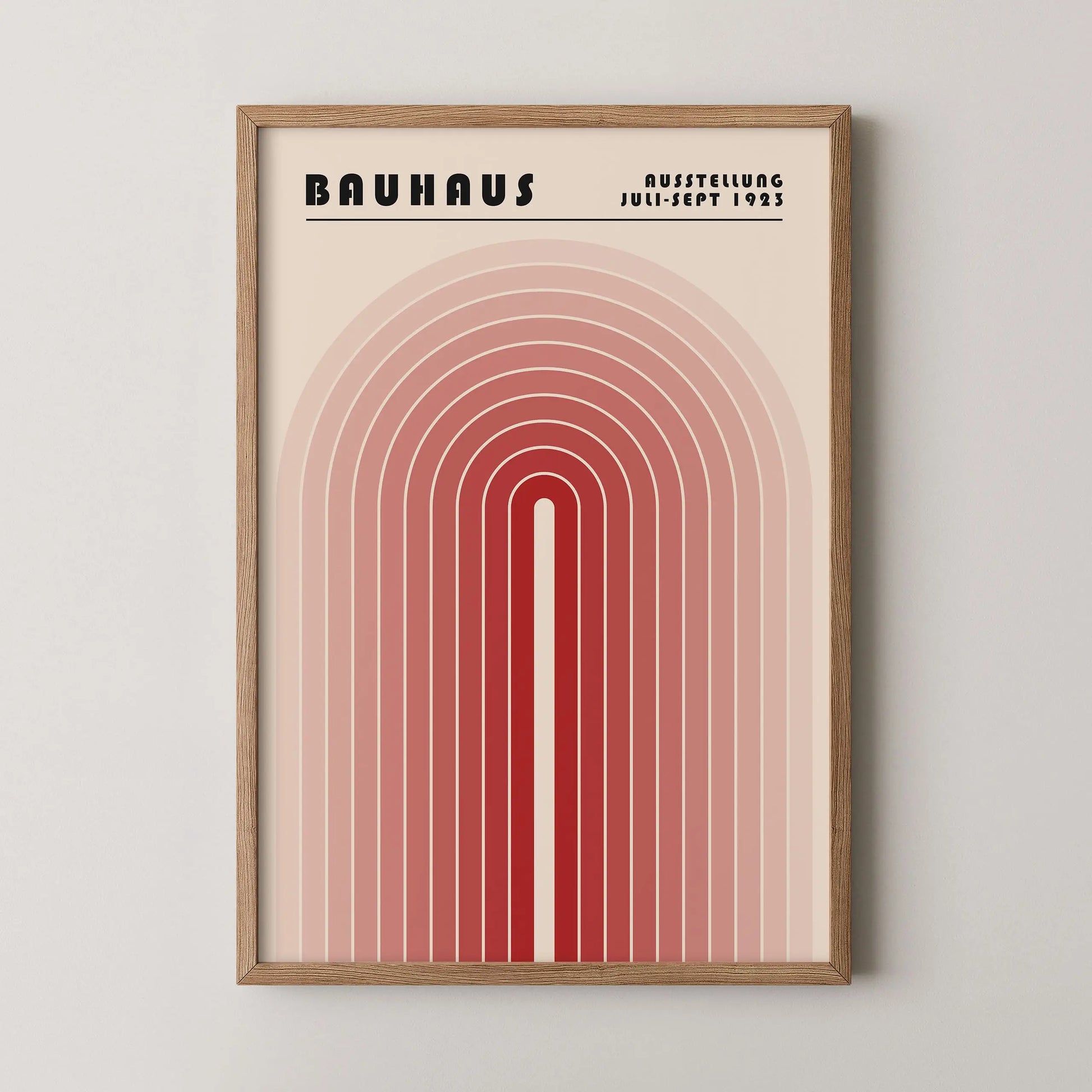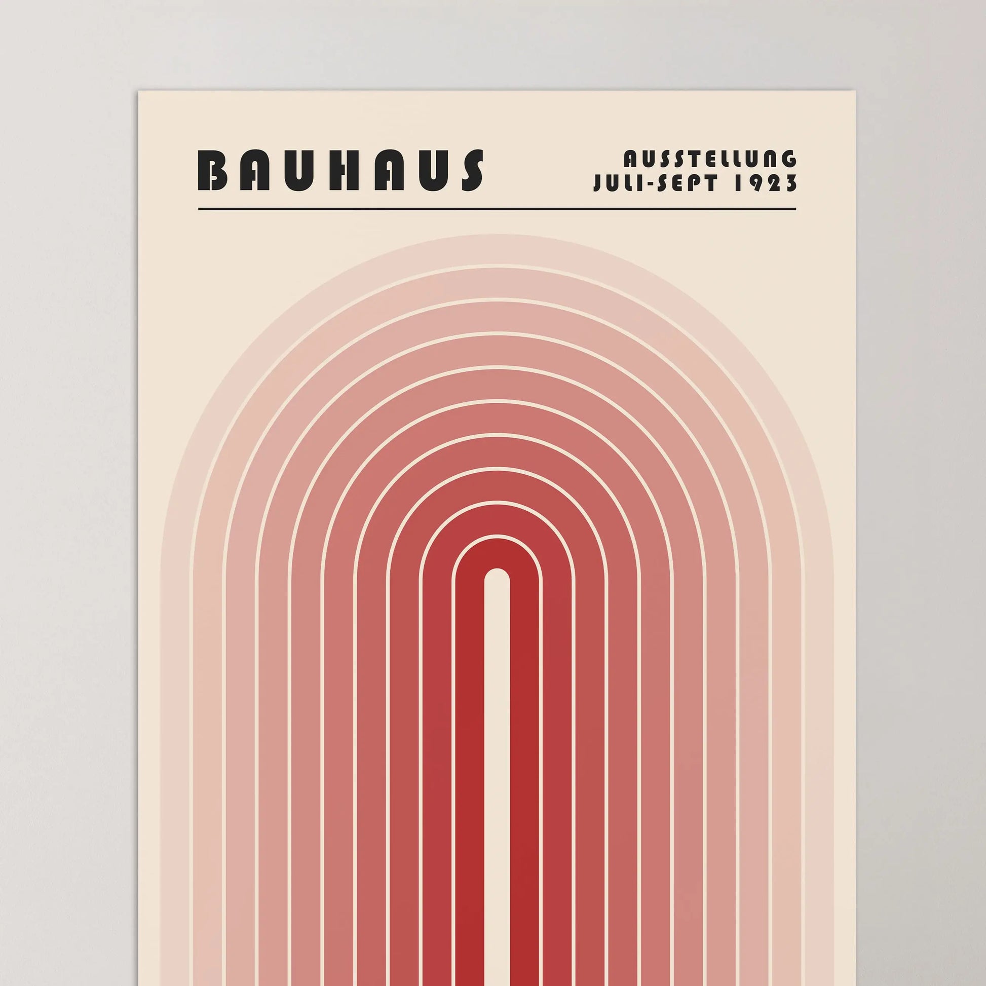 Cette affiche vintage graphique Bauhaus se compose d’une série d’arcs concentriques géométriques, disposés symétriquement autour d’un axe vertical, formant une structure arquée unique avec une ouverture centrale allongée. Les lignes parallèles et régulières aux tons progressivement dégradés, allant de la plus claire au plus sombre, créent un rythme visuel équilibré et une profondeur graphique maîtrisée.